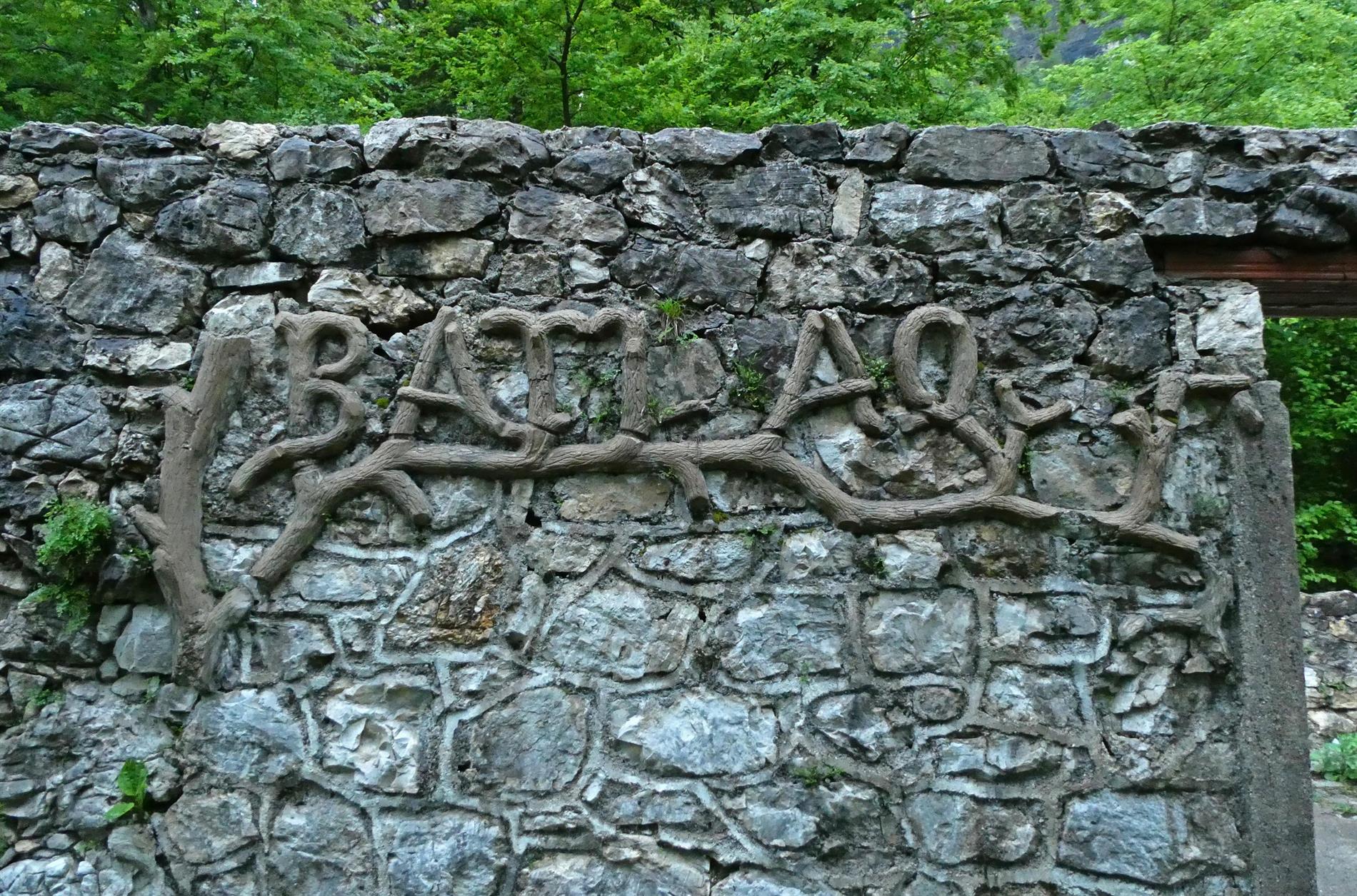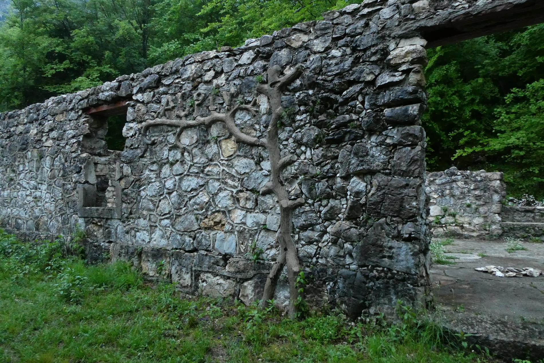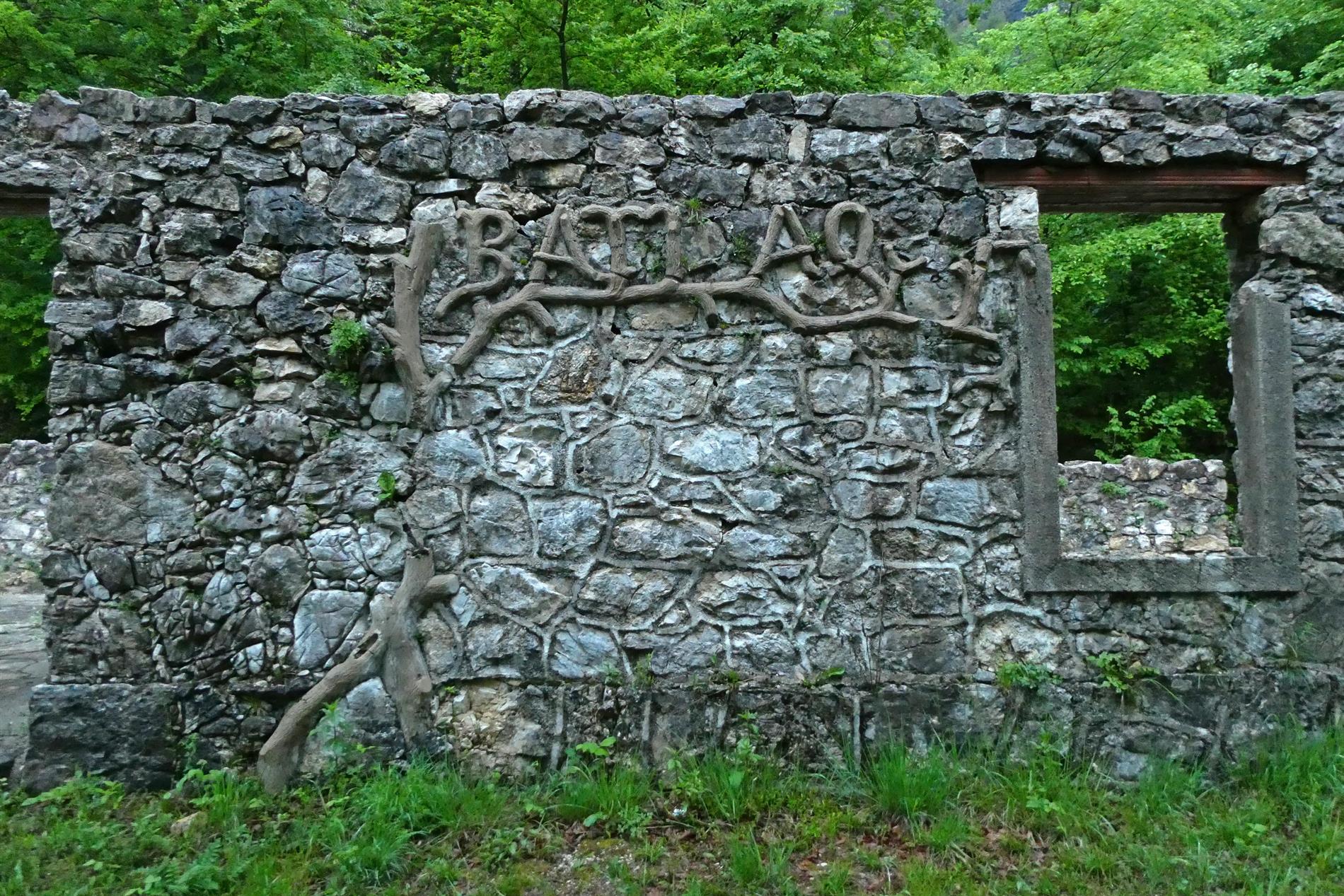 Il pregevole altorilievo realizzato dal Battaglione Alpini Aosta, impreziosito da motivi vegetali, adorna l'ingresso di un vasto edificio adibito a caserma poco sopra la rotabile che collega Ponte Verde al Passo Xomo.