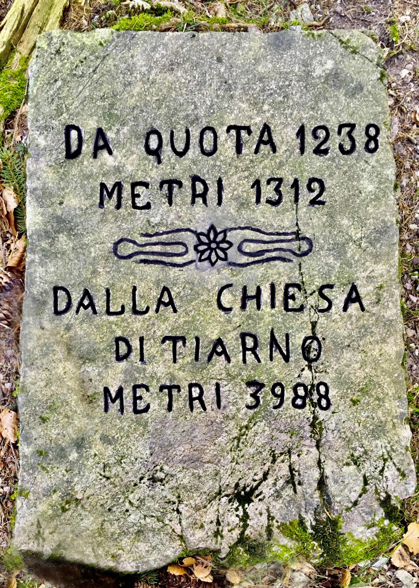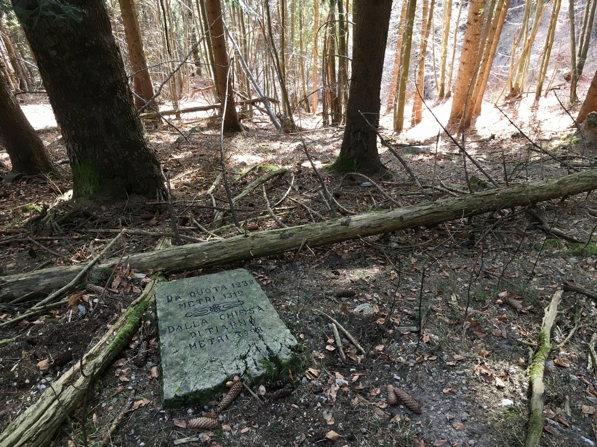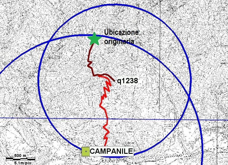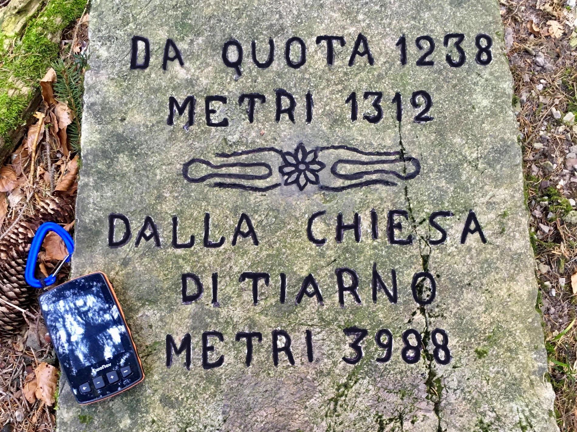 Queste ipotesi sono state poi testate con l’utilizzo di programmi cartografici 3D-GIS e rilievi GPS, per verificarne la corrispondenza con dati riportati sul cippo. Le prime due ipotesi sono state scartate, atteso che i punti ottenuti (tramite l’intersezione di raggi pari alle distanze indicate con cerchi sul piano orizzontale o con sfere nello spazio 3D) presentano tra loro una differenza di parecchie centinaia di metri, evidentemente eccessiva per giustificare il dato metrico inciso. L’ipotesi che ha fornito dati compatibili con quelli riportati dal cippo è quella delle distanze di percorrenza sui sentieri e mulattiere di collegamento: la zona dove si è intuitivamente ipotizzato fosse in origine collocata la pietra - la testata del vallone - si trova infatti a 1301 metri di percorrenza da Quota 1238 ed a 3984 metri partendo dal campanile di Tiarno di Sotto, seguendo i tragitti militari ancor oggi riconoscibili, con uno scarto nell'ordine di 10 metri circa.