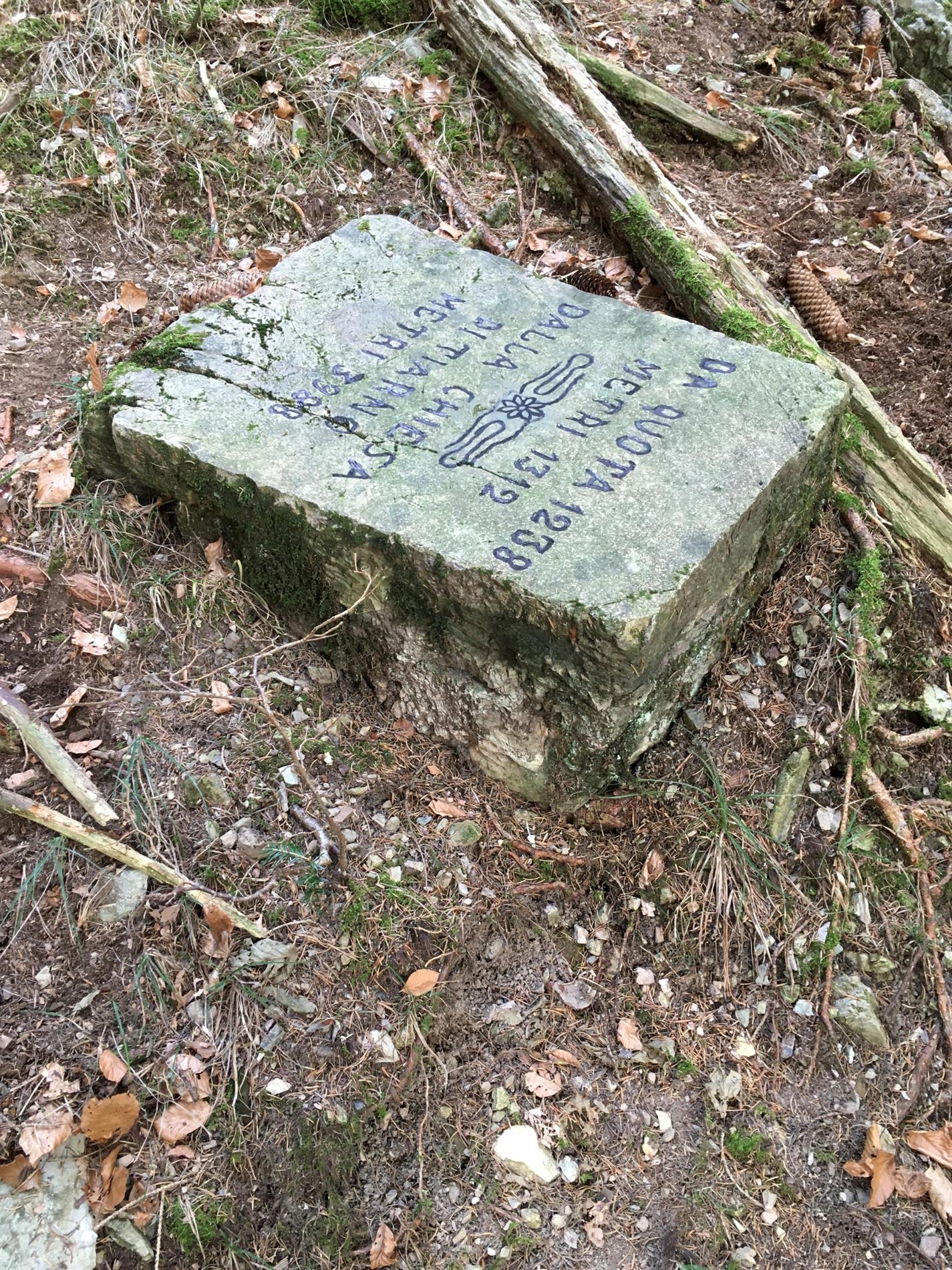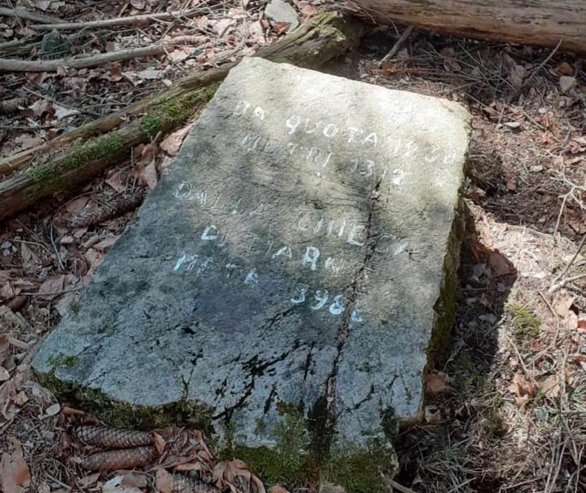 La particolare epigrafe - incisa su una grande pietra squadrata a forma di cippo - è stata rinvenuta al suolo lungo un impervio vallone che scende da versante nordorientale del Monte dei Pini, evidentemente in un luogo diverso da quello in cui era in origine posizionata.