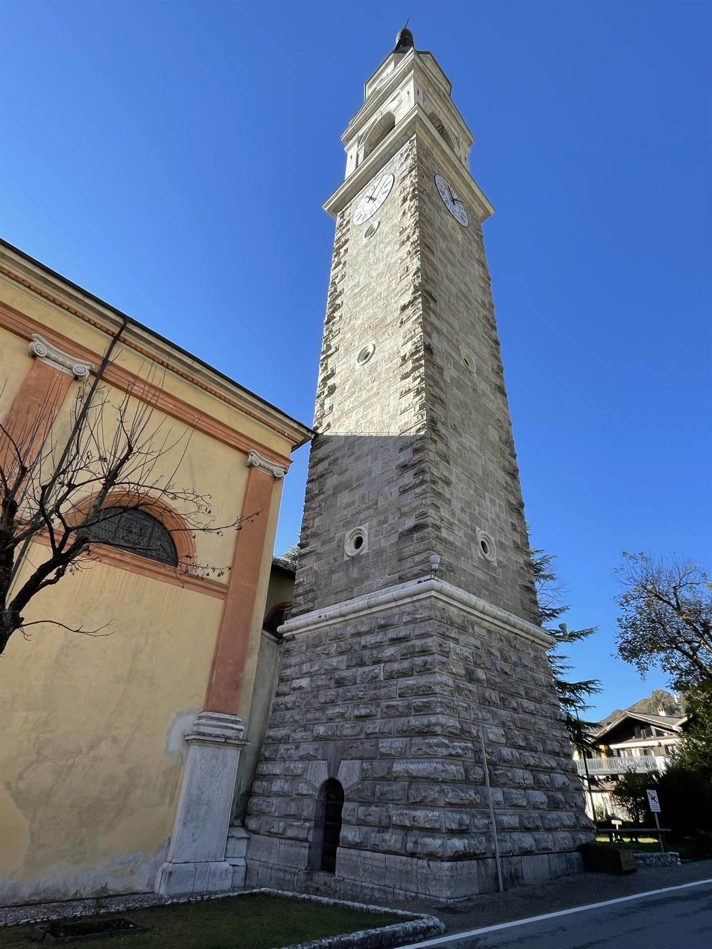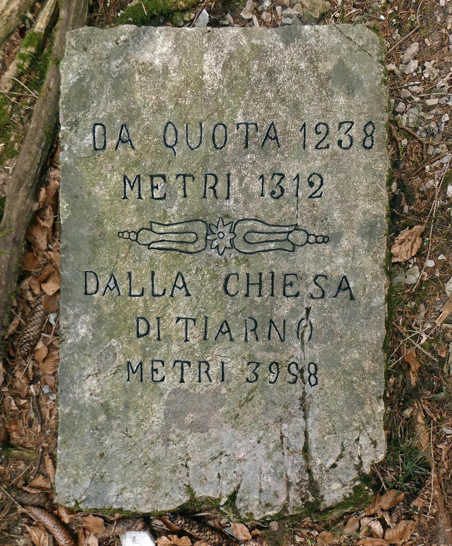 Il cippo riporta infatti due riferimenti topografici, accompagnati dalla relativa indicazione metrica: a 1312 metri di distanza la Quota 1238, che corrisponde al dosso fortificato a sud ovest della cima del Monte dei Pini, nei pressi dell'omonima sella; e a 3988 metri la Chiesa di Tiarno, il cui campanile costituiva il più alto di tutta la Val di Ledro e per questa ragione era utilizzato, fin dalla sua costruzione nel 1861, come punto geografico e cartografico di riferimento.