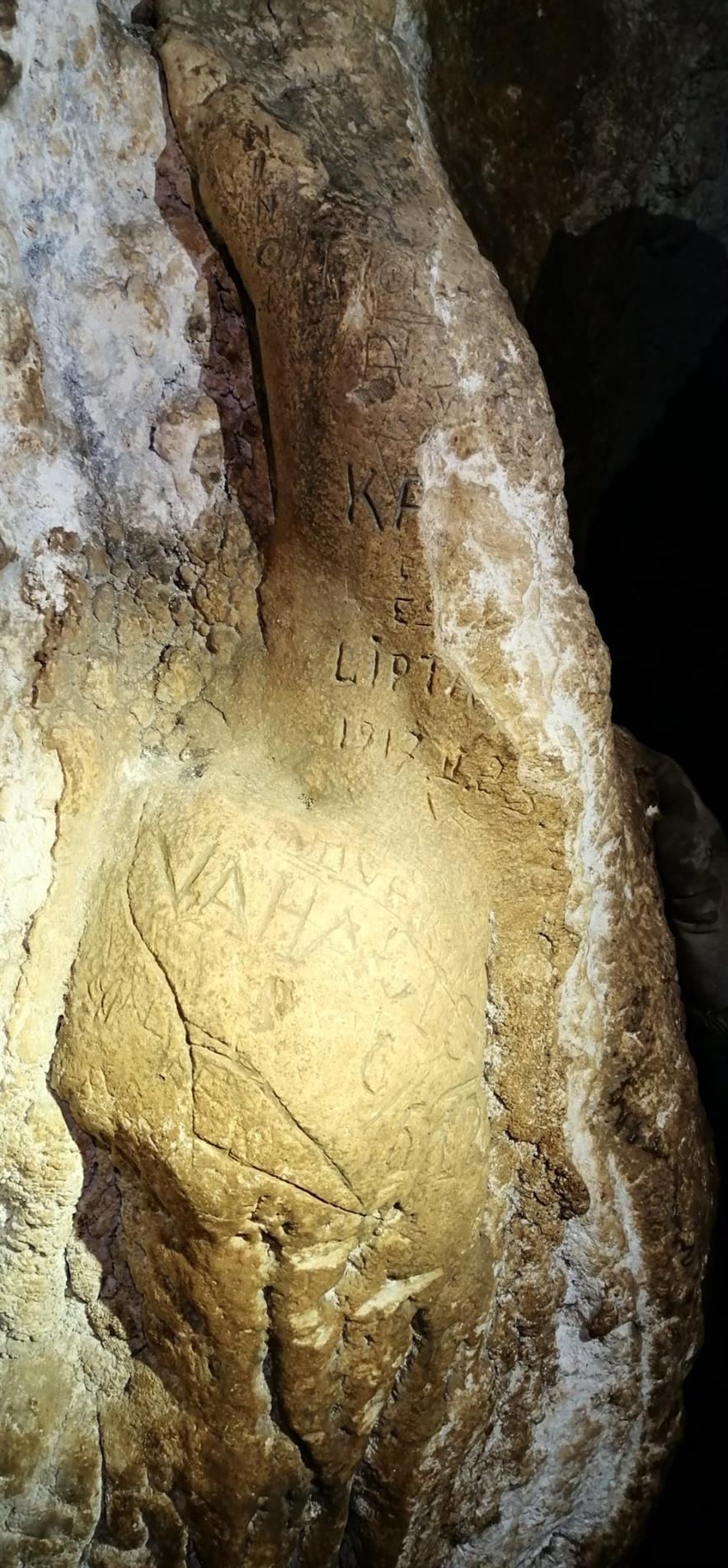 Le iscrizioni riportano alcuni nominativi di militari austro-ungarici di origine slovena (come testimonia l'analisi dei cognomi), affiancati dalle indicazioni di data afferenti al primo semestre del 1917. Trovandosi nell'area della grotta raggiungibile senza particolari tecniche speleologiche, è probabile si tratti di soldati impiegati nei lavori di adattamento della cavità, oppure di uomini che ebbero a stazionare all'interno della stessa.