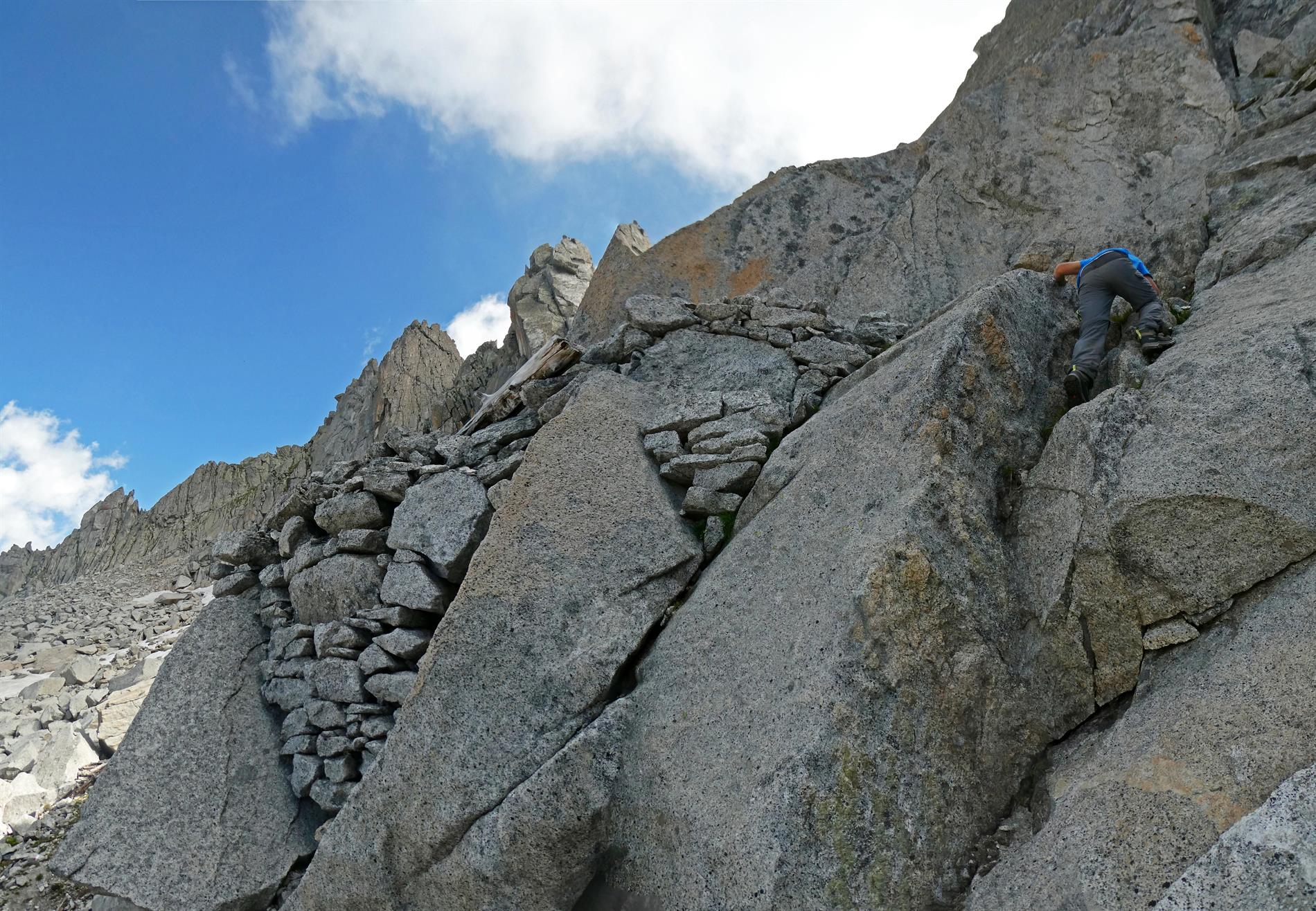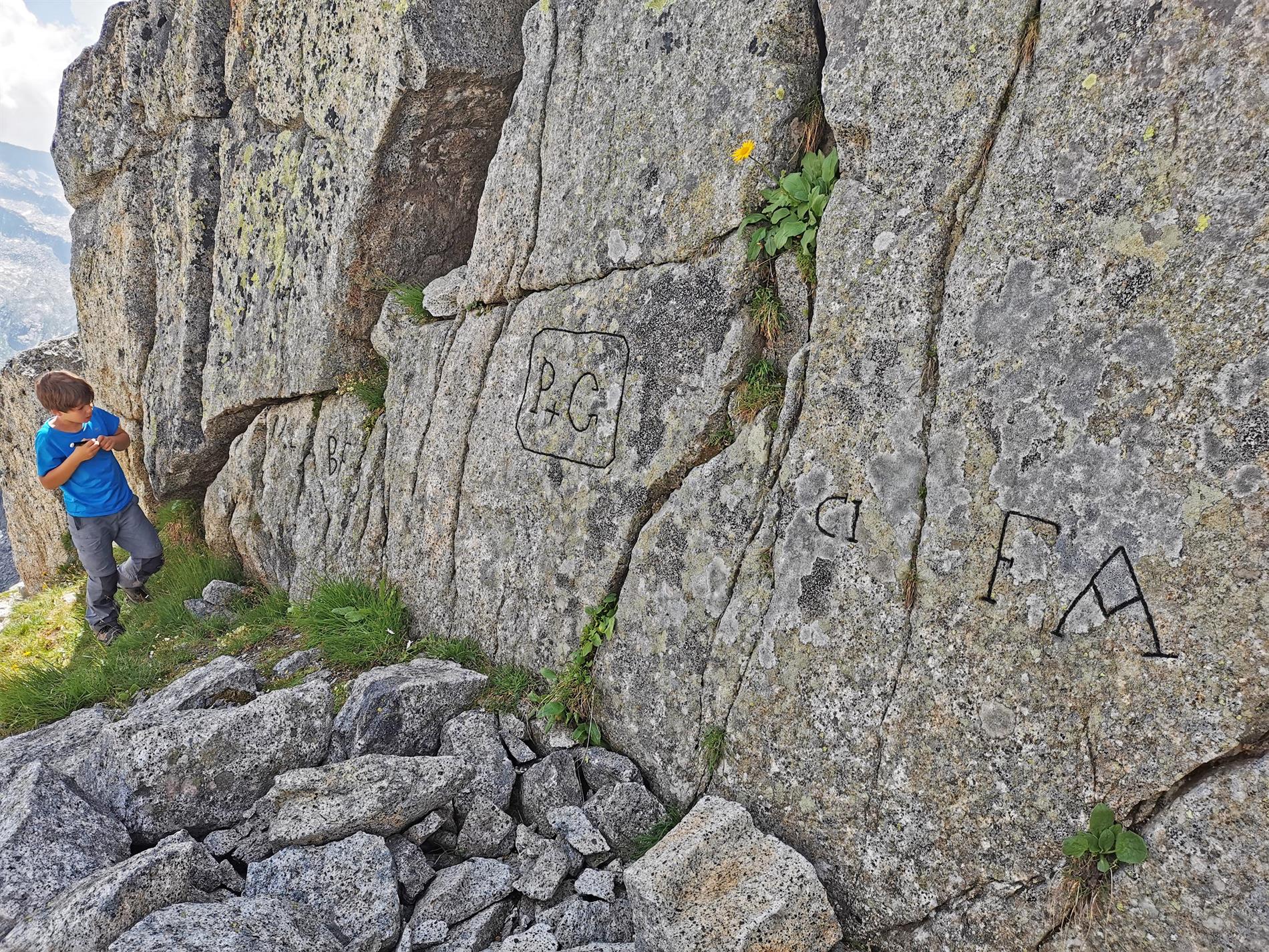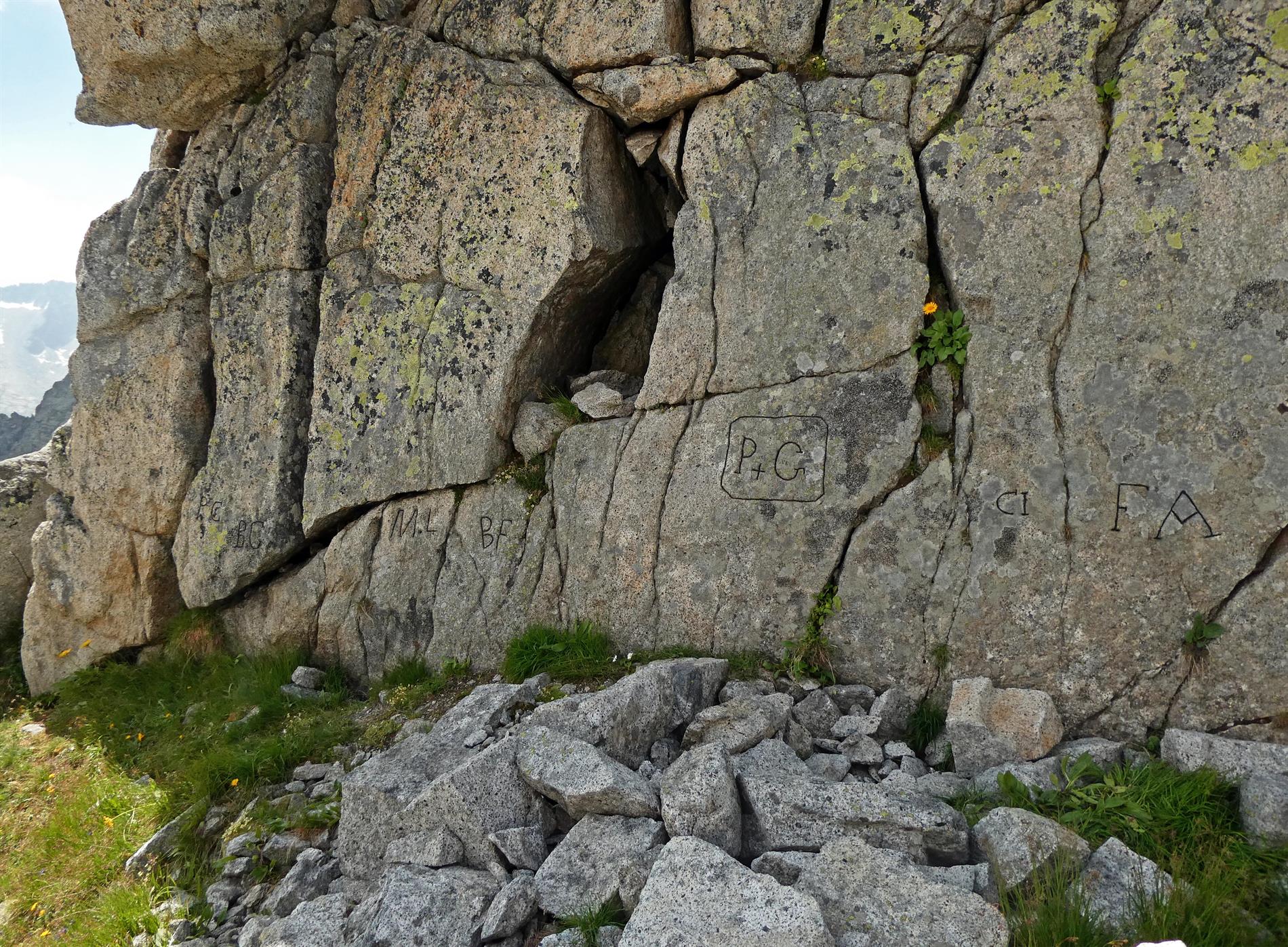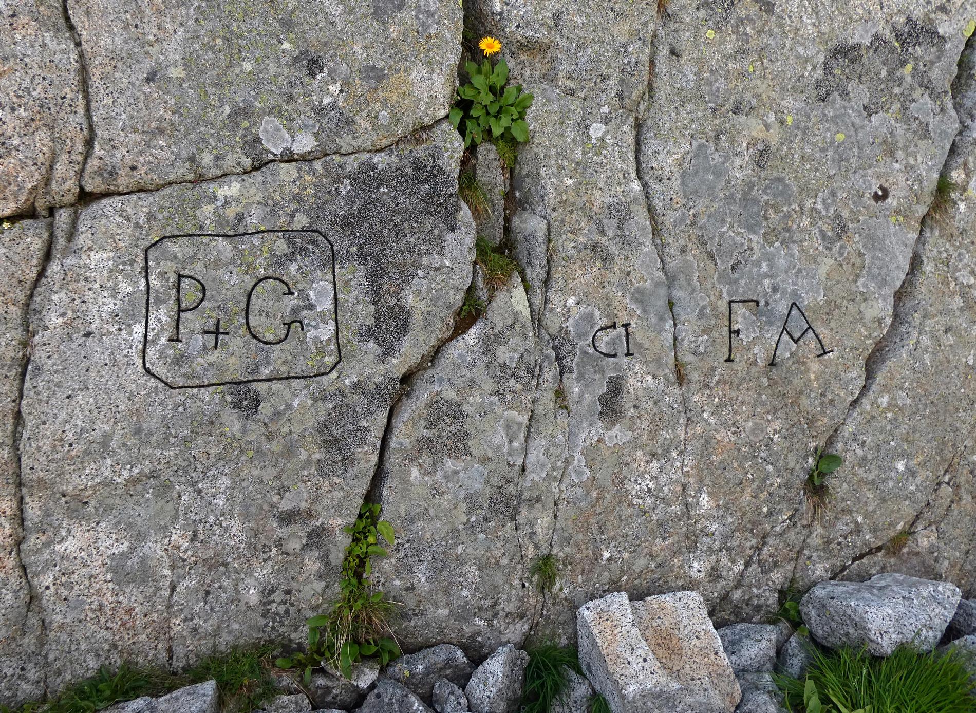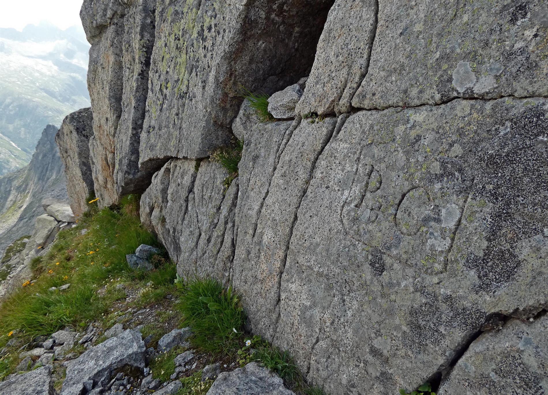 Le numerose incisioni presenti lungo la parete meridionale del Passo Porta di Buciaga non sono accompagnate da una data o da altri elementi che ne consentano una sicura attribuzione al periodo bellico. Tuttavia, alcune particolarità grafiche (ad es., i "piedi" delle aste verticali, il tratto orizzonale della A spezzato, i tratti orizzontali a chiusura della C), in uso nel periodo di interesse, rendono verosimile che le incisioni siano state realizzate dai militari italiani che presidiavano il passo.