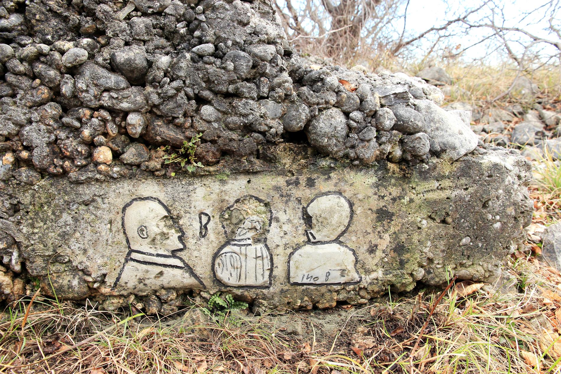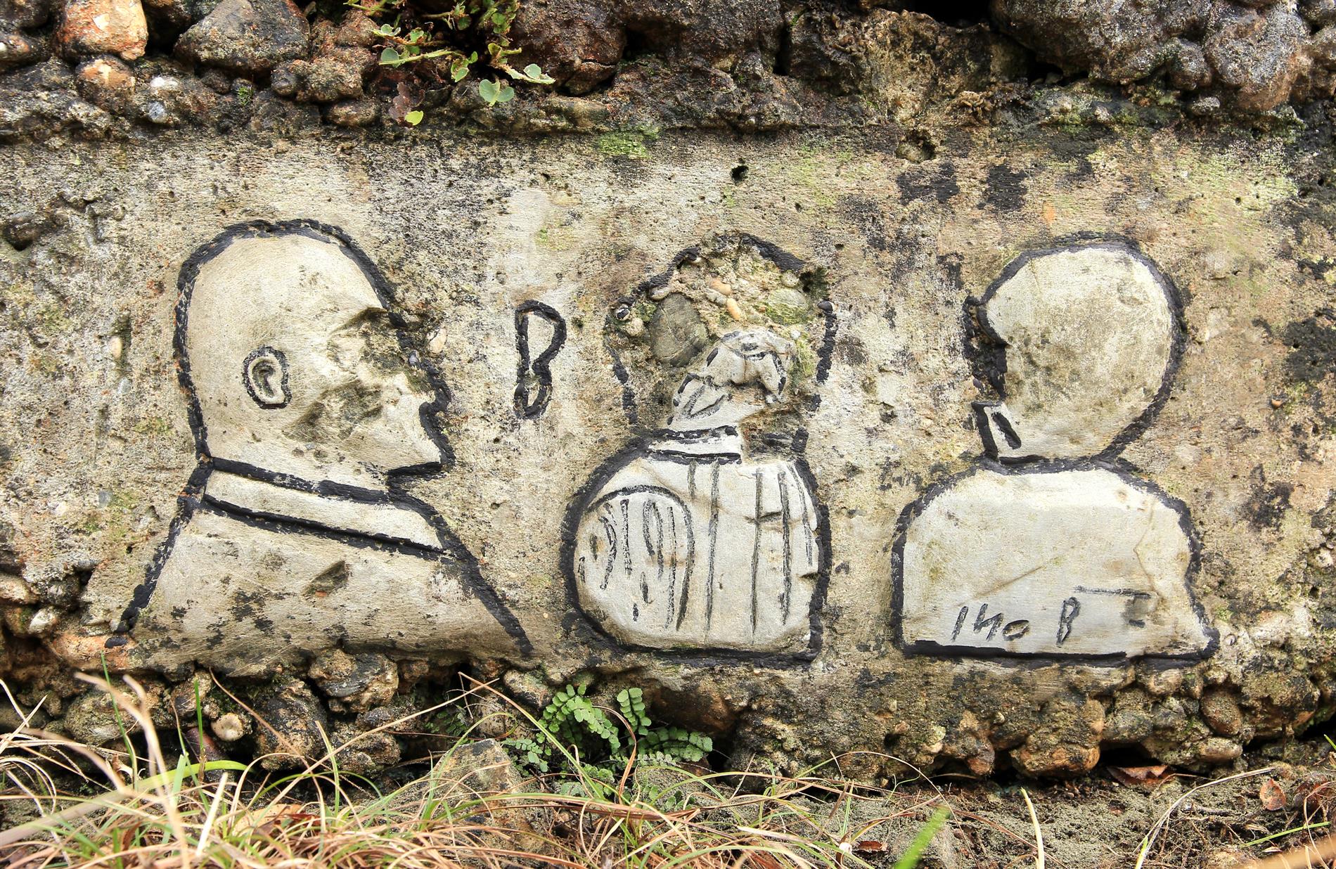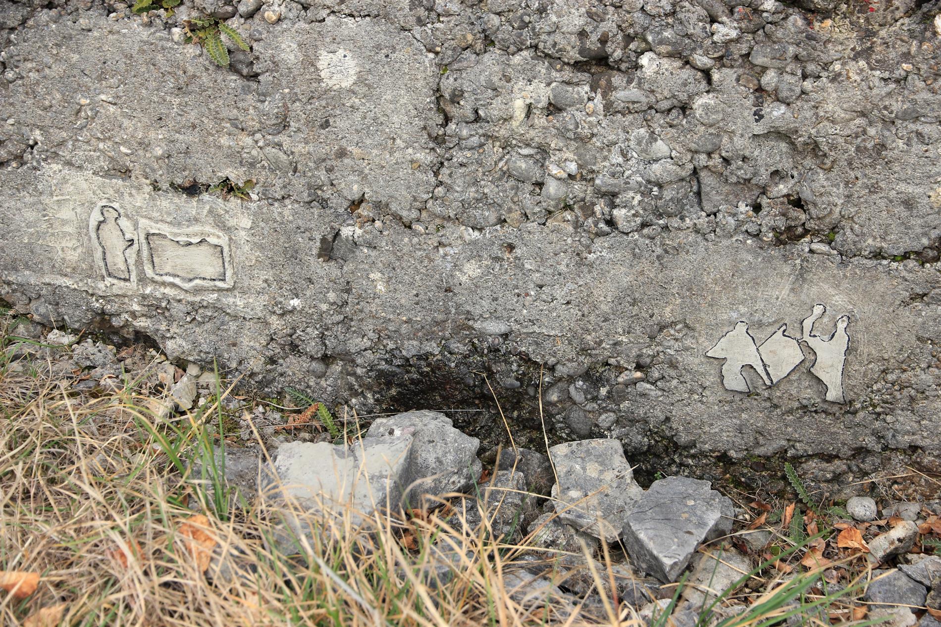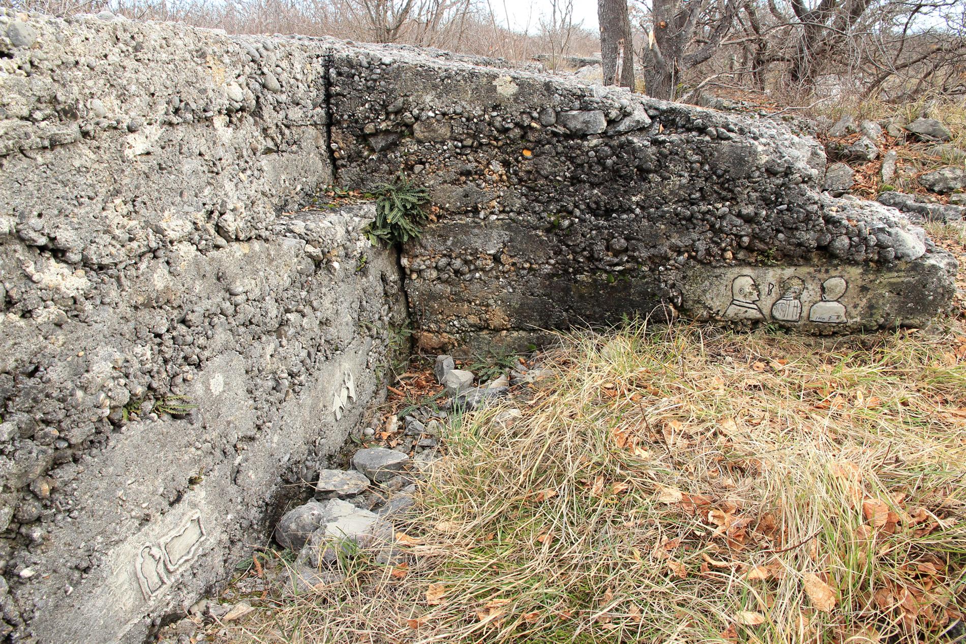 Gli elementi epigrafici in parola si trovano all'interno della trincea rafforzata in cemento che, fra l'ultima decade del luglio 1915 (Seconda Battaglia dell'Isonzo, fase che portò alla conquista italiana della posizione) e la prima decade dell'agosto 1916 (Sesta Battaglia dell'Isonzo, evento a cui conseguì la progressione italiana per alcuni chilometri nell'entroterra carsico, fin oltre il Vallone), costituì l'asse fondamentale del sistema trincerato avanzato tenuto dal Regio Esercito lungo il ciglione che del Monte Sei Busi digrada verso le Alture di Vermegliano. Successivamente e fino alla ritirata italiana conseguita allo sfondamento austro-tedesco di Caporetto, scattata sul Carso il 27 ottobre del 1917, la trincea ospite venne coinvolta nel sistema fortificato arretrato della Linea di San Martino.