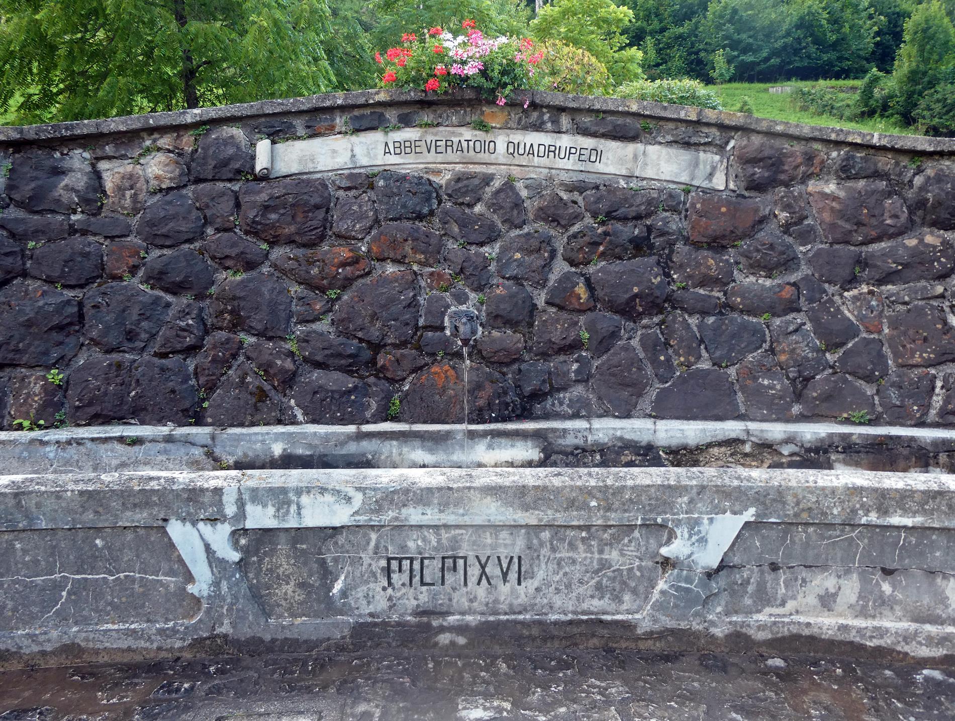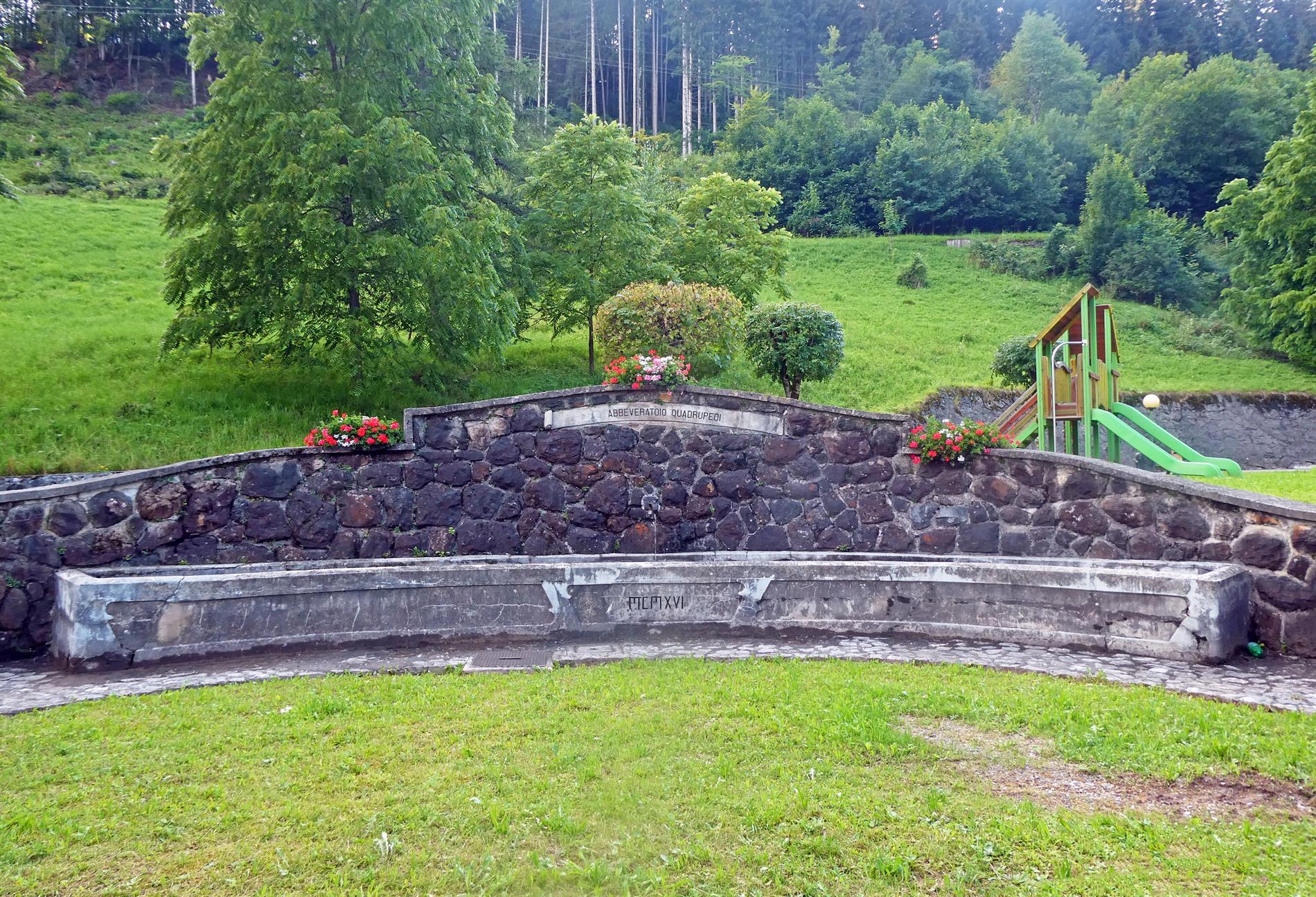 La targa-cartiglio centrale e un'incisione sulla vasca evidenziano la data di costruzione (l'anno 1916) e la natura del pregevole impianto idrico, ossia quella di punto di sosta per l'abbeveramento dei quadrupedi (muli, cavalli, buoi...) impiegati nell'alta Val Degano.