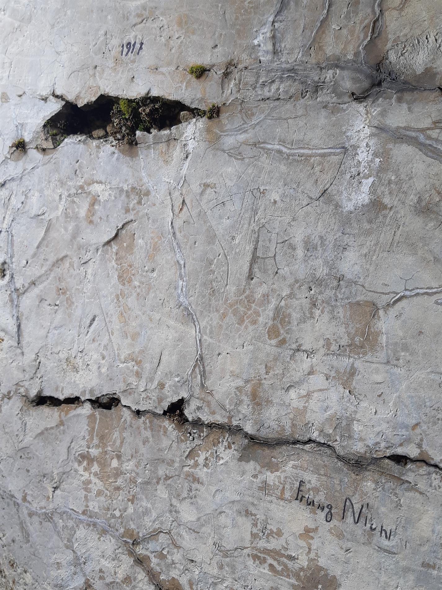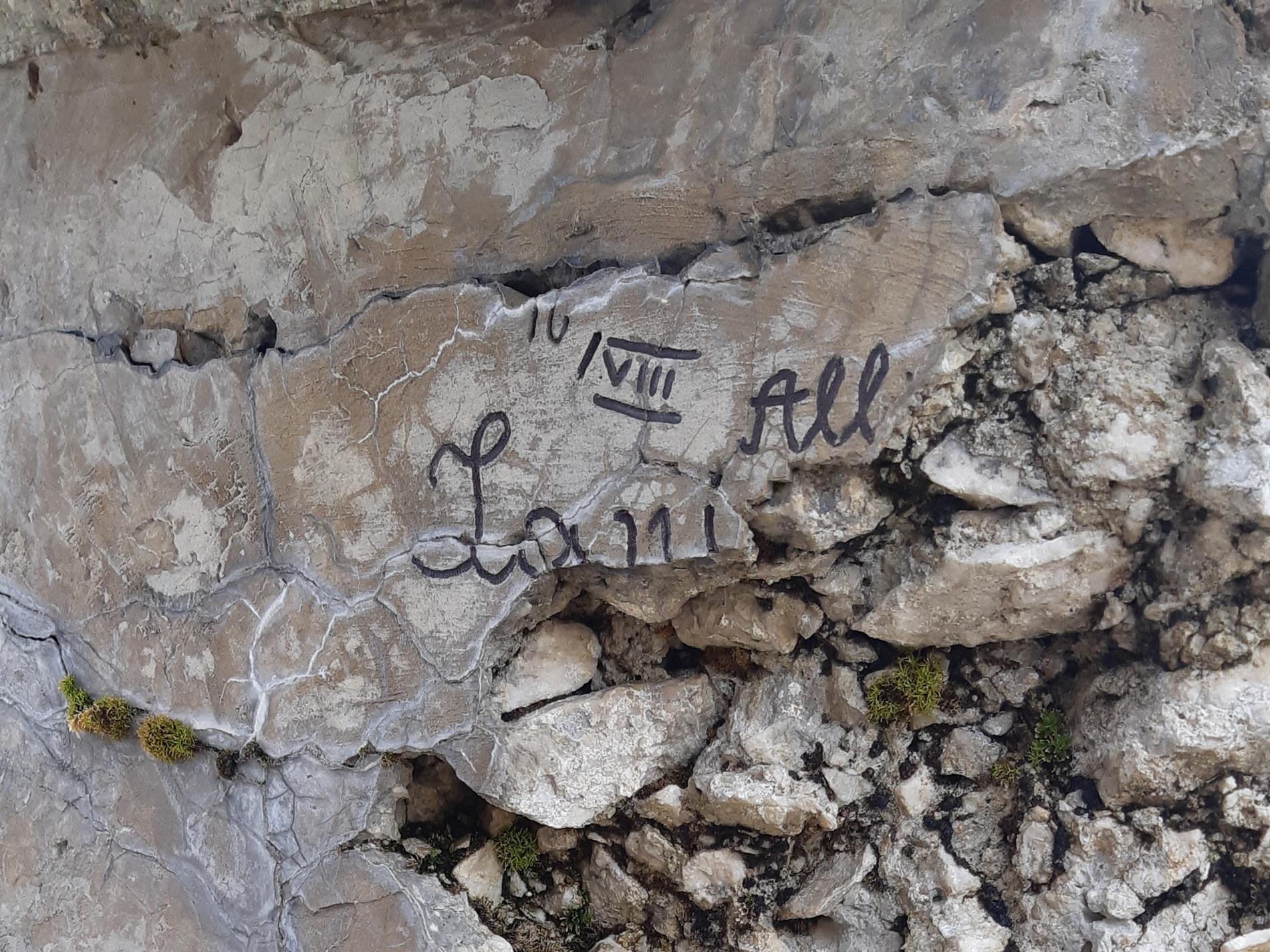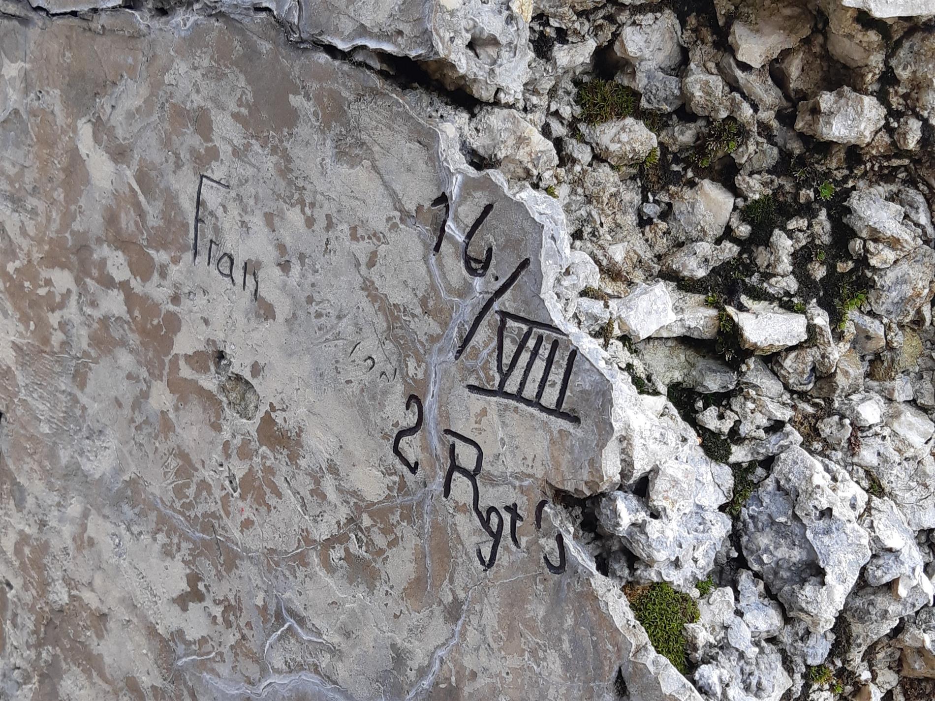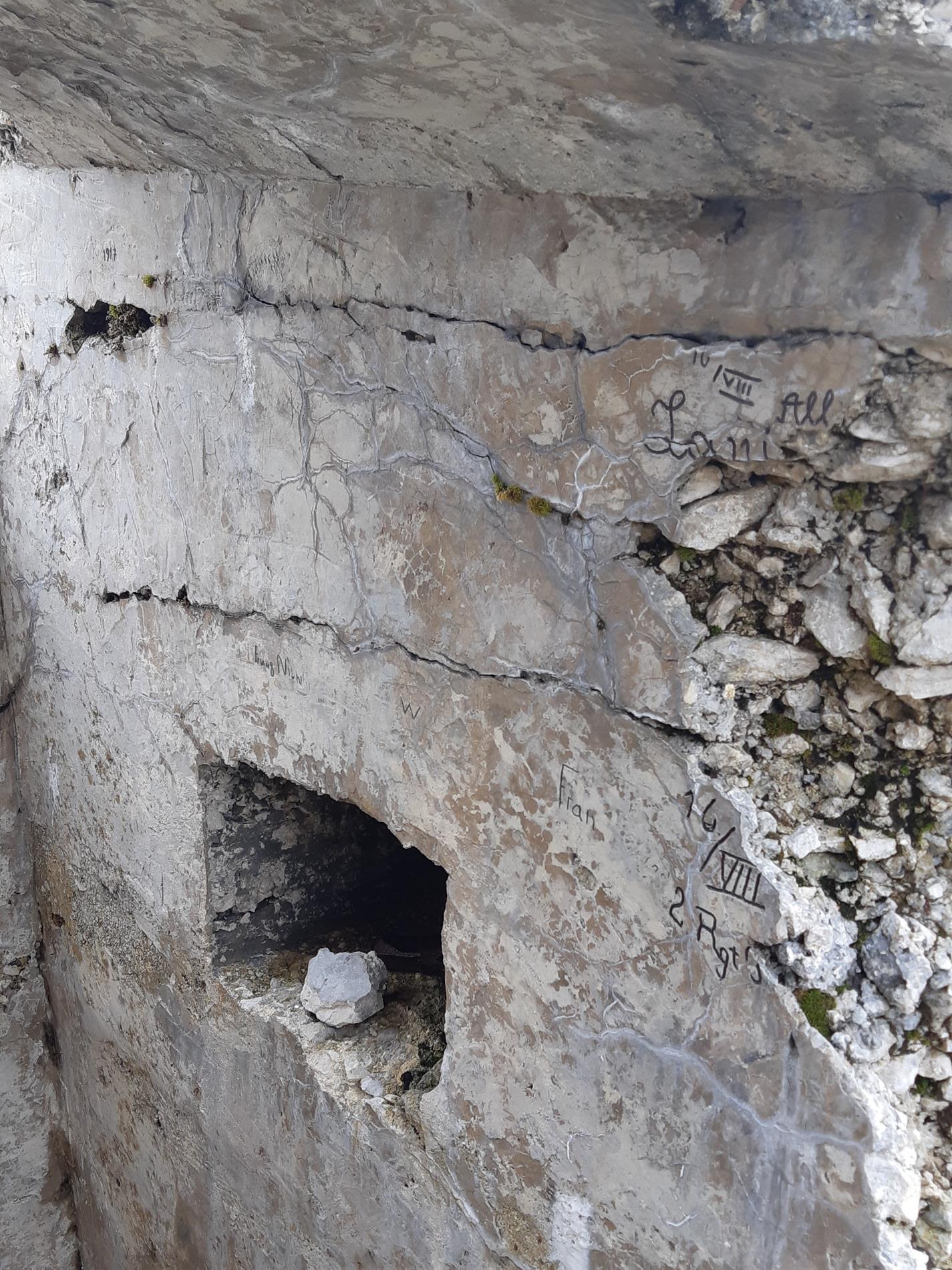 Complesso epigrafico di date e firme di soldati austro-ungarici in una postazione per fuciliere - Monte Pasubio
