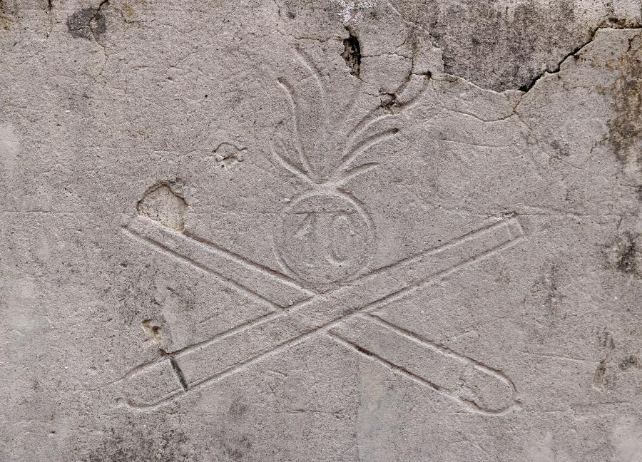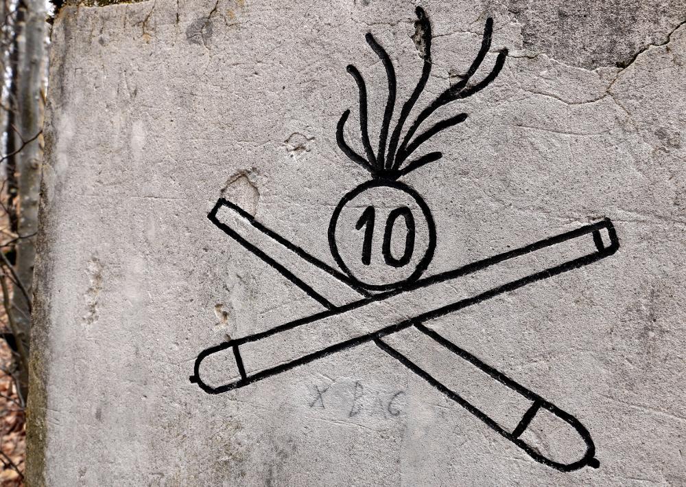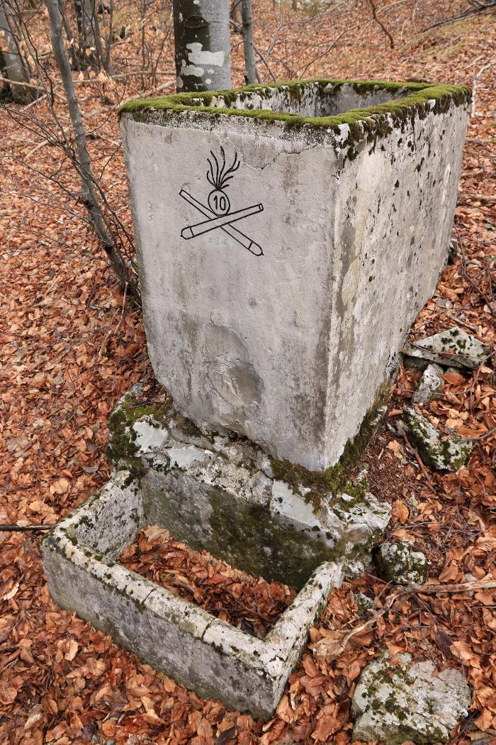 Il fregio rappresenta l'emblema del 10° Reggimento Artiglieria da Campagna, il quale operò (almeno con alcune batterie) nel settore della "Zona Carnia" durante il primo anno di guerra. Il fregio si trova sulla cisterna deputata alla raccolta dell'acqua piovana che serviva la sezione antiaerea di Monte Strabut: l'opera venne quindi costruita da artiglieri del 10° Reggimento Artiglieria da Campagna, al quale con ogni probabilità apparteneva anche il personale preposto alla gestione della citata sezione antiaerea. Quest'ultima, armata con due cannoni da campagna calibro 75 mm postati per il tiro contraereo (le due piazzole sono ancora evidenti presso la cima dello Strabut, situate all'interno del recinto che circonda l'area occupata dalle antenne), stando a degli incartamenti reperiti presso l'Archivio dell'Istituto di Storia e Cultura dell'Arma del Genio di Roma risultava attiva nell'anno 1916. La posizione del Monte Strabut si prestava in modo ottimale per la difesa antiaerea della Città di Tolmezzo, sede del Comando del XII Corpo d'Armata "Zona Carnia". Al 24 ottobre 1917, data d'esordio della battaglia di Caporetto, non risultavano postazioni antiaeree attive sul Monte Strabut: i due pezzi erano stati trasferiti in altro sito da qualche mese, probabilmente perché individuati dall'osservazione aerea austro-ungarica. Pertanto, non si conosce la data di incisione del graffito; si ipotizza che esso risalga al primo anno di guerra, sebbene non si possa del tutto escludere la sua derivazione dal periodo centrale del conflitto (ad ogni modo, è precedente al 24 ottobre 1917).