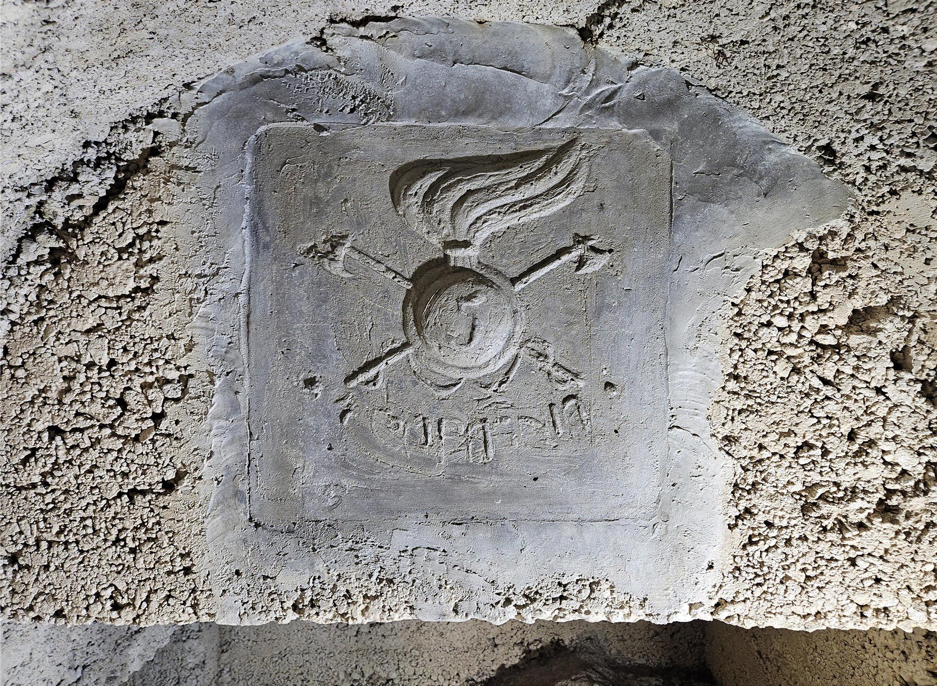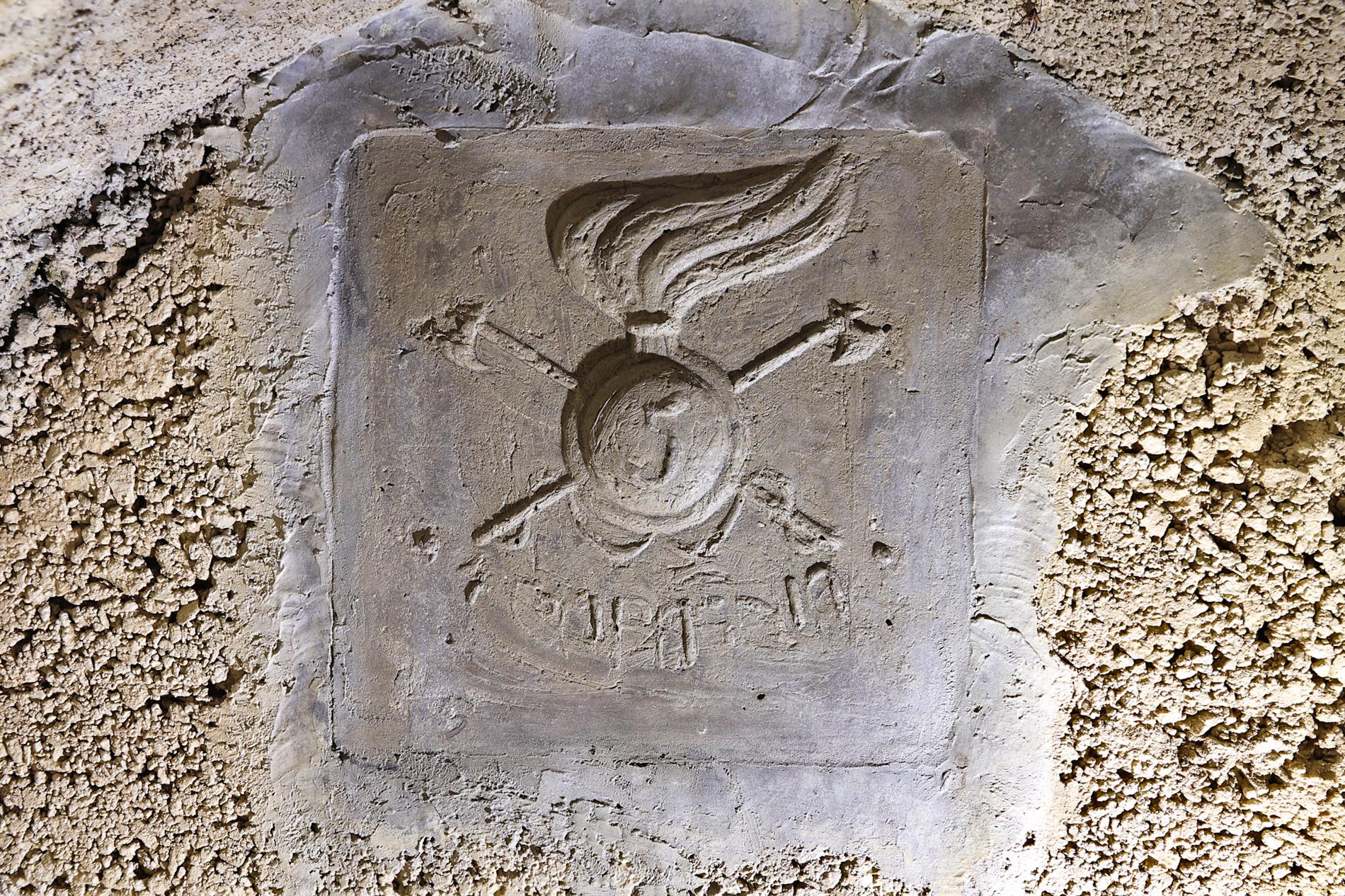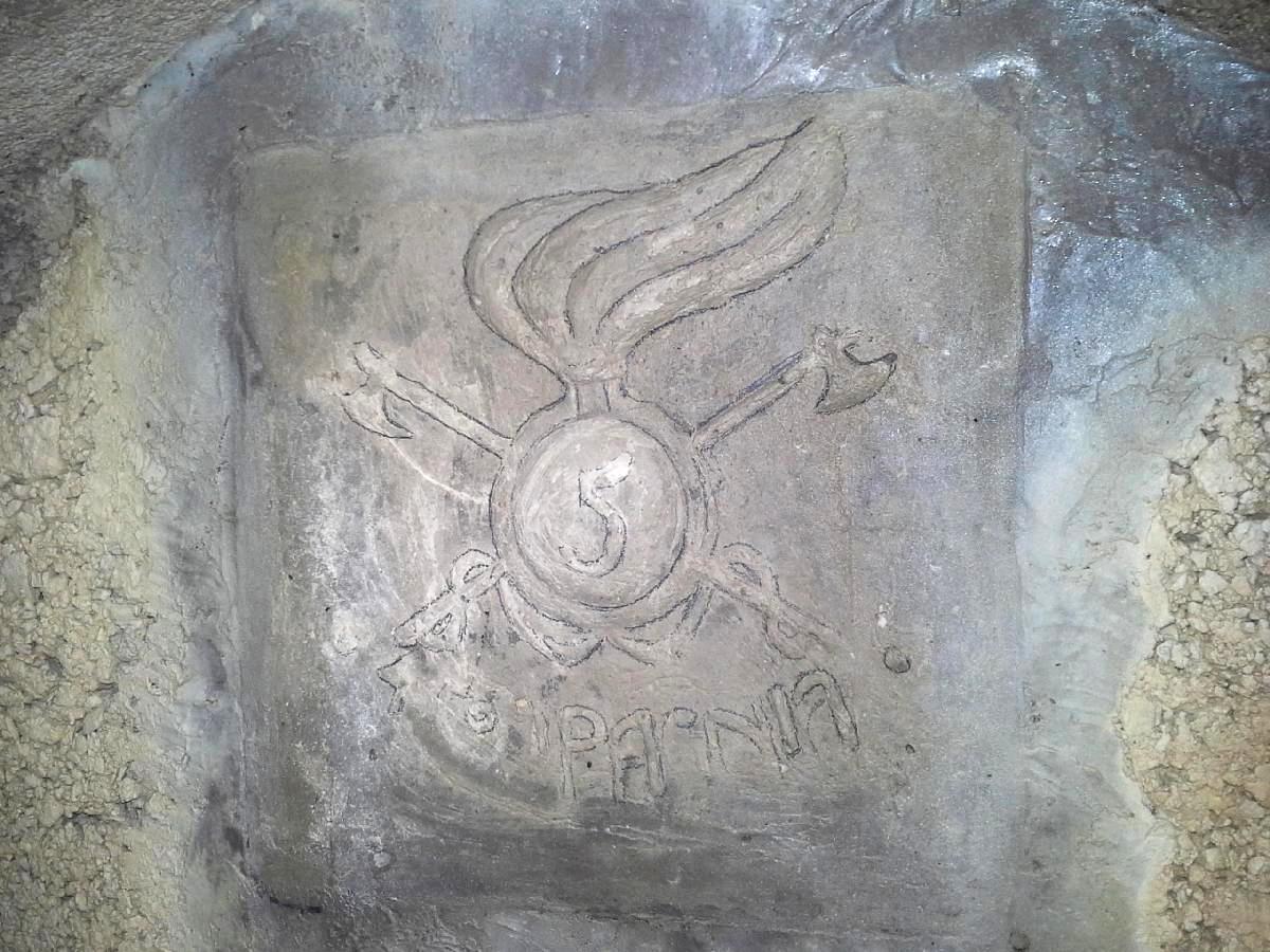 La targa riporta l'indicazione della 4ª Compagnia del 5° Reggimento Genio Minatori, di cui rappresenta l'emblema reggimentale. Tale compagnia era specializzata nei lavori di mina e quindi nell'impiego di esplosivi, tanto in funzione dell'interruzione di opere viarie e della distruzione di elementi fortificati, quanto nel contesto delle attività di sbancamento orientate alla costruzione delle più varie infrastrutture. Dalla dichiarazione italiana di guerra del 23 maggio 1915 ai giorni della ritirata di Caporetto a fine ottobre del 1917, la 4ª Compagnia Minatori risultò assegnata al XII Corpo d'Armata Zona Carnia. In Val Dogna lasciò numerose testimonianze materiali dei lavori eseguiti, spesso contrassegnate da targhe ed incisioni epigrafiche.