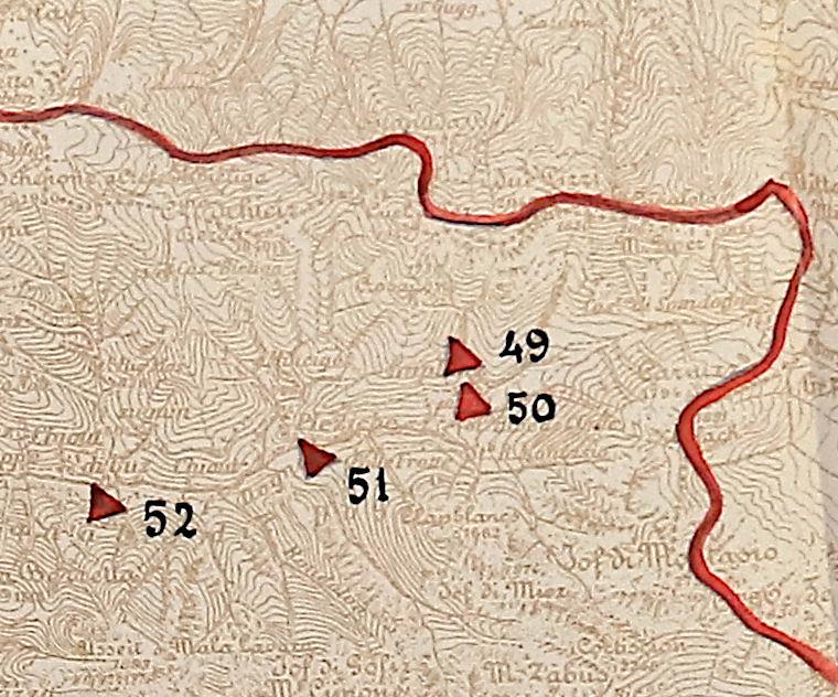 Nello specifico, la targa campeggia all'interno del fornello di mina predisposto dalla 4ª Compagnia Minatori per l'eventuale distruzione del ponte stradale in legno edificato lungo la rotabile militare della Val Dogna, ultimata con un primo tracciato fino a Implanz nella prima metà del giugno 1915 (dopo diversi mesi di lavori, avvenuti in gran parte durante il periodo della neutralità italiana) e prolungata fin oltre il Plan dei Spadovai nei mesi successivi. Il Diario storico-militare della 4ª Compagnia precisa che nella giornata del 14 agosto 1915 il reparto veniva trasferito a Implanz "per il lavoro di attraversamento del Rio Bianco". Al 18 agosto 1915, secondo una relazione siglata dal Tenente Colonnello Ferdinando Pecco, l'interruzione presso il Rio Bianco risultava in corso di costruzione. Altri documenti (citati in bibliografia) risalenti a settembre 1916 e maggio 1917 testimoniano che la gestione dell'interruzione (e quindi del fornello di mina) risultava assegnata alla medesima 4ª Compagnia Minatori che l'aveva predisposta. Per effettuare l'interruzione si richiedevano 2 ore, mentre l'entità prevista era di 15 metri lineari, con conseguente distruzione del ponte in legno sul Rio Bianco. La responsabilità di impartire l'ordine di brillamento incombeva sul Comando del XII Corpo d'Armata Zona Carnia.