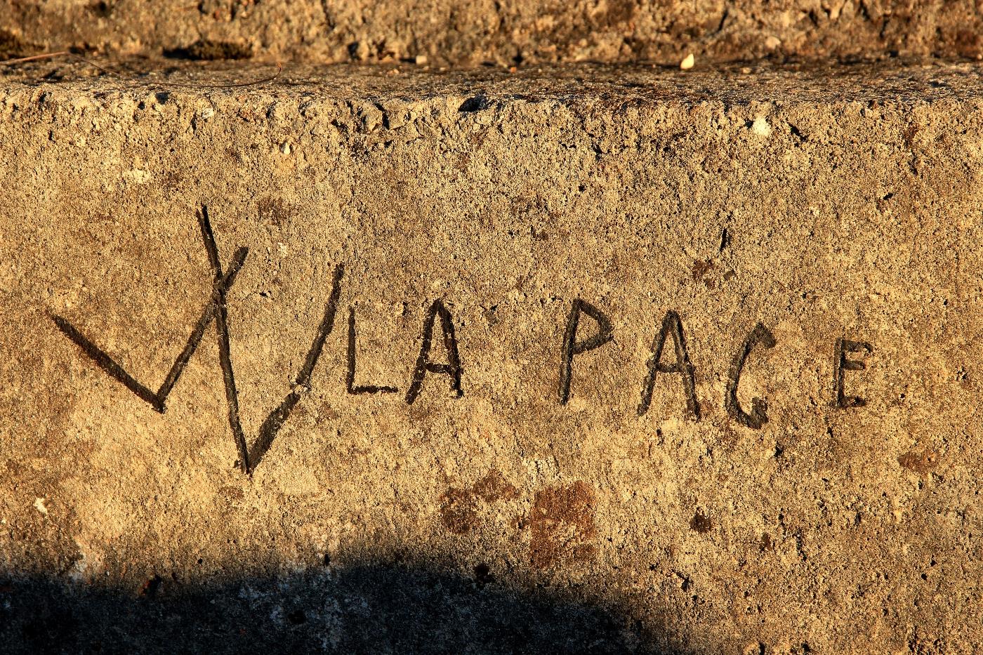 Graffito inneggiante alla pace inciso nel cemento di quella che durante gli ultimi frangenti del 1915 e nei primi otto mesi del 1916 era la più avanzata trincea italiana del settore.