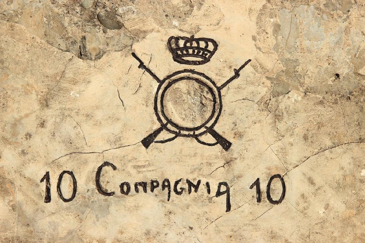 Iscrizione che presenta uno stilizzato, ma ben riconoscibile, fregio della Fanteria (la cui parte centrale, purtroppo, risulta danneggiata, così provocando l'illeggibilità dell'ordinativo reggimentale), accompagnato dall'indicazione della 10ª Compagnia, del III Battaglione di un Reggimento purtroppo ignoto. Essendo, nel 1915-1916 (anni in cui queste posizioni rappresentavano la prima linea di resistenza italiana), di norma costituiti i battaglioni di fanteria con quattro compagnie fucilieri, non si può che trattare di una compagnie appartenente al III Battaglione di qualche reggimento di Fanteria.