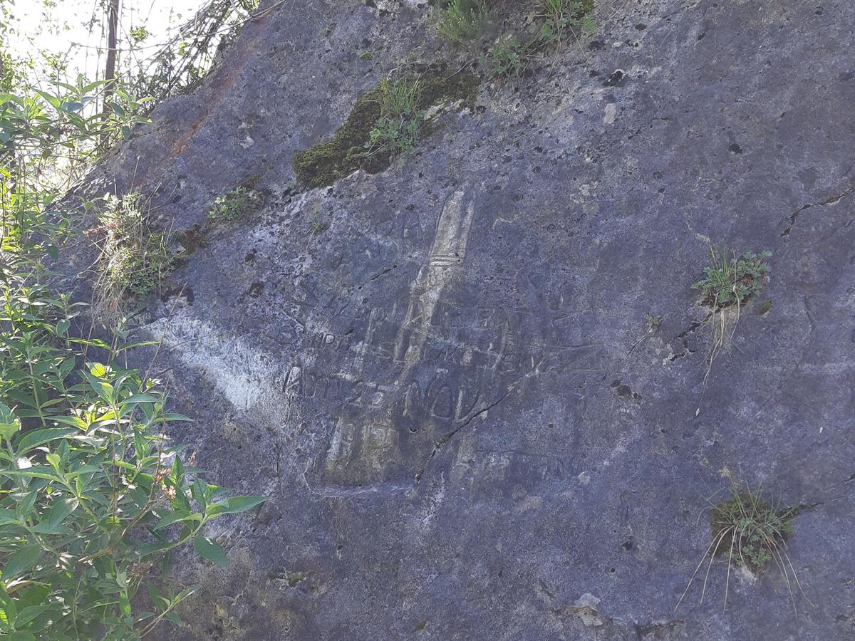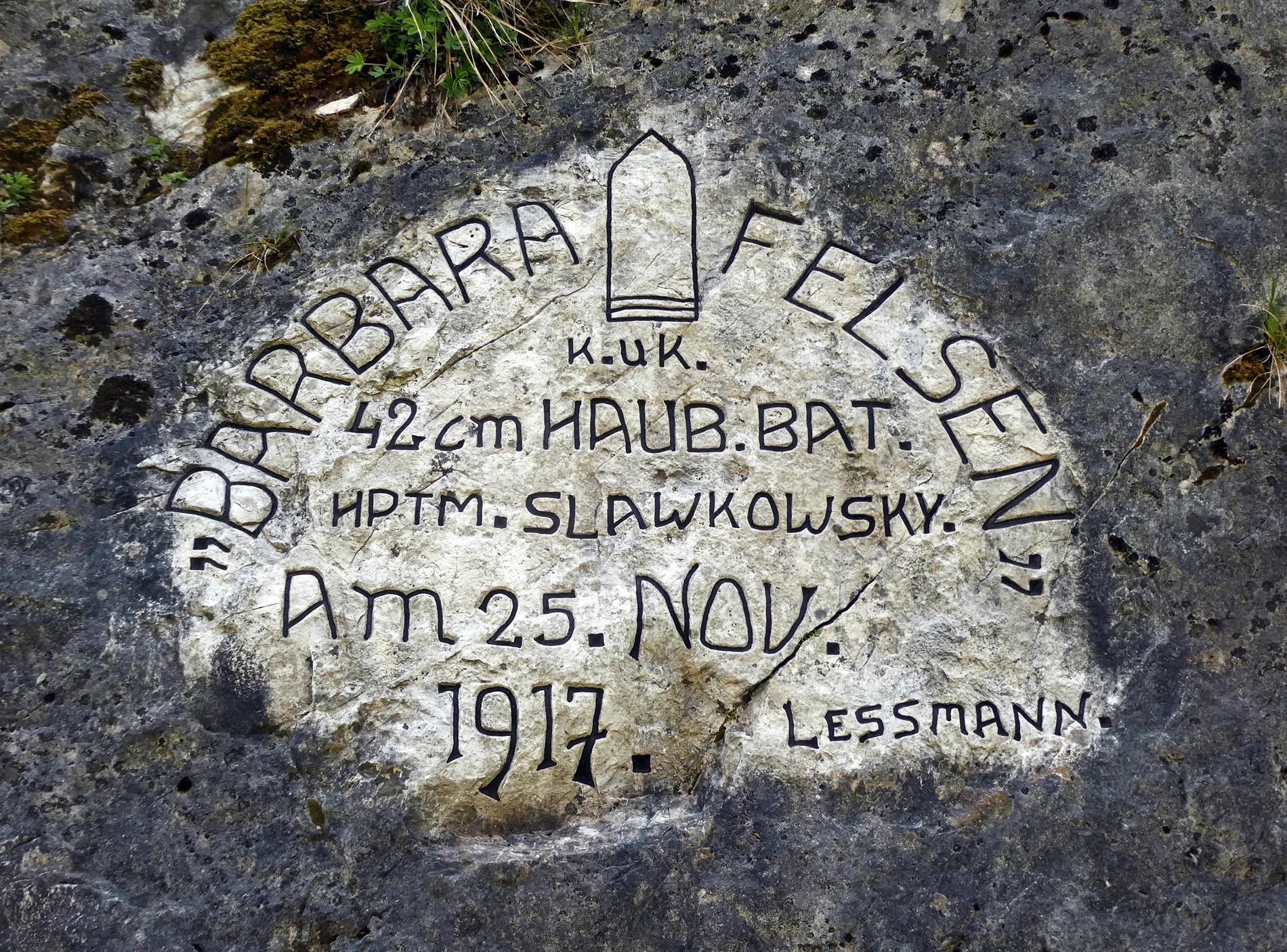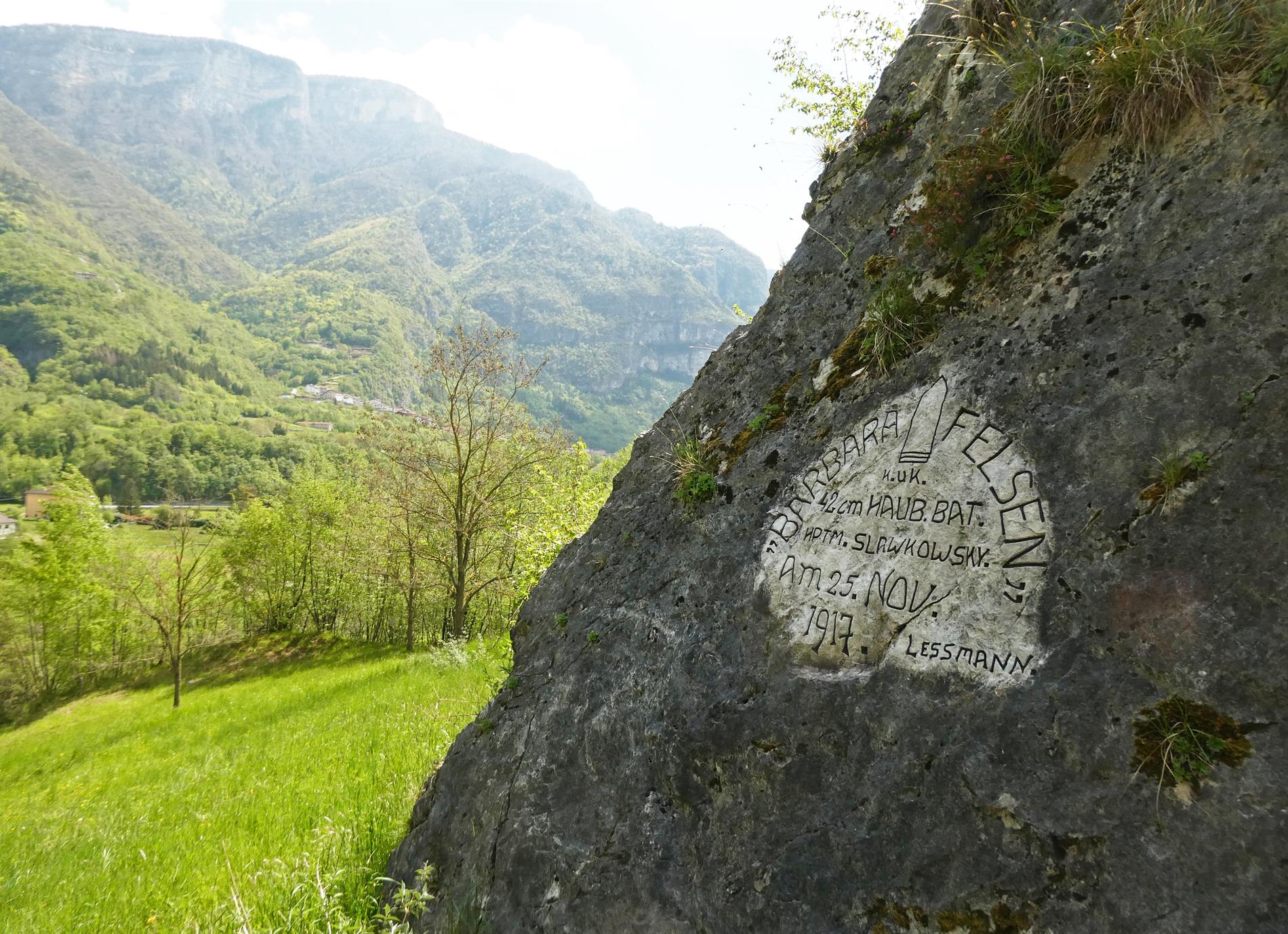 La grande iscrizione testimonia la presenza nel novembre 1917 di una Imperiale e Regia Batteria Obici da 42 cm in Alta Valle d'Astico, in località Marogne, presso l'abitato di Casotto.