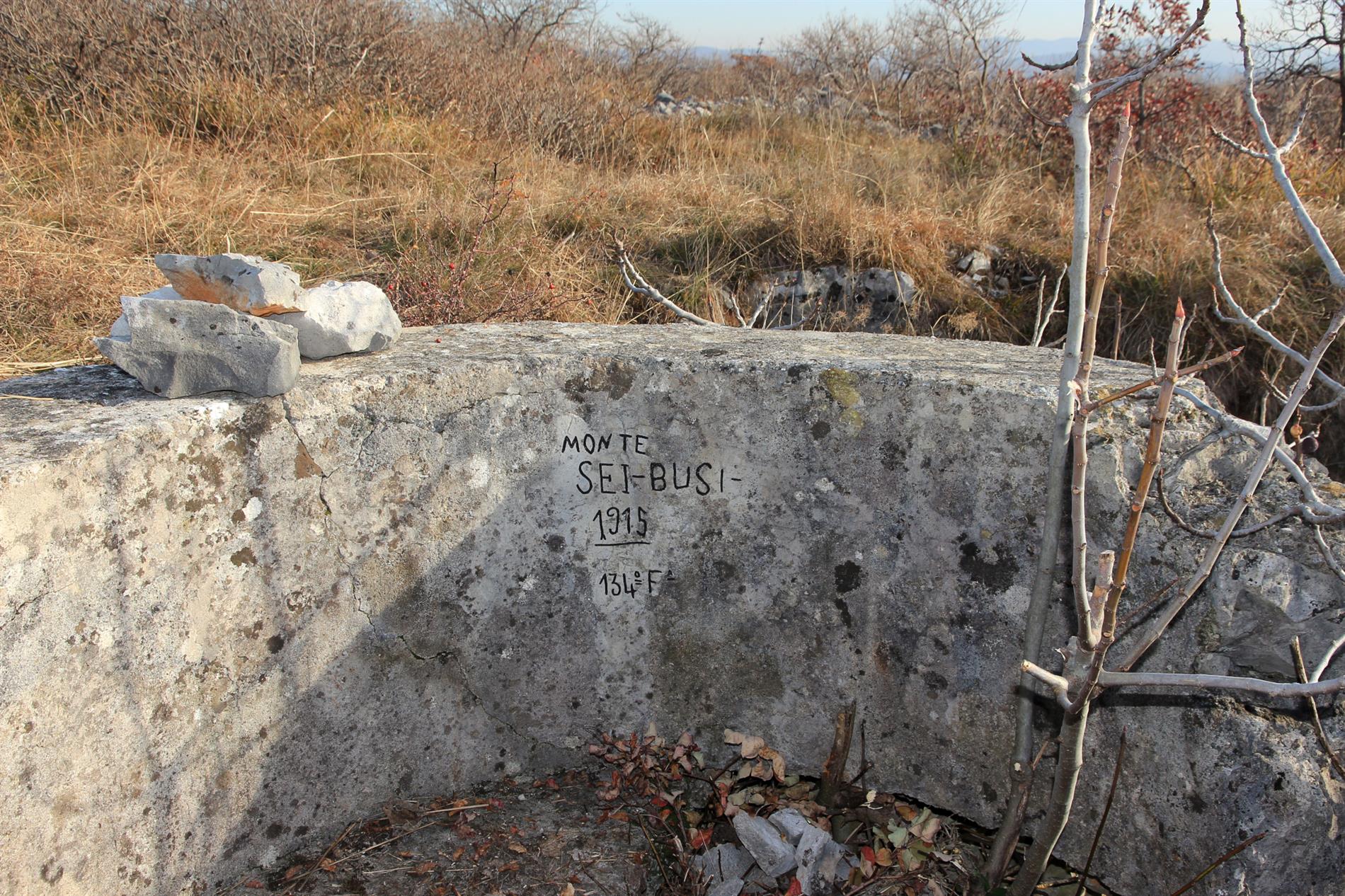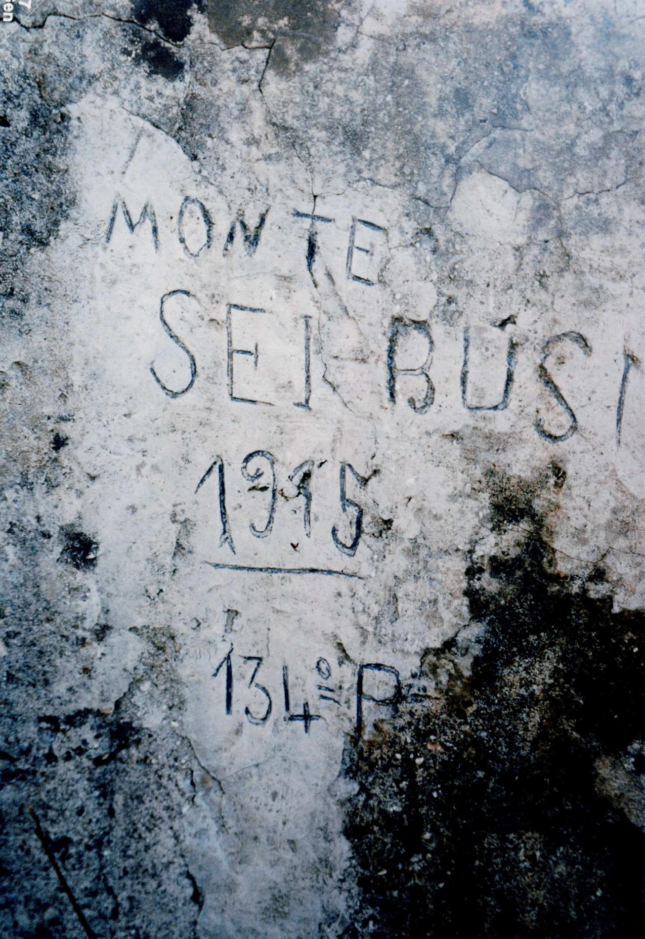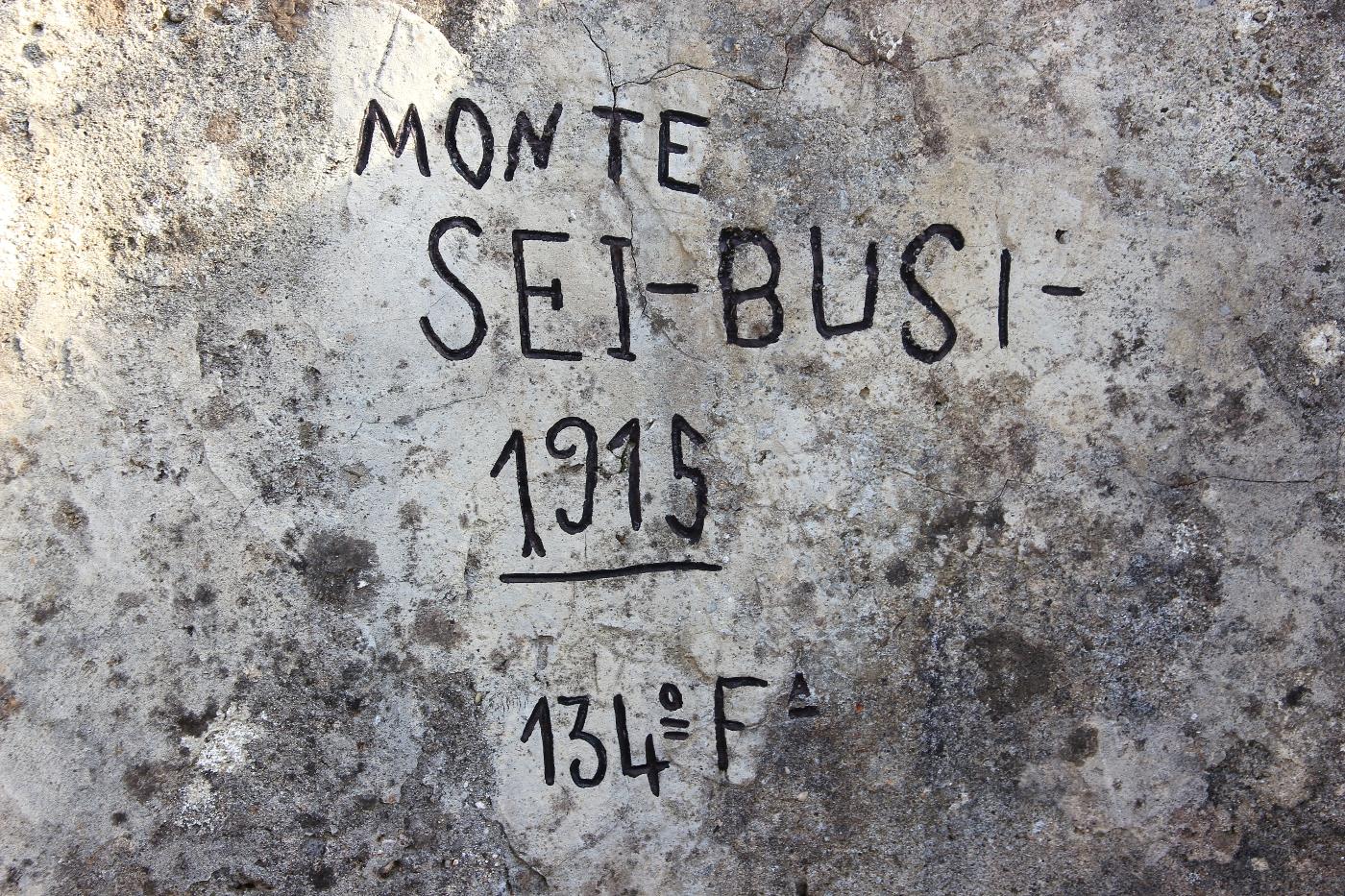 Rara iscrizione risalente ai primi mesi del conflitto, che propone l'indicazione del 134° Reggimento Fanteria della Brigata Benevento, la datazione "1915" e il toponimo del Monte Sei Busi. Essa venne incisa su un elemento avanzato (postazione per mitragliatrice a lunetta) della prima linea italiana, per come risultante al termine delle azioni avvenute durante la Seconda Battaglia dell'Isonzo, nel luglio-agosto del 1915.
