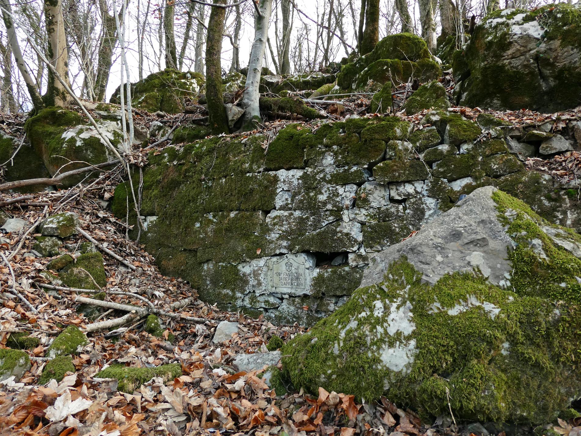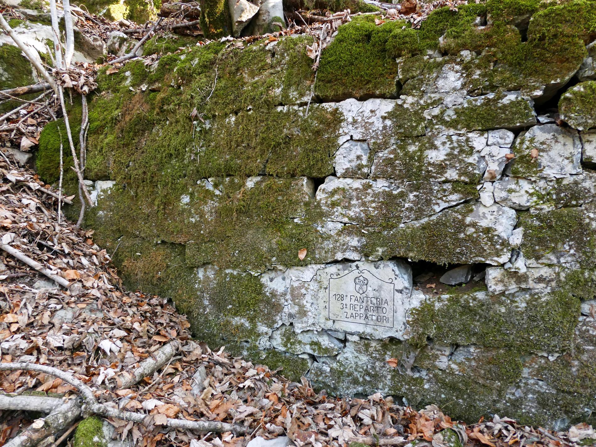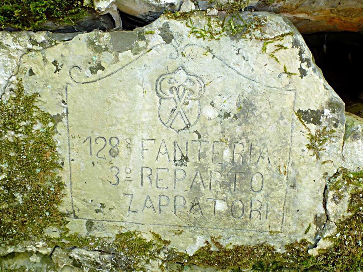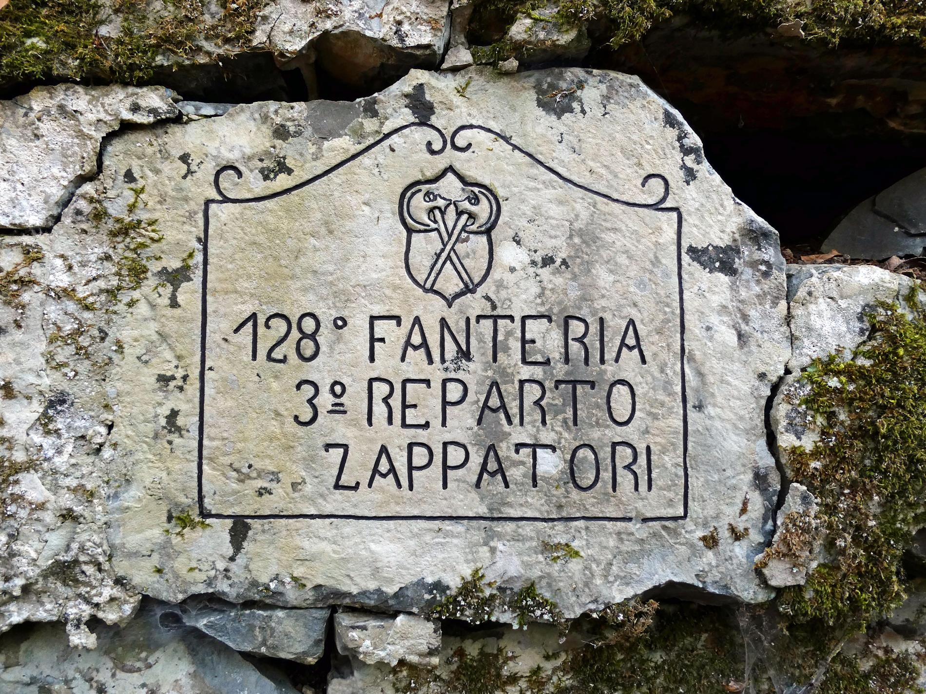 La pregevole iscrizione, conservatasi sui resti murari di alcuni ricoveri che punteggiano il pendio ad ovest della cima di Quota 383, testimonia la presenza del III Reparto Zappatori (del III Battaglione) del 128° Reggimento Fanteria (Brigata Firenze).