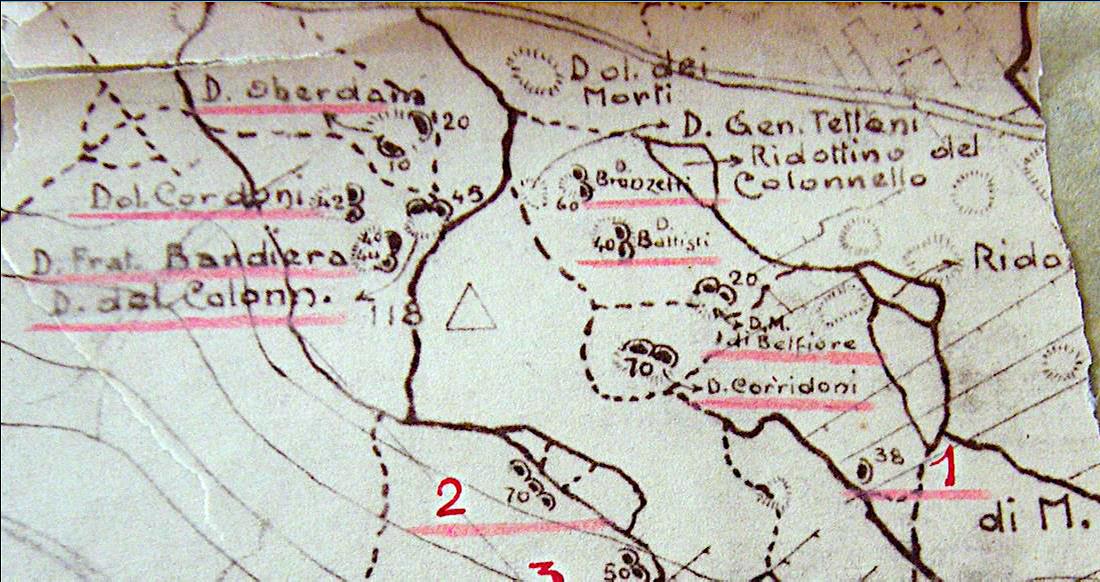 In riferimento al toponimo Dolina Contrastata, evidentemente ispirato ai fatti d'arme che il sito conobbe soprattutto fra luglio e ottobre 1915, i pionieri della ricerca epigrafica Antonio e Furio Scrimali, in Il Carso..., op. cit., optano per attribuirlo ad altra dolina situata novanta metri circa verso sud-est e caratterizzata dalla presenza di trinceramenti tedeschi costruiti negli ultimi anni della Seconda Guerra Mondiale (oltre che, ovviamente, da numerose testimonianze di fortificazioni italiane della Grande Guerra). Tuttavia, l'esame delle risorse cartografiche menzionate, di più recente acquisizione, consigliano di individuare la Dolina Contrastata nel luogo in descrizione.