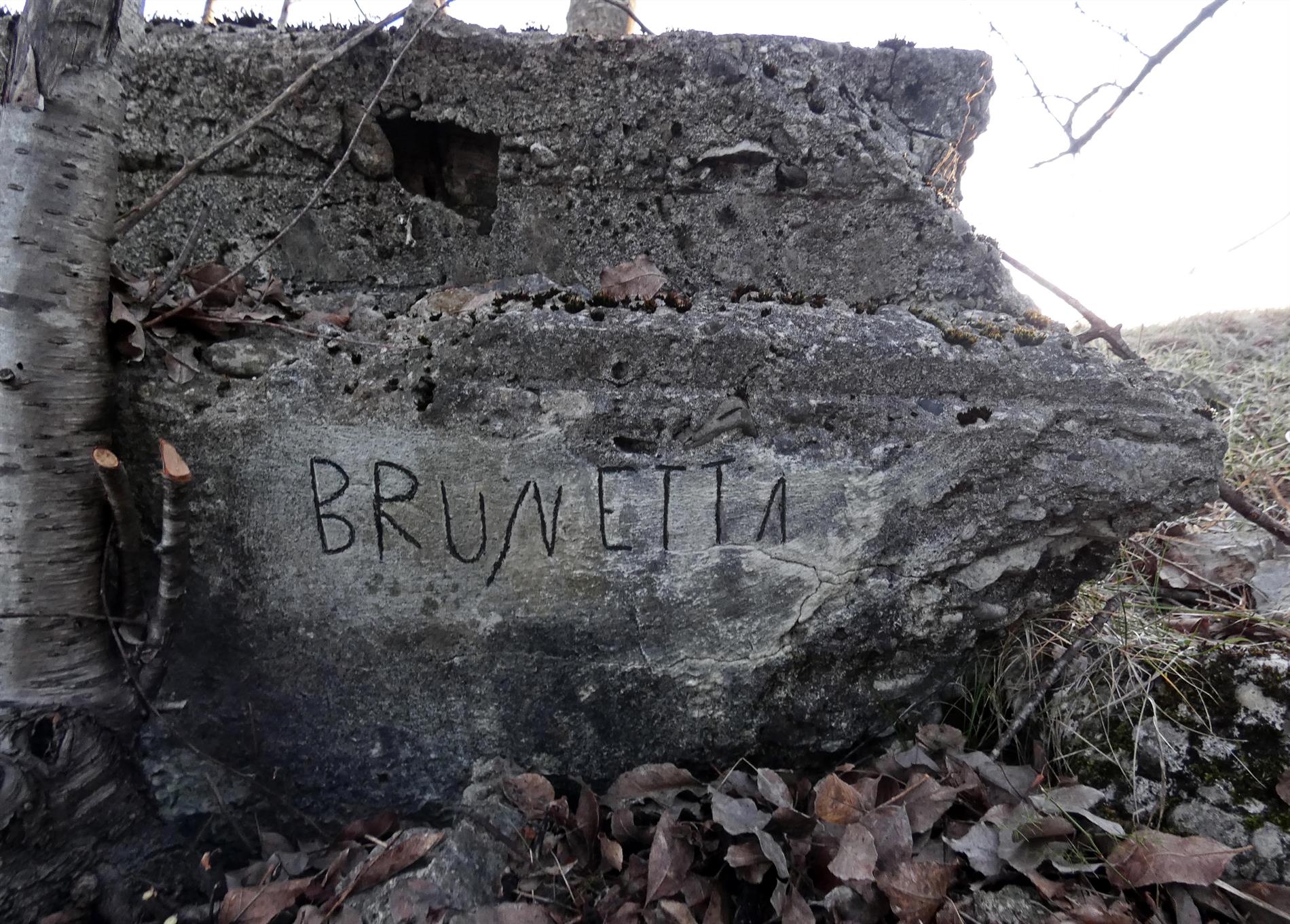 Piccola iscrizione, forse riportante il nominativo di un militare, realizzata nel muro della trincea che sale da Quota 45 verso il monumento di Quota 65 del Monte Sopra Selz, individuabile sulla topografia del 1916 con l'inequivocabile toponimo di "Trincea della Morte".