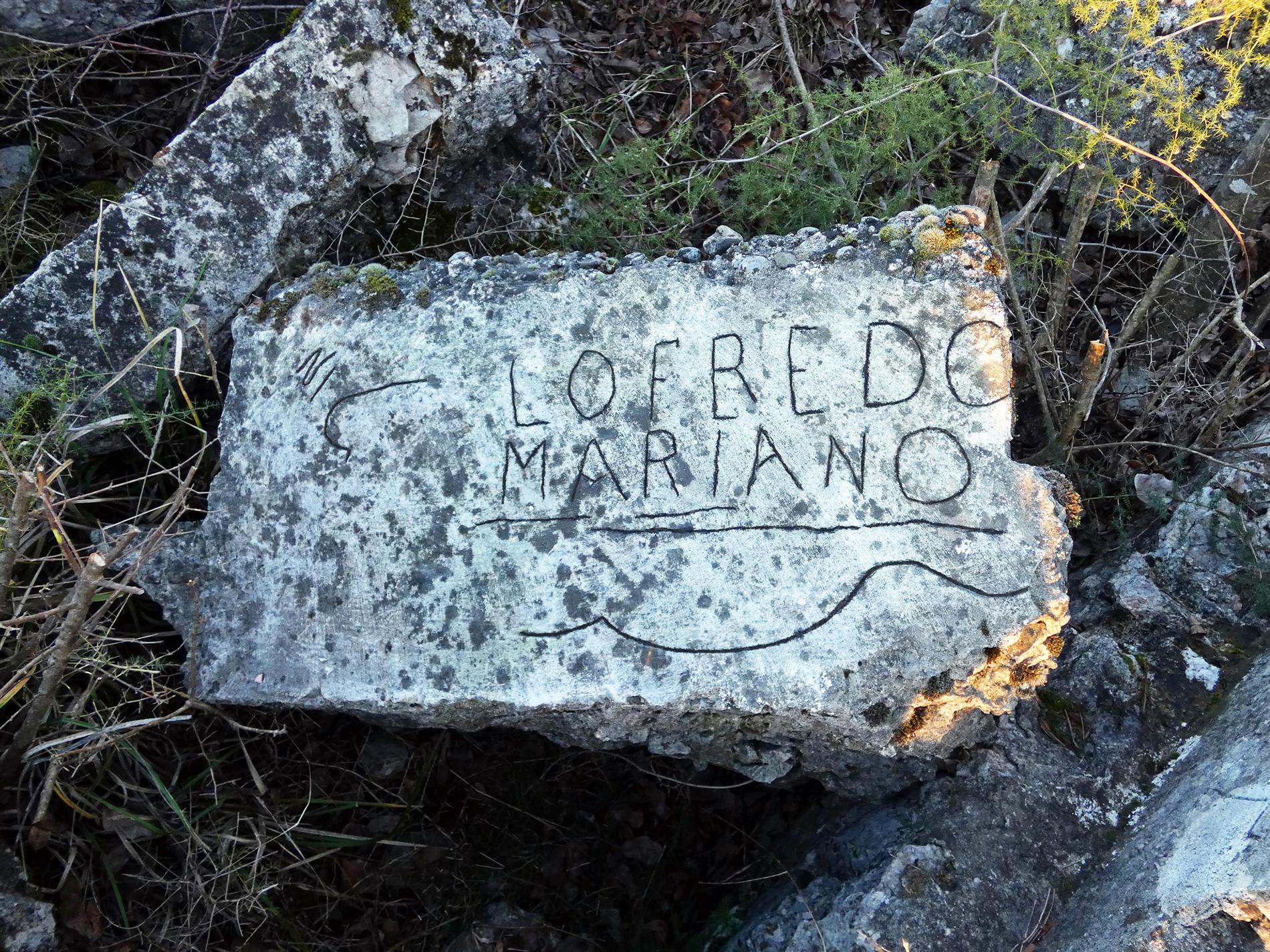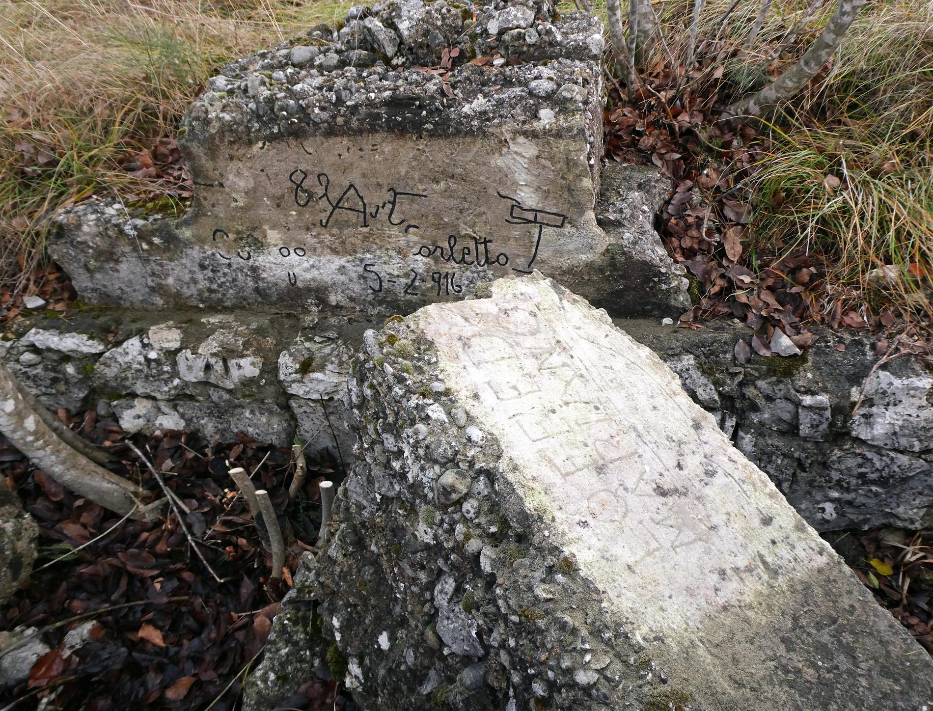 Piccola iscrizione, riportante il nominativo di un militare, realizzata nel muro della trincea che sale da Quota 45 verso il monumento di Quota 65 del Monte Sopra Selz, individuabile sulla topografia del 1916 con l'inequivocabile toponimo di "Trincea della Morte".
