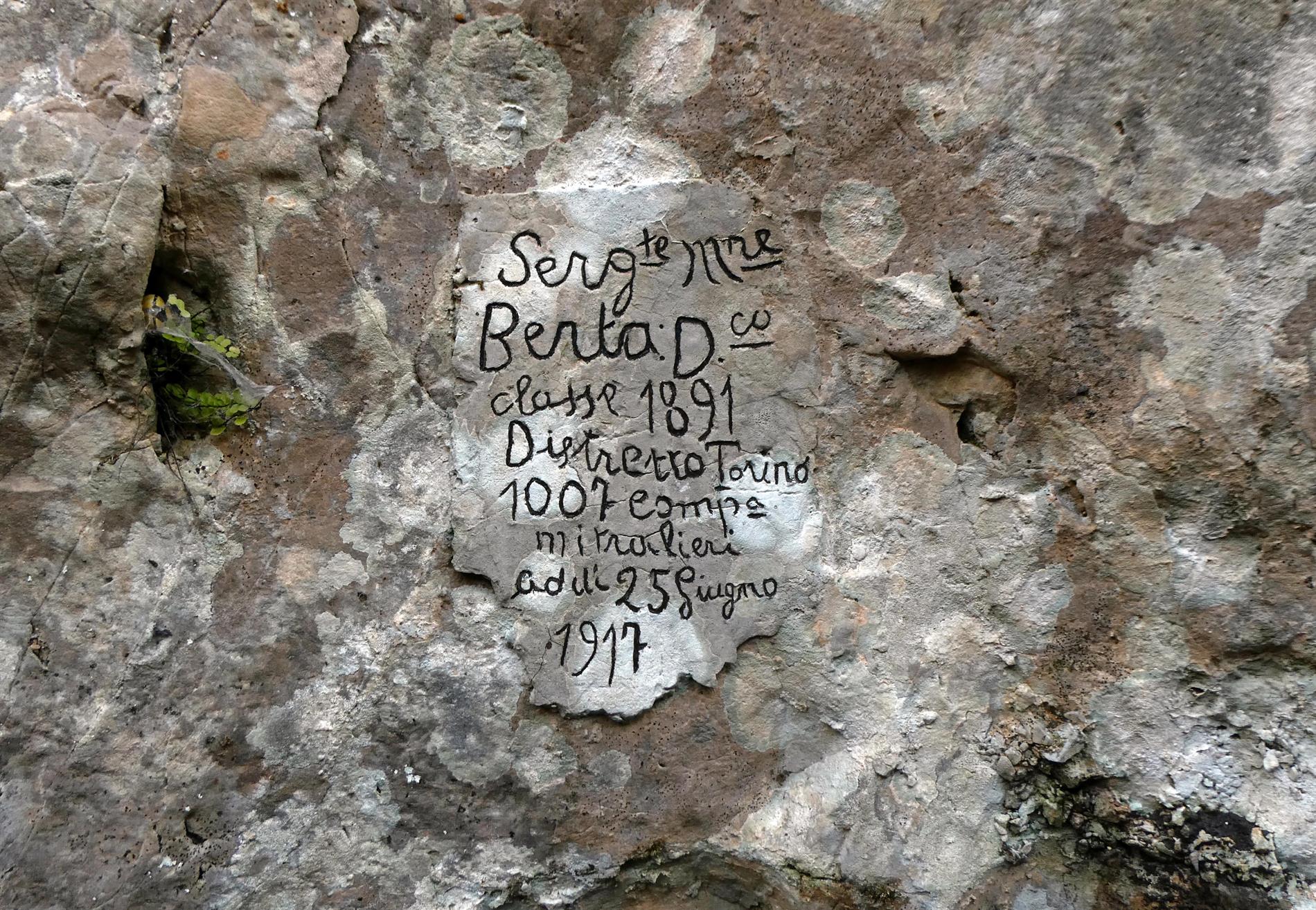 L'epigrafe in oggetto compare presso l'ingresso di una postazione per mitragliatrice ricavata in un grande masso, presso la località Soglio Rotto - Q. 817 alle pendici del Monte Priaforà, dove la 1007ª Compagnia Mitragliatrici - alle dipendenze della 2ª Divisione, X Corpo d'Armata - risulta avere prestato servizio in linea nella prima quindicina del mese di luglio 1917.