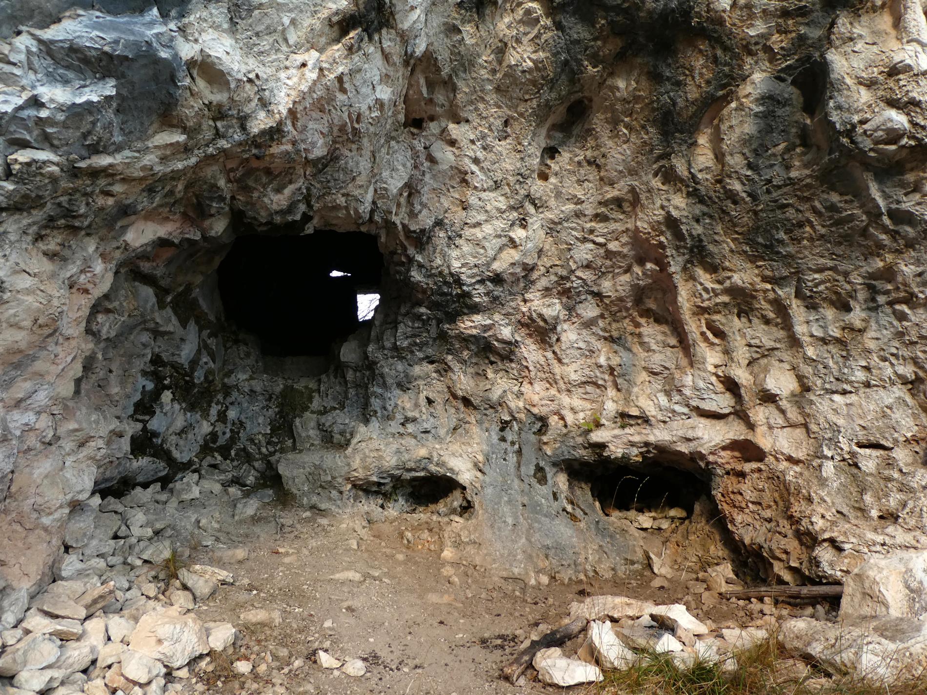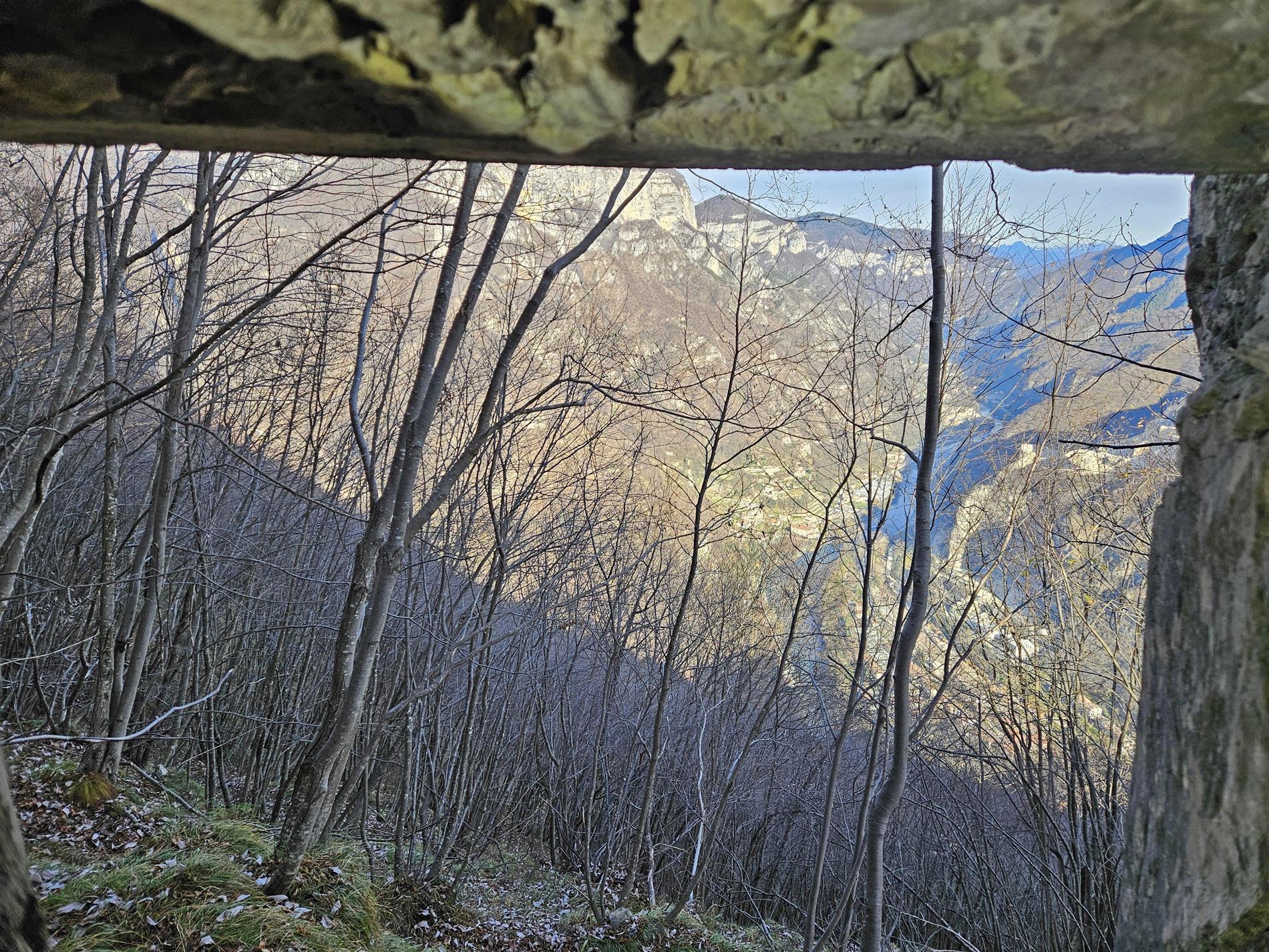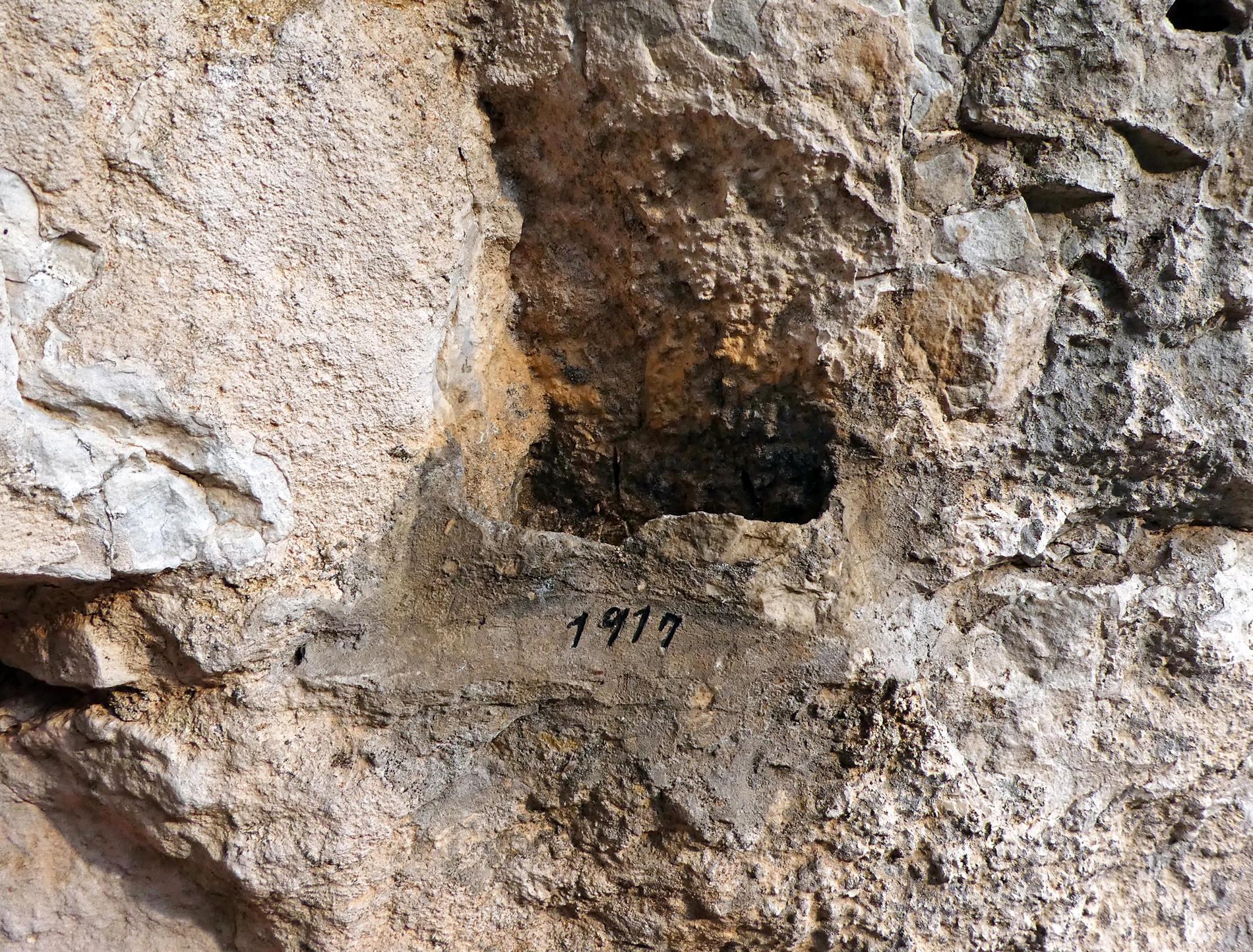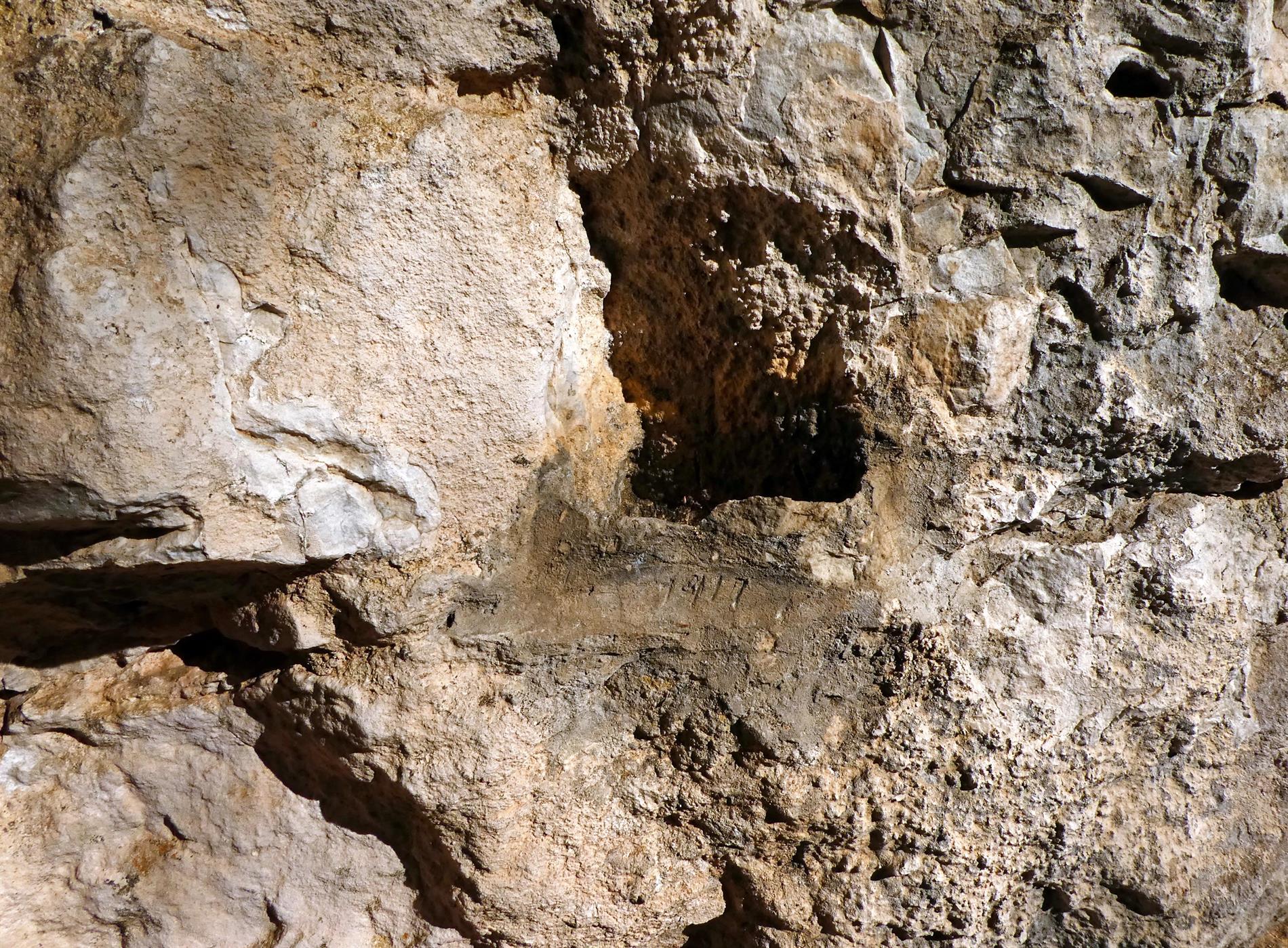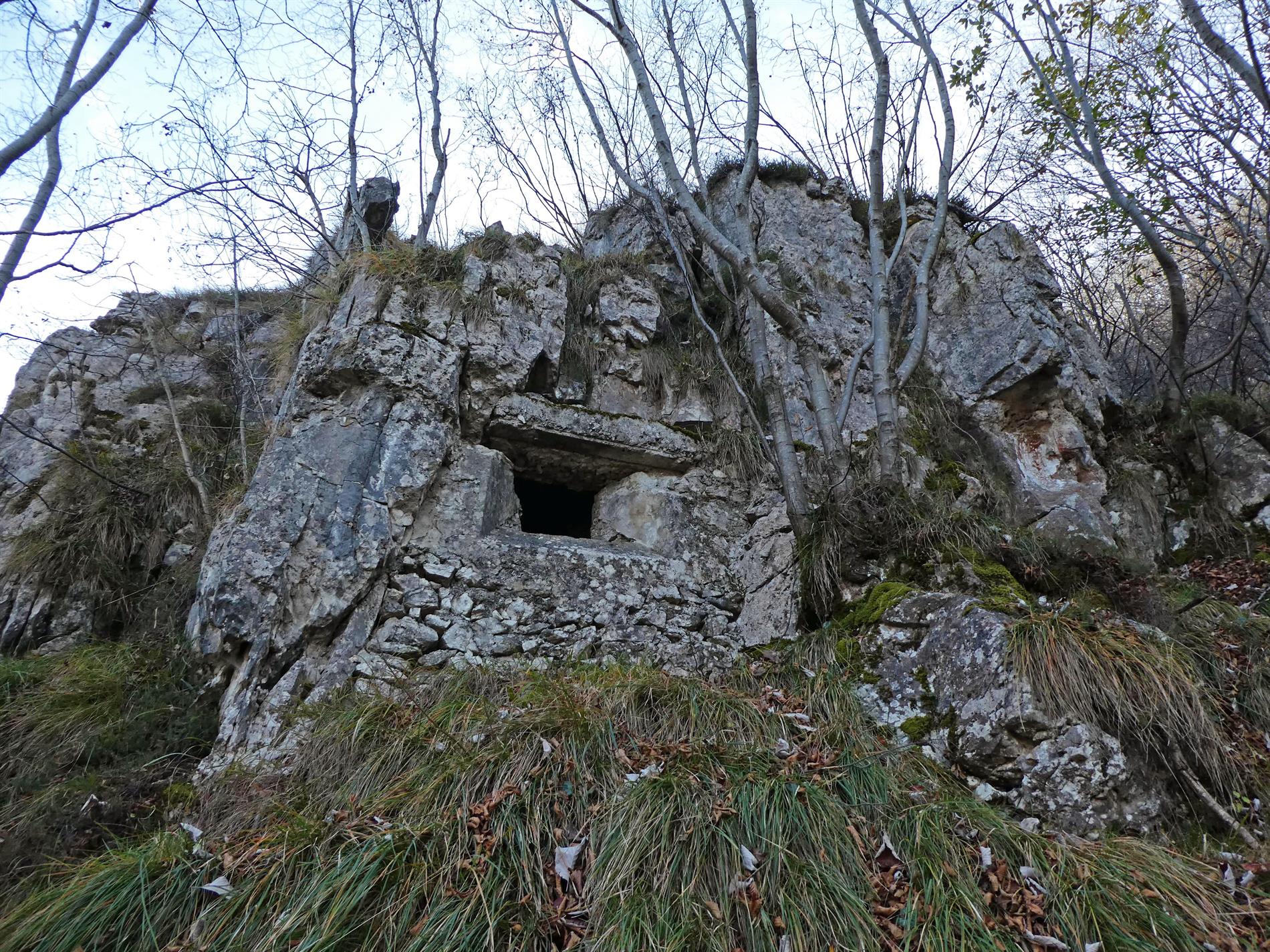 b. L'ingresso della postazione per mitragliatrice e la parete in roccia sulla quale è rinvenibile l'iscrizione