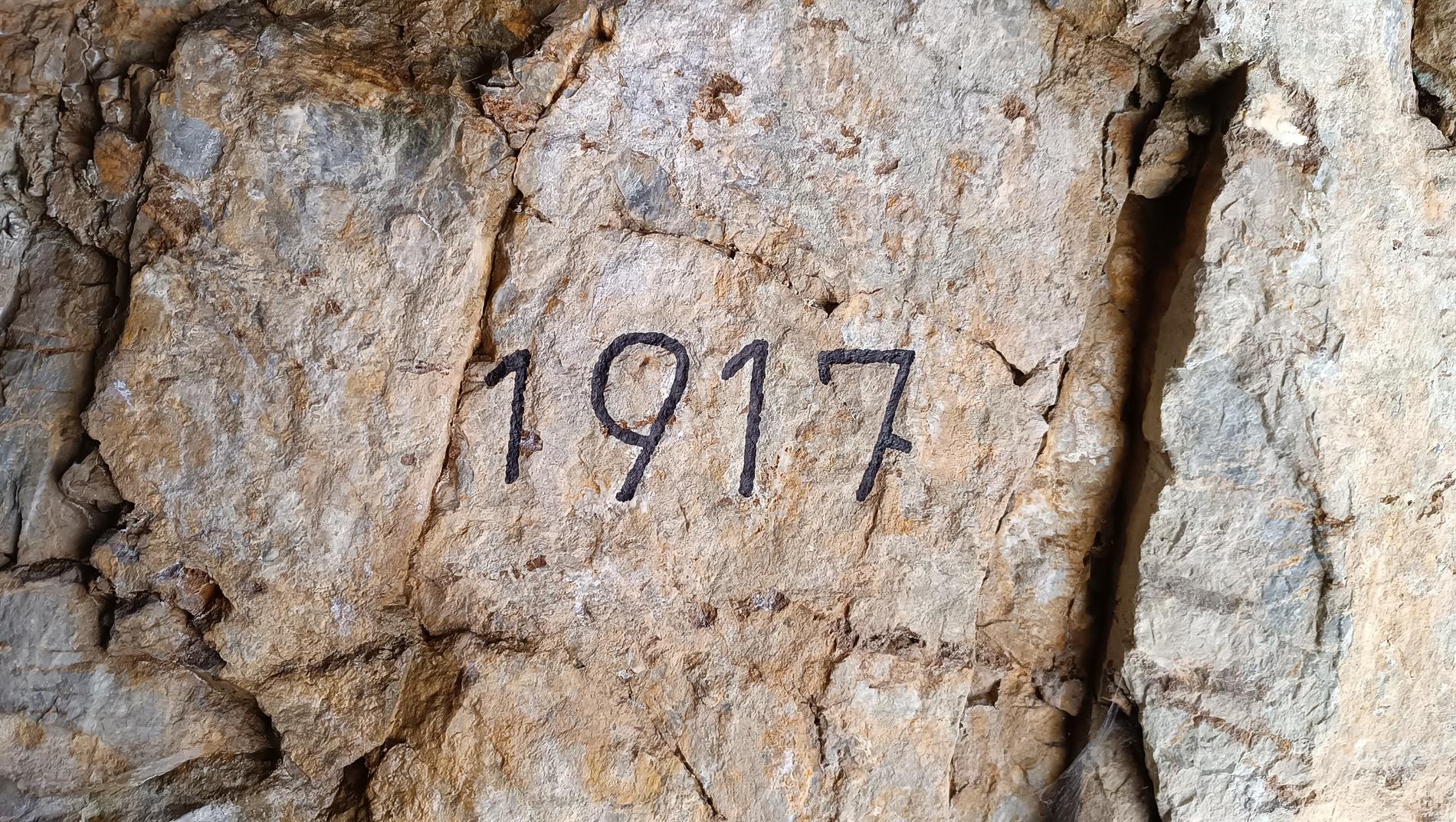 L'iscrizione rimanda con ogni probabilità all'anno di approntamento della caverna che la ospita. Tale caverna ha un'apertura verso il Lago Bordaglia e la provenienza da Passo Giramondo, e due aperture per mitragliatrice a battere le provenienze dal Passo Val d'Inferno.