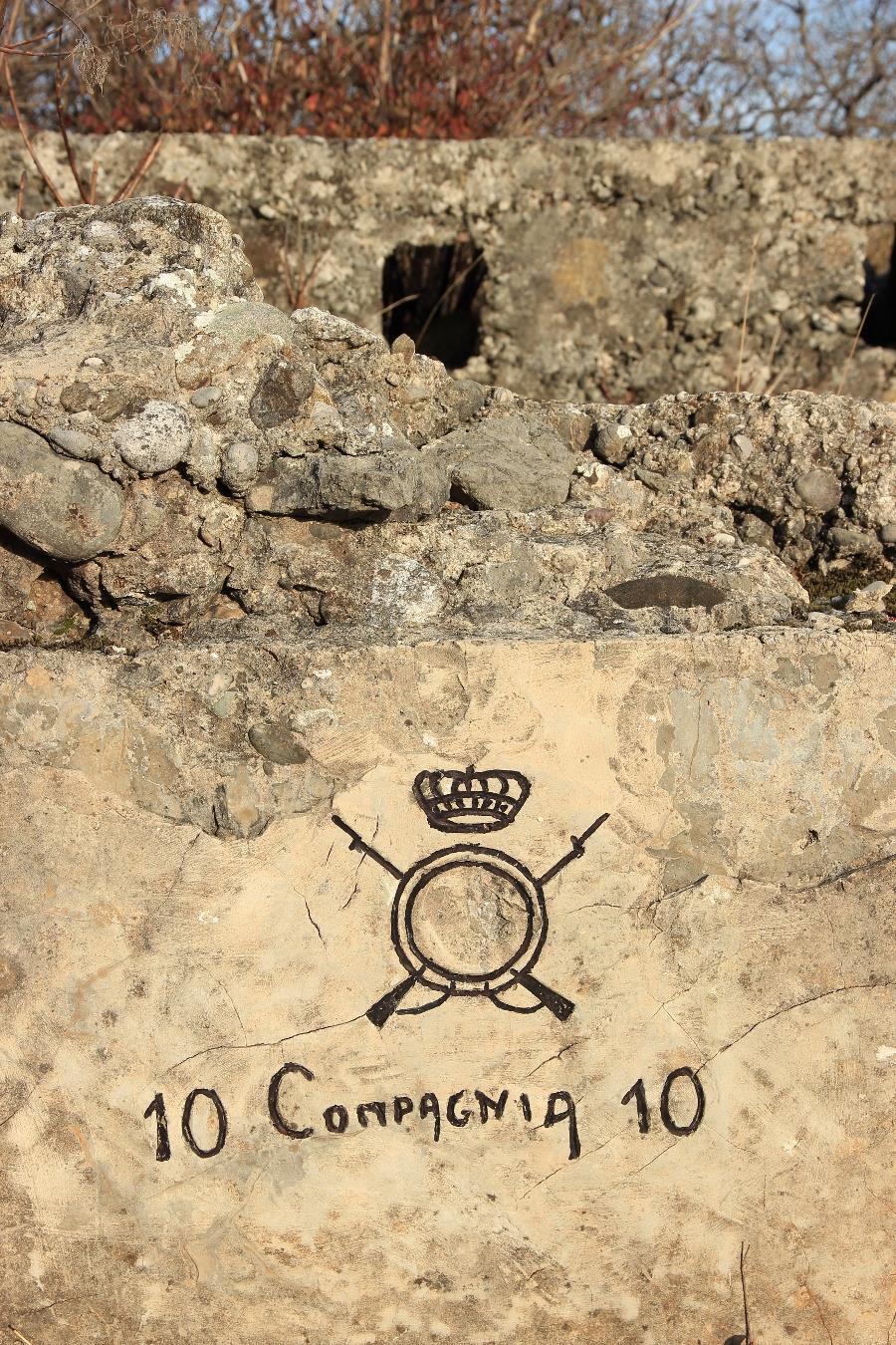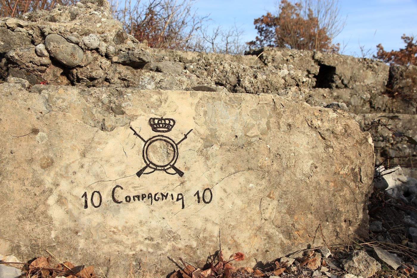 Iscrizione che presenta il fregio di un non riconoscibile reggimento di fanteria (l'ordinativo reggimentale verosimilmente esisteva nella parte centrale del fregio, sensibilmente danneggiata), accompagnato dall'indicazione della 10ª Compagnia (afferente al III battaglione del citato reggimento di fanteria, in quanto nel 1915-1916 i reggimenti di fanteria risultavano normalmente strutturati su tre battaglioni, ciascuno dei quali imperniati su quattro compagnie).