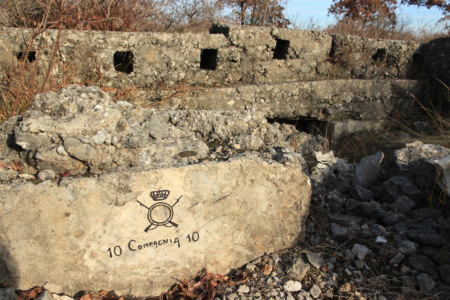 L'iscrizione appare presso la trincea in cemento che, fra l'ultima decade del luglio 1915 (Seconda Battaglia dell'Isonzo, fase che portò alla conquista italiana della posizione) e la prima decade dell'agosto 1916 (Sesta Battaglia dell'Isonzo, evento a cui conseguì la progressione italiana per alcuni chilometri nell'entroterra carsico), costituì l'asse fondamentale del sistema trincerato avanzato tenuto dal Regio Esercito lungo il ciglione che del Monte Sei Busi digrada verso le Alture di Vermegliano. Trincea che, successivamente all'agosto del 1916 e fino alla ritirata italiana conseguita allo sfondamento austro-tedesco di Caporetto (scattata sul Carso il 27 ottobre del 1917), venne inglobata in quello che nel 1917 rappresentava il settimo sistema fortificato arretrato della 3ª Armata, ossia la Linea di San Martino.