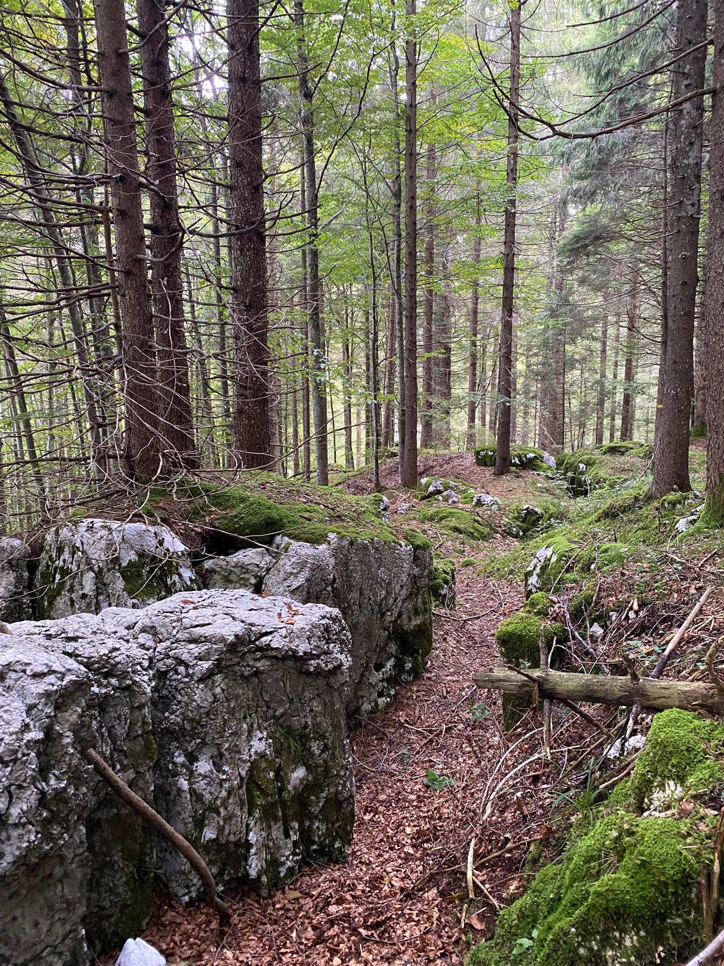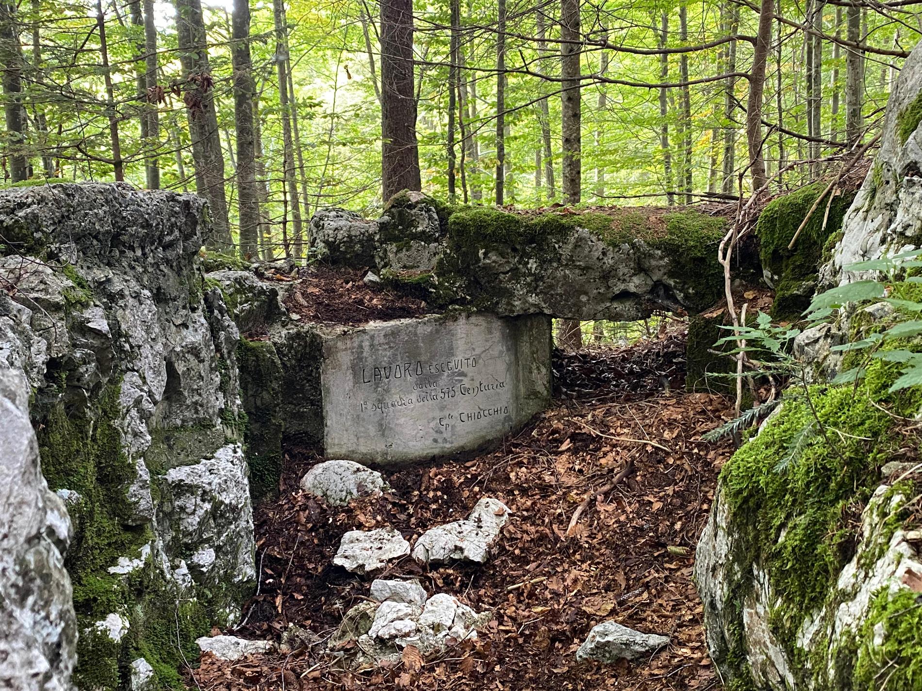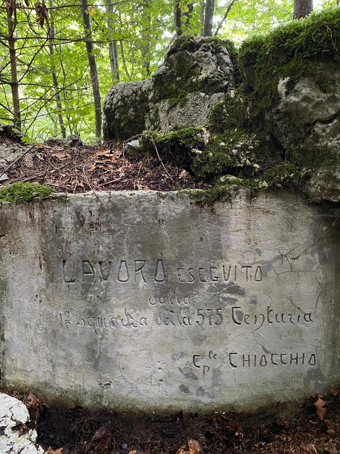 Iscrizione che rammenta i lavori di fortificazione eseguiti dalla 1ª Squadra della 575ª Centuria Lavoratori, reparto di militari addetti prevalentemente a lavori edilizi, di scavo, di falegnameria, di riordino, di trasporto e simili, avente per centro di mobilitazione il 9° Distretto (Chieti).