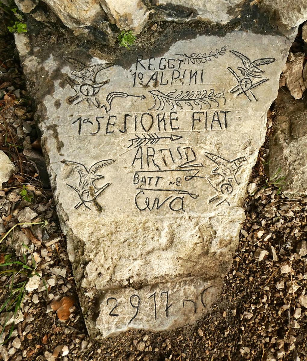 La presenza del Battaglione Alpini Ceva nel sottosettore "Monte Caviojo - Redentore" è testimoniata da numerose epigrafi (cfr. codd. 001431, 001556, 002940 e 003701).