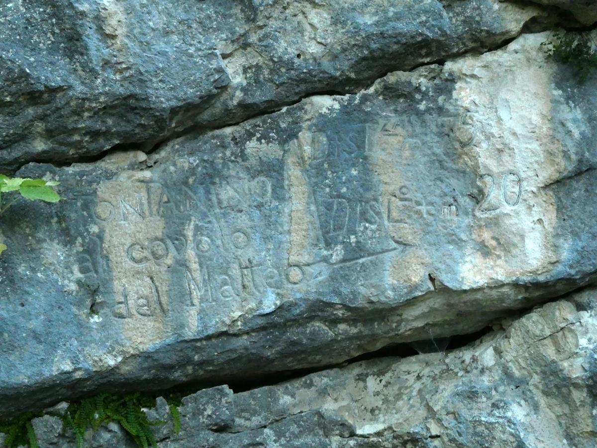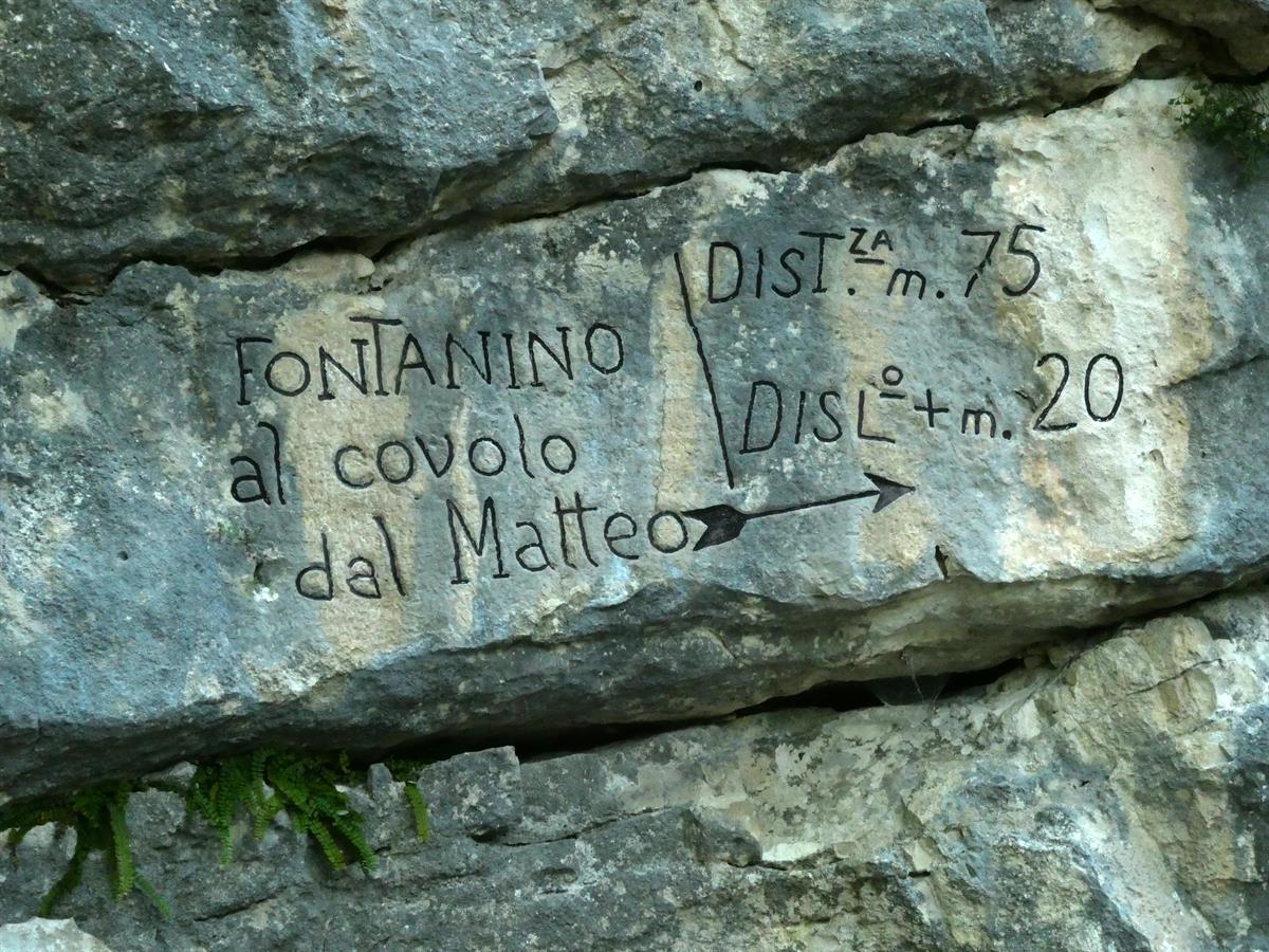 Iscrizione di servizio indicante una fonte presso la cavità nota come "Cavolo dal Matteo", lungo la "Strada degli Alpini".