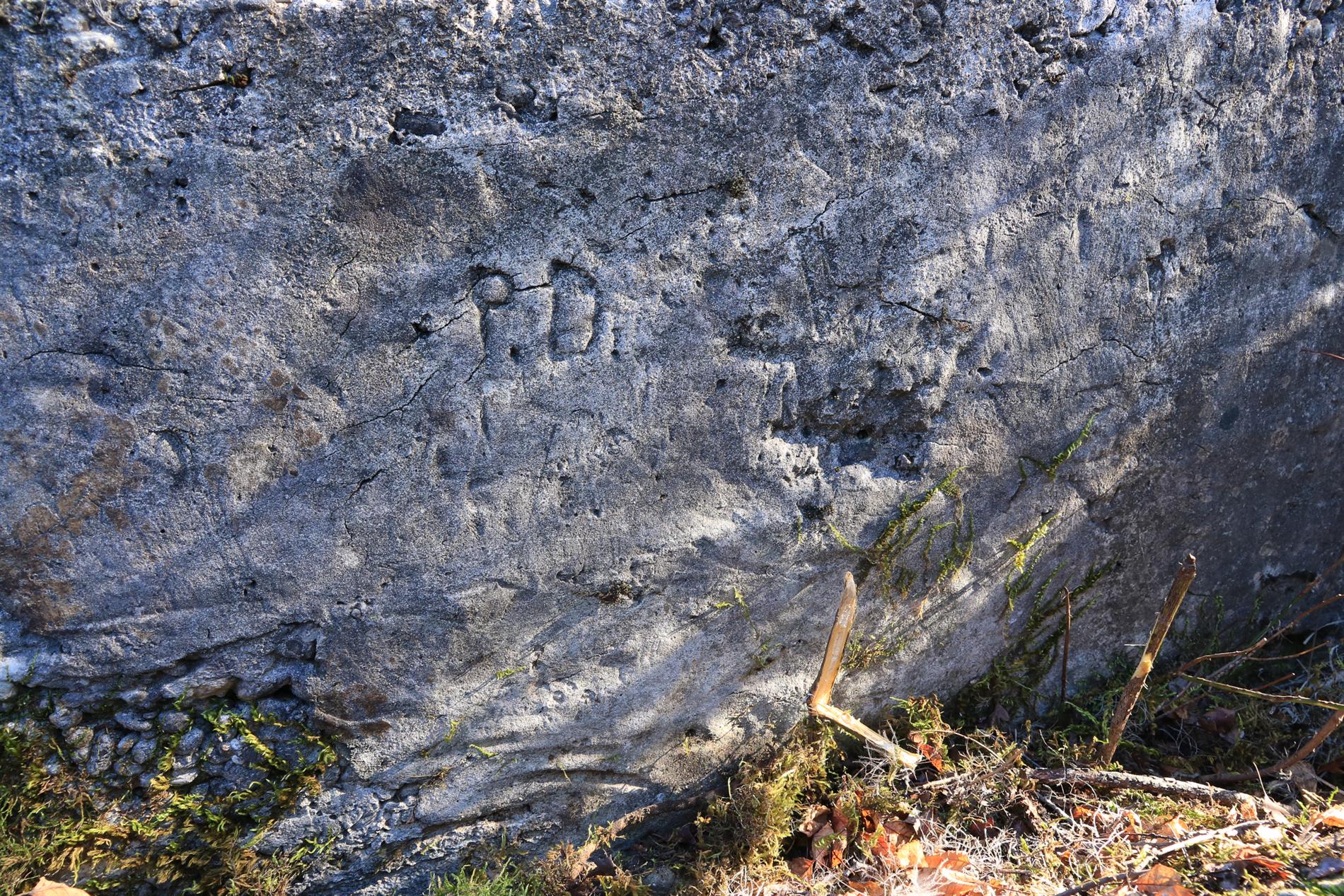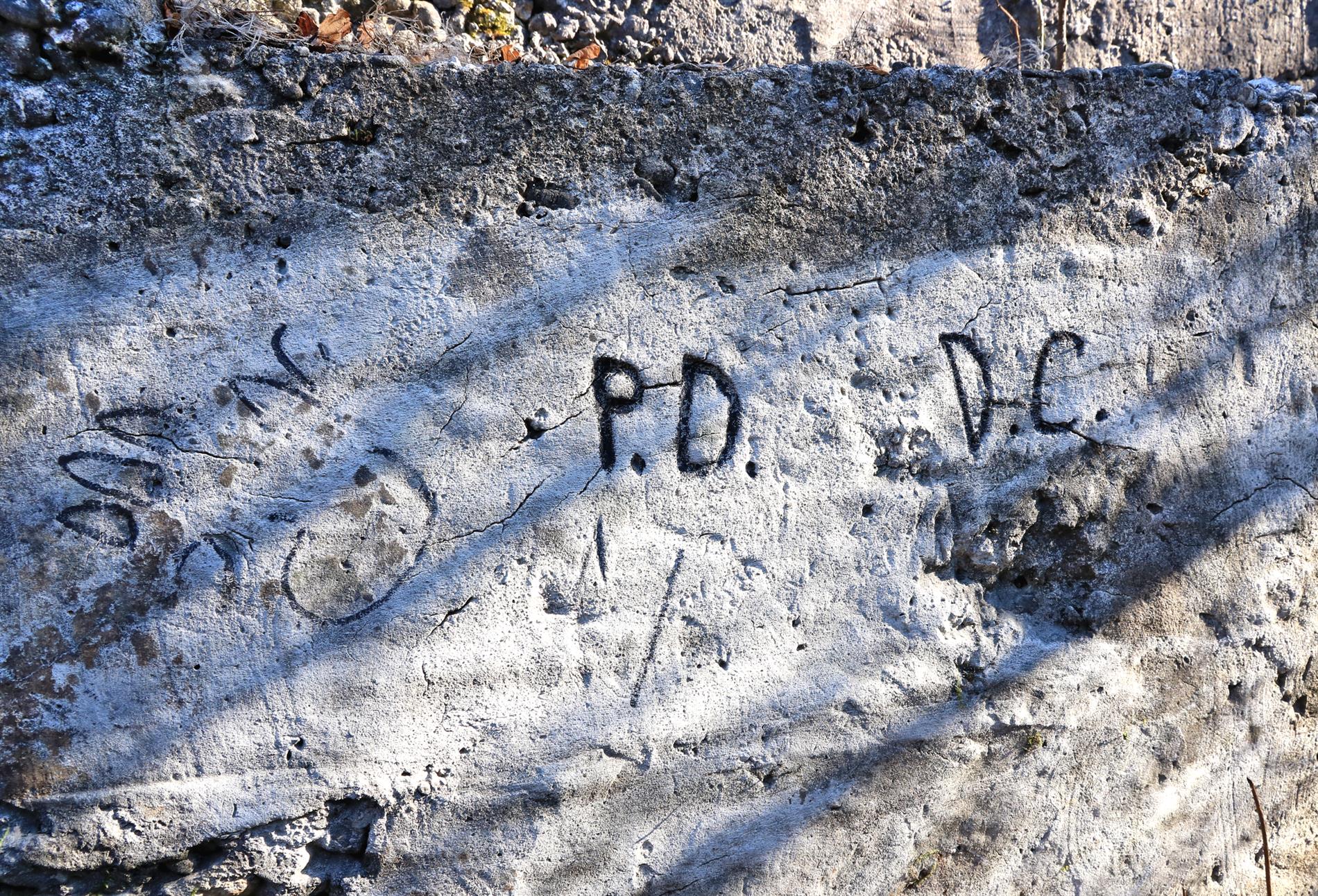 Iscrizione raffigurante l'impronta del palmo di una mano destra e le iniziali di due nominativi di militari italiani ("P.D." e "D.C."), impresse nel cemento fresco del parapetto di una trincea blindata posta appena ad ovest della Quota 118 del Monte Sei Busi, a poca distanza dal complesso epigrafico lasciato dal fante Guerra Guerino dell'88° Reggimento Fanteria della Brigata Friuli fra il maggio e il giugno del 1916 (cfr. cod. 004103).