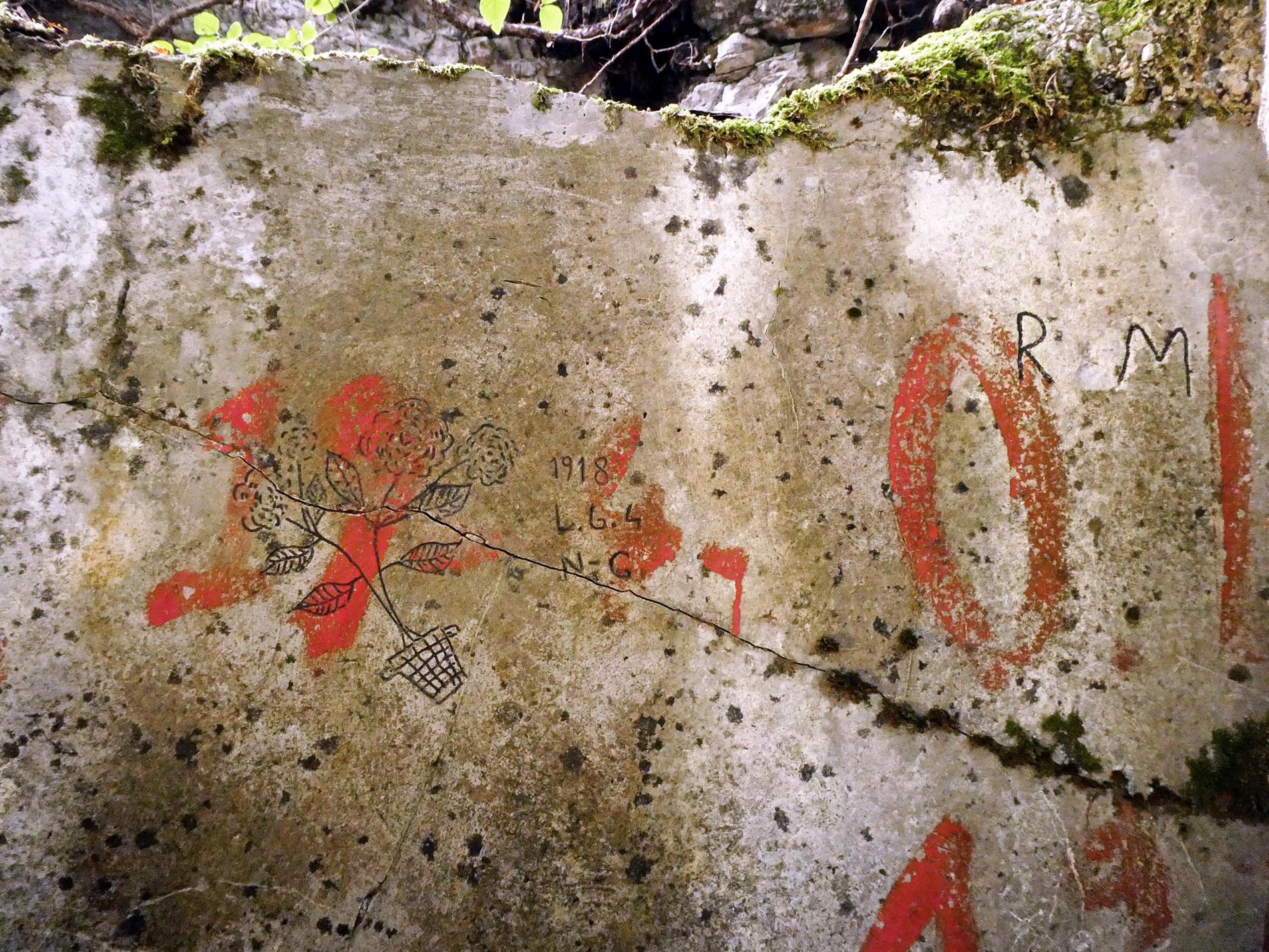 Iscrizione raffigurante un vaso di fiori con iniziali di militari - Cima Vai