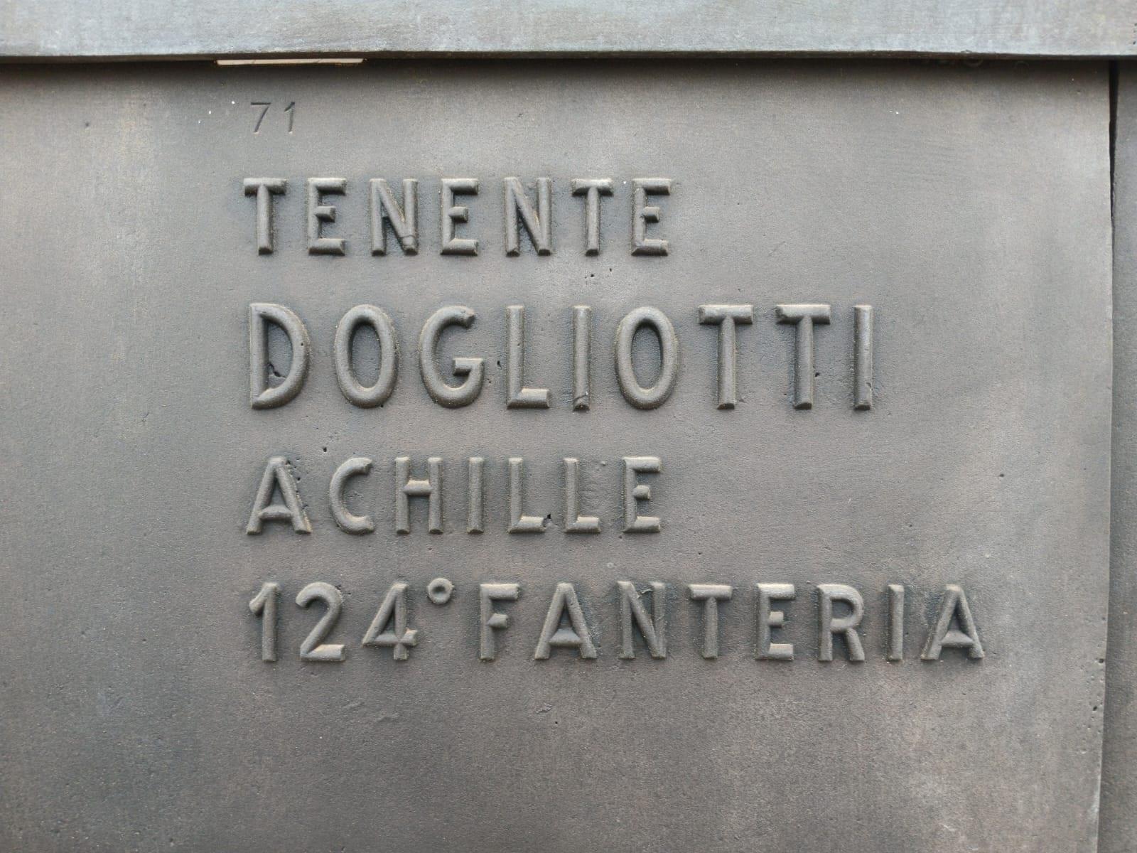 La trincea che custodisce questo graffito, nel giugno del 1916 risultava denominata Trincea Dogliotti. Tale riferimento toponomastico bellico risulta ispirato alla memoria del Tenente di complemento Achille Dogliotti, classe 1876, nativo di Borgomale (Cuneo), in forza al 124° Reggimento Fanteria. Egli morì il 1° febbraio 1916 presso l'Ospedaletto da Campo n° 85 attivo in Turriaco, a causa di ferite riportate in combattimento, subite molto verosimilmente nel settore del Monte Sei Busi. La sua salma riposa presso il Sacrario di Redipuglia.