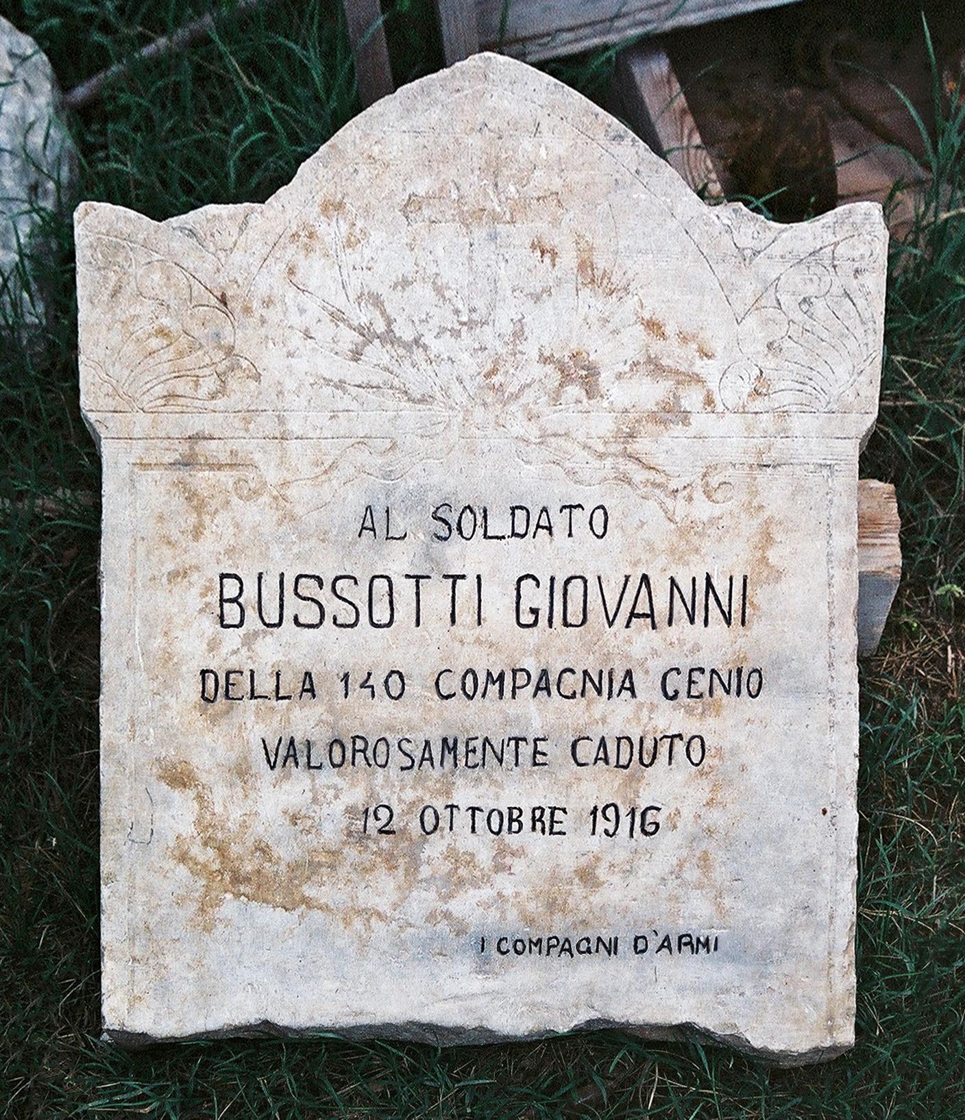 La lapide al soldato Giovanni Bussotti era originariamente collocata nel Cimitero di guerra Gabria n. 2 "Brigata Pinerolo" di Gabria. In base all'elenco dei caduti redatto dai reparti cimiteriali austro-ungarici nell'estate 1918 la lapide è da attribuire alla sepoltura n. 136 del Soldato Giovanni Bussotti della 140ª Compagnia del 2° Reggimento Genio Zappatori, morto il 12 ottobre 1916 per ferite riportate in combattimento (come da Albo d'Oro).