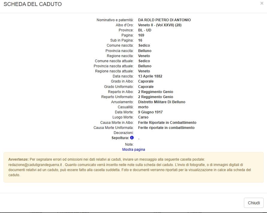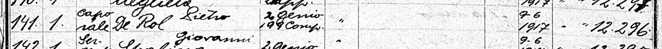 In base all’elenco dei caduti redatto dai reparti cimiteriali austro-ungarici nell’estate 1918, la lapide è da attribuire alla sepoltura n. 141 del Caporale Pietro Da Rold (erroneamente riportato come De Rol) della 199ª Compagnia del 2° Reggimento Genio Zappatori, morto il 9 giugno 1917 per ferite riportate in combattimento (come da Albo d’Oro).