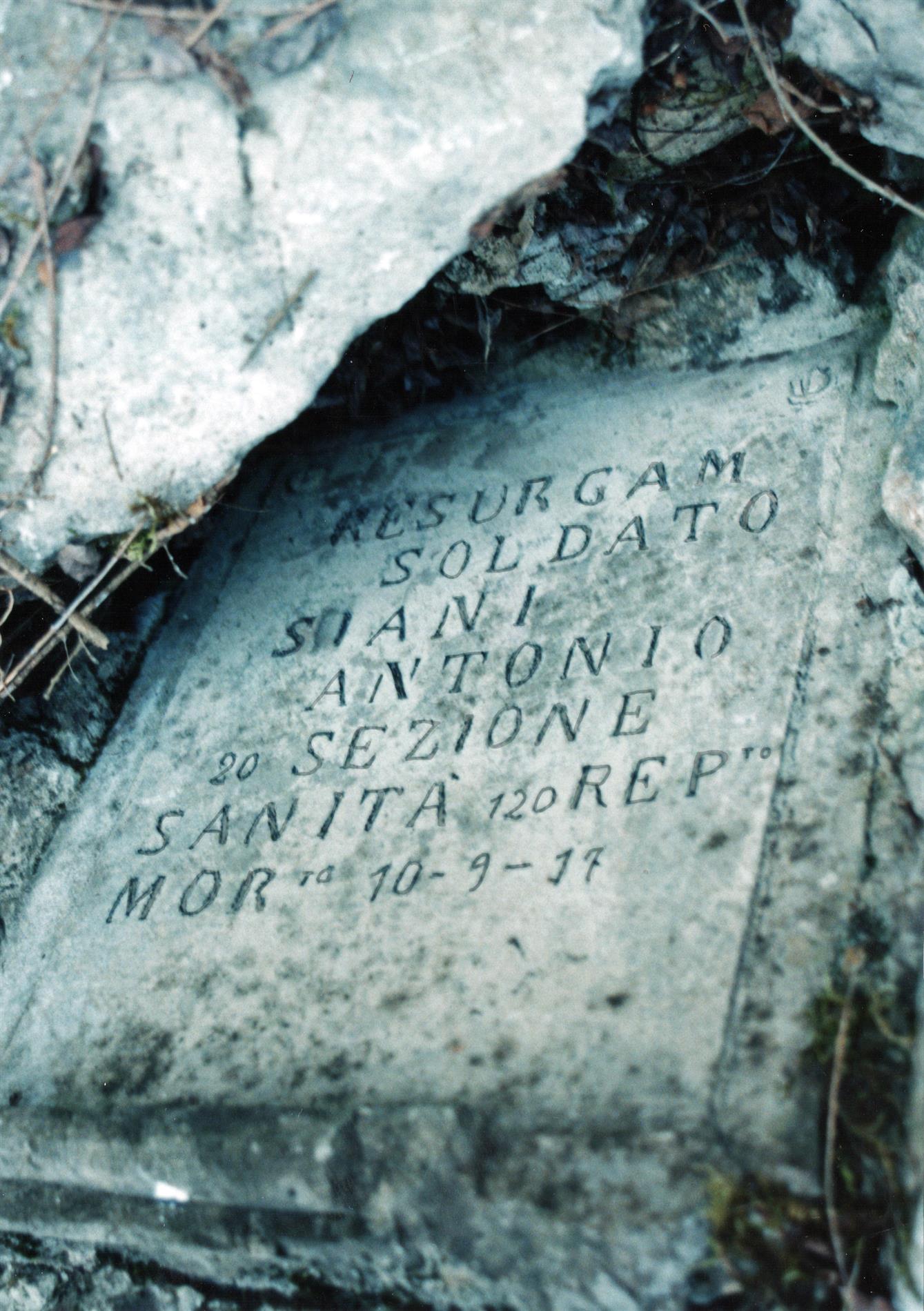 La lapide in oggetto, purtroppo scomparsa, giaceva nel dismesso Cimitero di Guerra "Maggiore La Villa" di Micoli e ricordava il Soldato Siani Antonio figlio di Giuseppe, nato il 17 gennaio 1885 a Cava dei Tirreni (NA), distretto militare di Salerno; il Caduto apparteneva alla 10ª Compagnia di Sanità e morì il 17 settembre 1917 nella 20ª Sezione di Sanità per ferite riportate in combattimento (come da Albo d’Oro).
