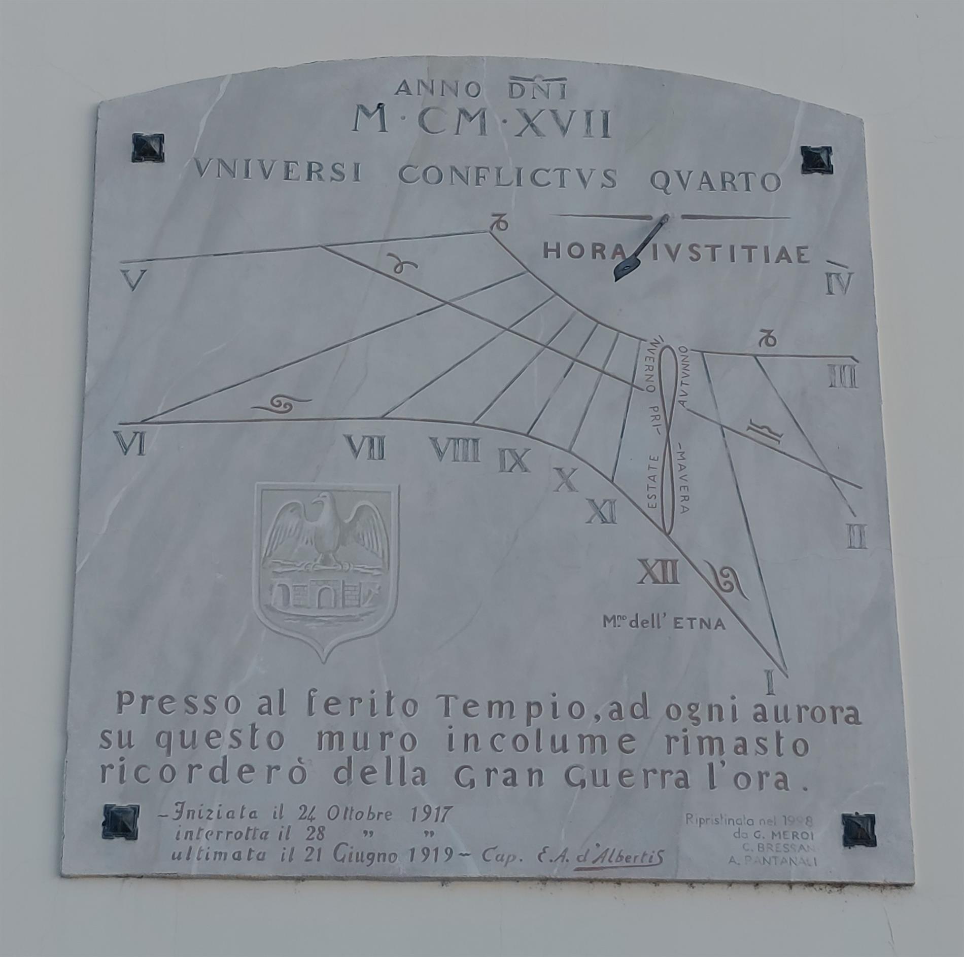 ANNO DNI (domini) / M CM XVII / UNIVERSI CONFLICTUS QUARTO / HORA IVSTITIAE / Presso al ferito Tempio, ad ogni aurora/ su questo muro incolume rimasto/ricorderò della Gran Guerra l'ora. / Iniziata il 24 Ottobre 1917 / interrotta il 28 "" / Ultimata il 21 Giugno 1919 - Cap. E.A. d'Albertis / Ripristinato nel 1998/da G. MEROI/ C.BRESSAN/ A.PANTANALI