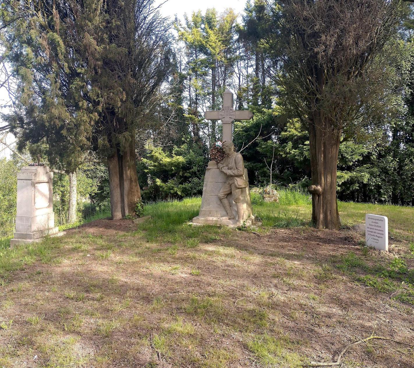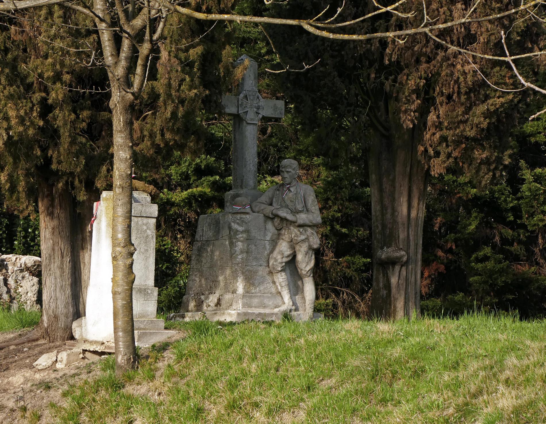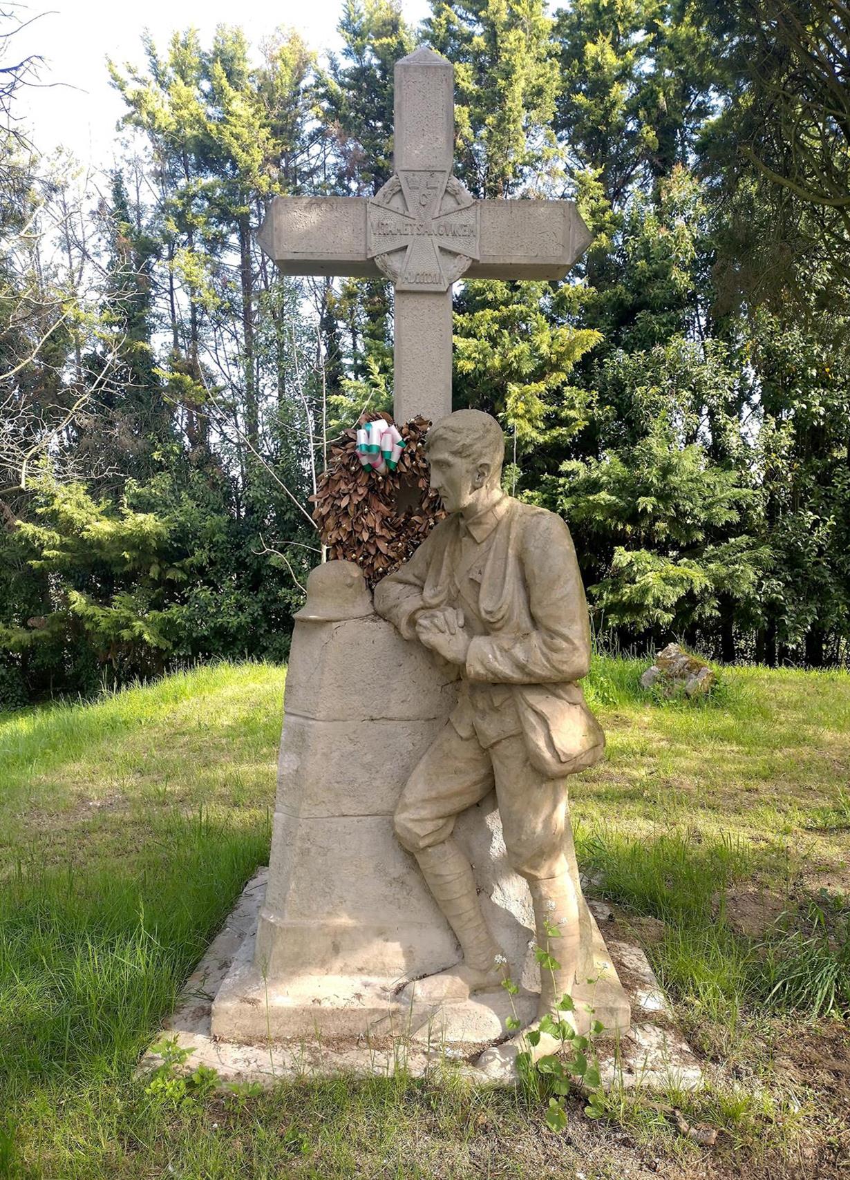 Realizzato dallo scultore professionista Oberleutnant Elischer, il monumento venne gravemente danneggiato gravemente subito dopo la guerra: l'iscrizione del reparto fu cancellata, la testa originaria del soldato baffuto e con il capo chino fu sostituita con un'altra in cemento raffigurante un volto giovane; infine e soprattutto, nei decenni successivi, la paternità del monumento venne attribuita ad un cadetto di artiglieria caduto di etnia ceca, forse perché sembra a quell'ufficiale facesse riferimento l'unica iscrizione trovata su una lamiera nei pressi del monumento. Non è improbabile che la famiglia dello stesso abbia commissionato il cambiamento della testa con quella raffigurante il congiunto.