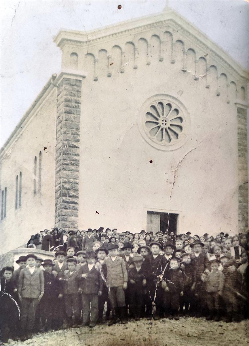 d. La popolazione di Sdraussina davanti alla nuova chiesa (fonte: Portelli I., "Sdraussina", op. cit.)