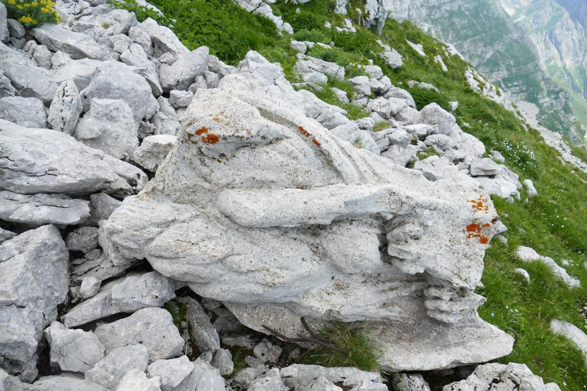 Qualche centinaio di metri sotto il rifugio si può fare una breve deviazione, per un'interessante ricerca storica. Tra le migliaia di rocce carsiche tutte uguali, con pazienza, si prova a individuare una in particolare, che in realtà seppur rovesciata, nasconda una scultura. Si tratta di una delle quattro grandi aquile in granito, che decoravano la maestosa facciata del rifugio-monumento dedicato ad Alberto Picco, il conquistatore del monte Nero, inaugurato nel 1928 e demolito nel 1951. Della scultura, seppur molto rovinata, (purtroppo !) rimangono un'ala e l'impronta degli artigli.
