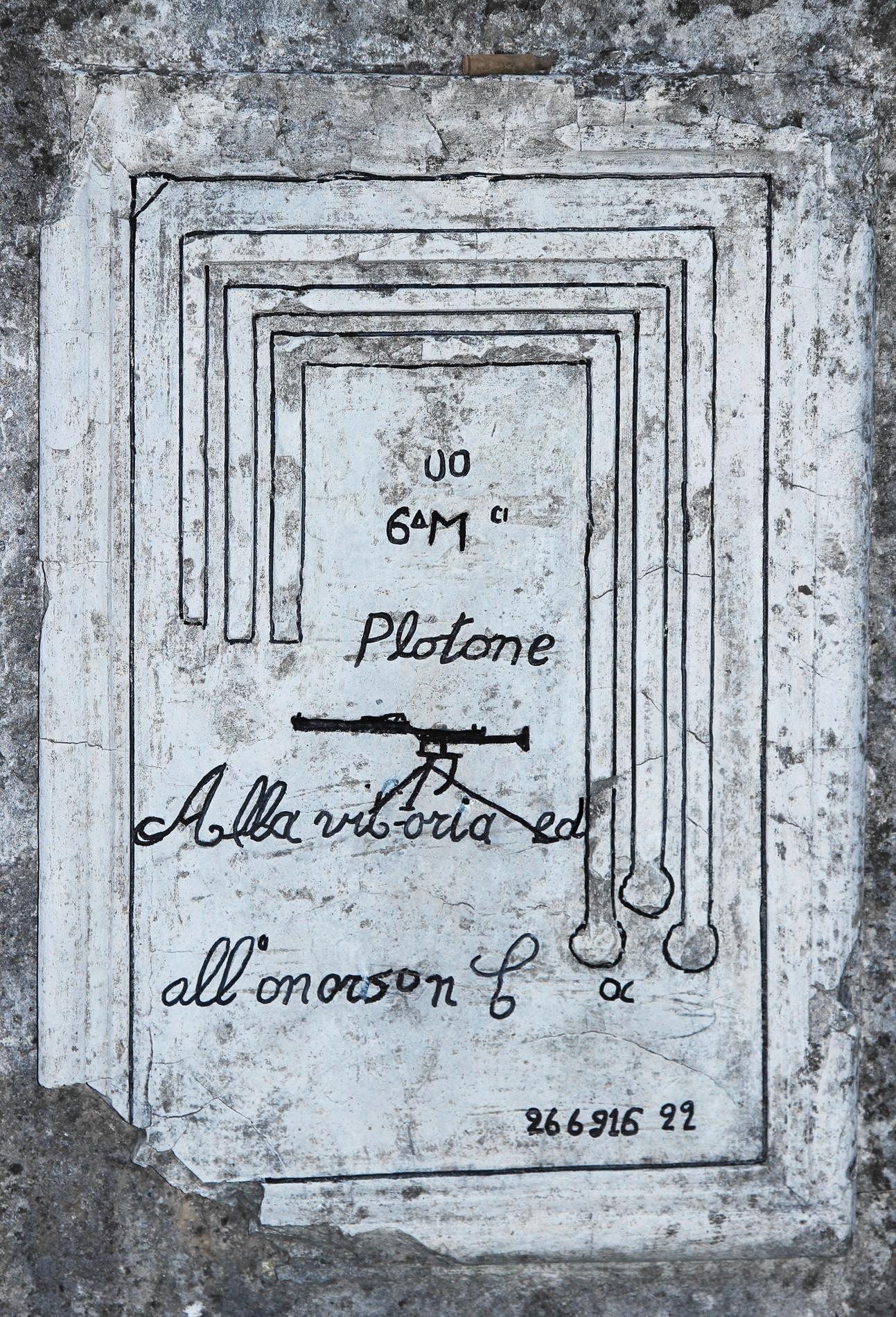 Le incisioni riscontrabili sulla targa sono state lasciate dai militari italiani in due momenti diversi, come si può facilmente intuire dall'analisi stilistica dei diversi tratti incisori, dalla parziale sovrapposizione degli stessi e dal significato che se ne può estrarre.