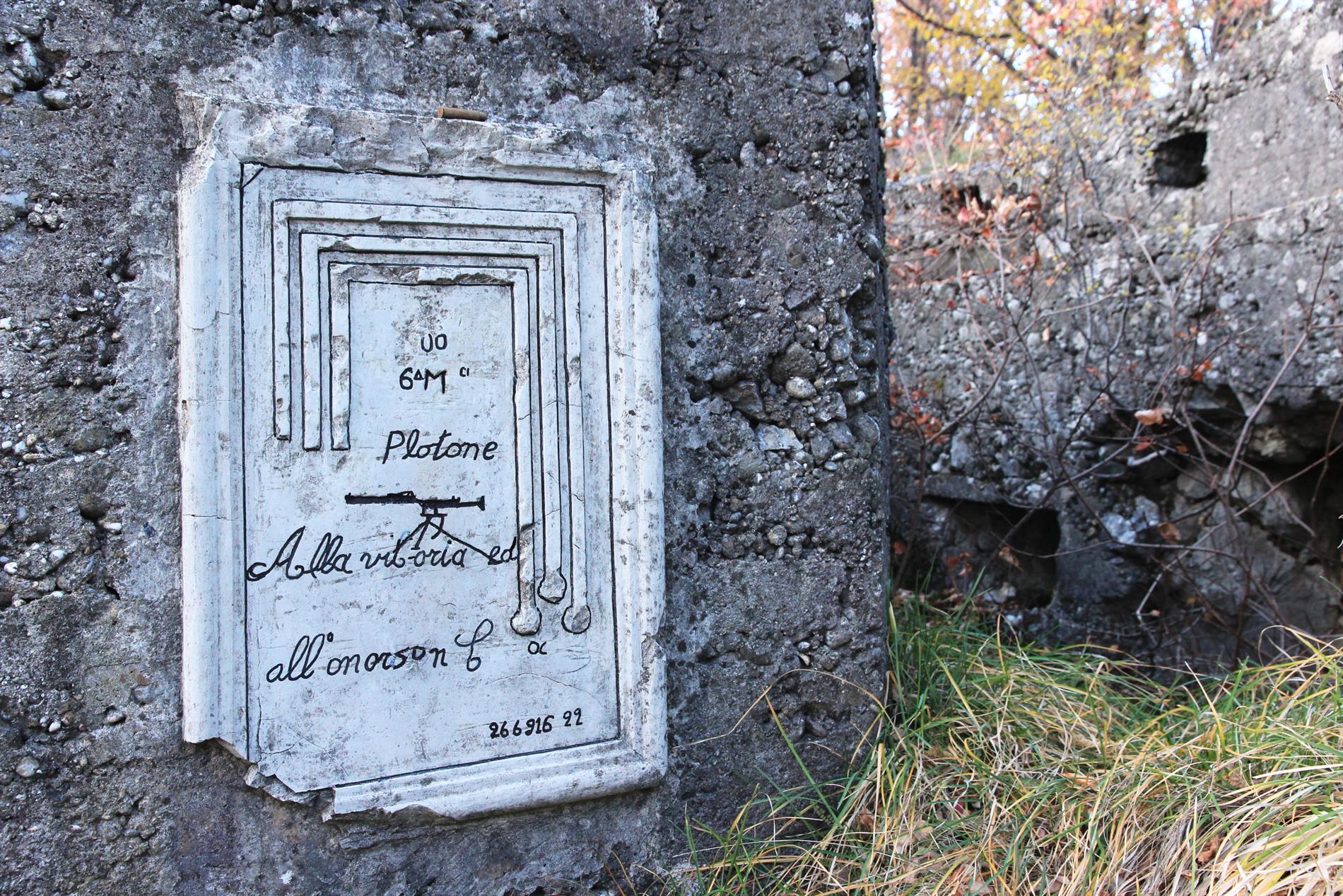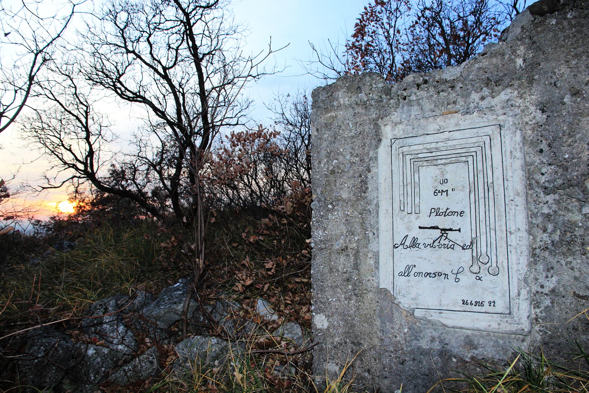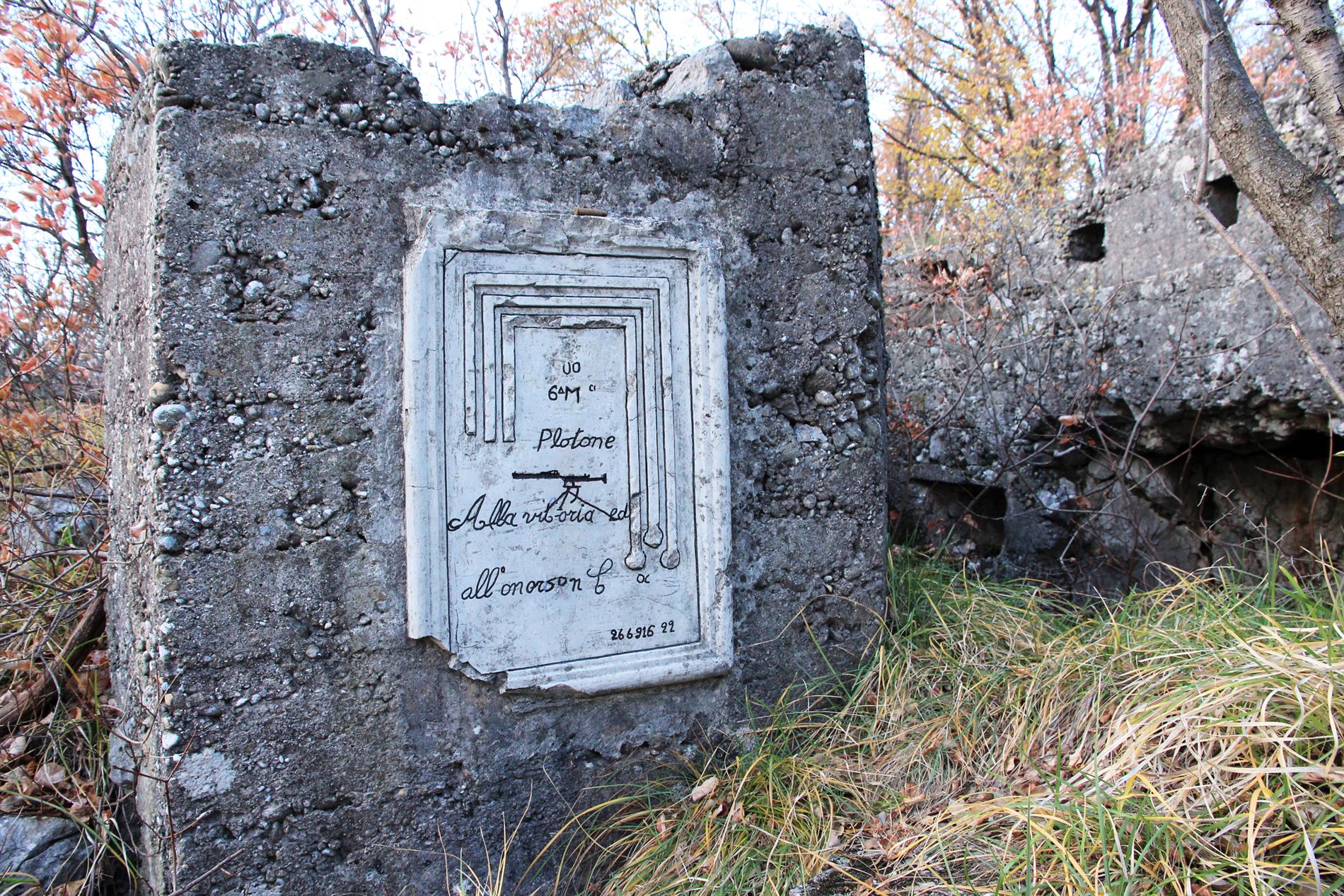La targa compare all'interno della trincea in cemento che, fra l'ultima decade del luglio 1915 (Seconda Battaglia dell'Isonzo, fase che portò alla conquista italiana della posizione) e la prima decade dell'agosto 1916 (Sesta Battaglia dell'Isonzo, evento a cui conseguì la progressione italiana per alcuni chilometri nell'entroterra carsico), costituì l'asse fondamentale del sistema trincerato avanzato tenuto dal Regio Esercito lungo il ciglione che del Monte Sei Busi digrada verso le Alture di Vermegliano. Trincea che, successivamente all'agosto del 1916 fino alla ritirata italiana conseguita allo sfondamento austro-tedesco di Caporetto (scattata sul Carso il 27 ottobre del 1917), venne inglobata in quello che al settembre del 1917 rappresentava il settimo sistema fortificato arretrato della 3ª Armata, ossia la Linea di San Martino