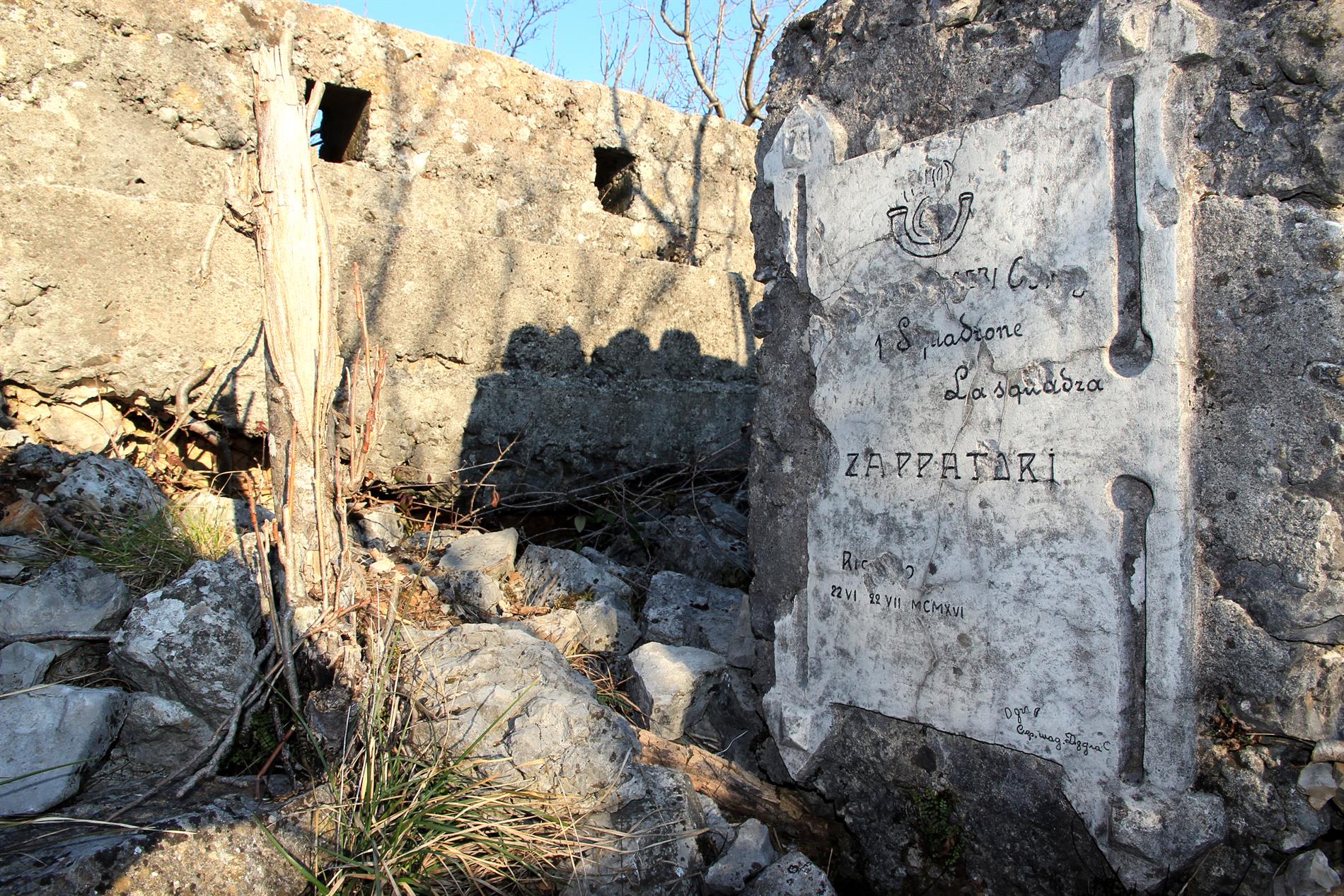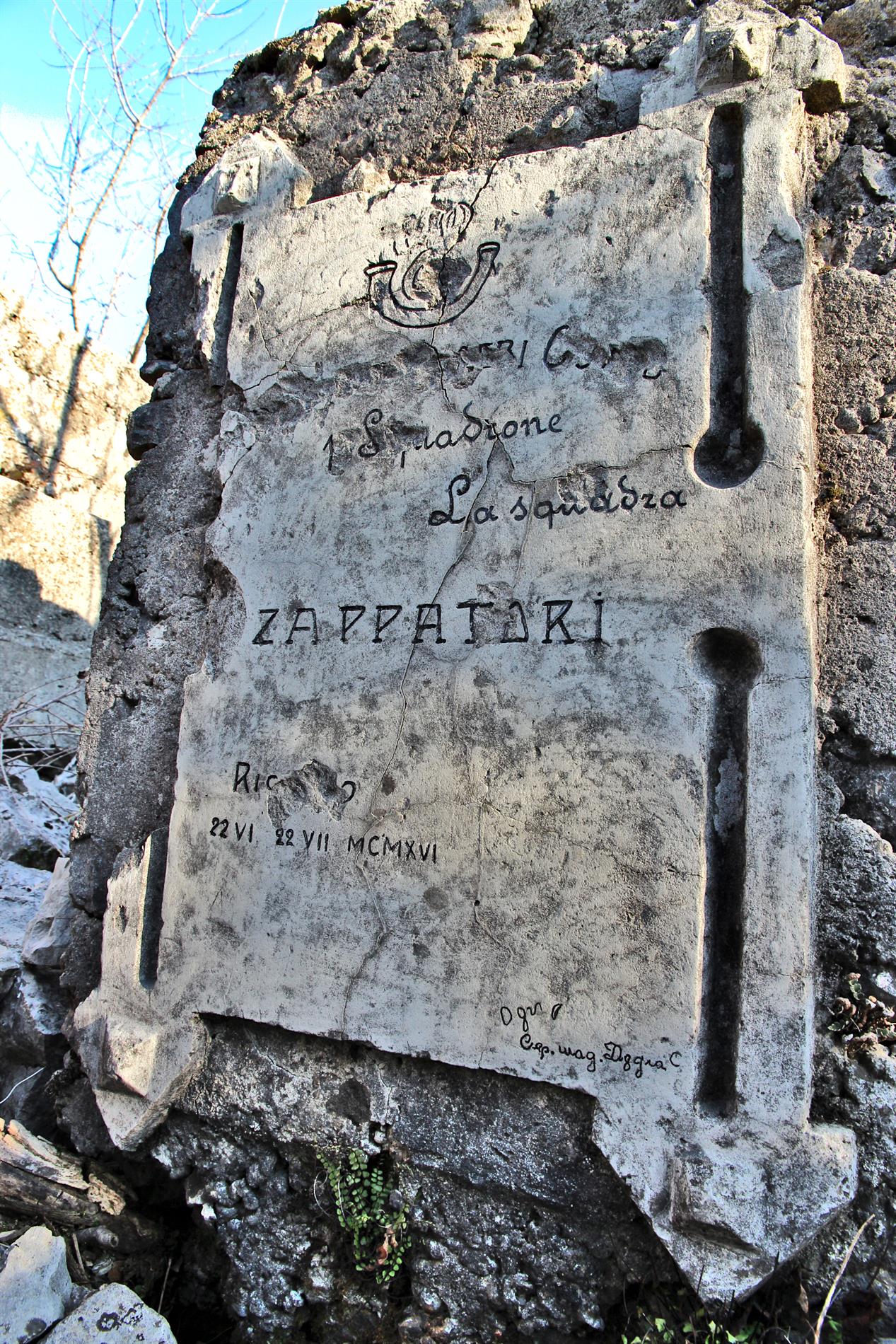 Targa realizzata come "Ricordo" dalla Squadra Zappatori del 1° Squadrone del Reggimento Cavalleggeri Guide (19°) nel luglio del 1916, lungo la trincea che dalla seconda metà del luglio 1915 alla seconda settimana dell'agosto del 1916 costituì l'asse fortificatorio principale della prima linea difensiva italiana fra il Monte Sei Busi e le Alture di Vermegliano.