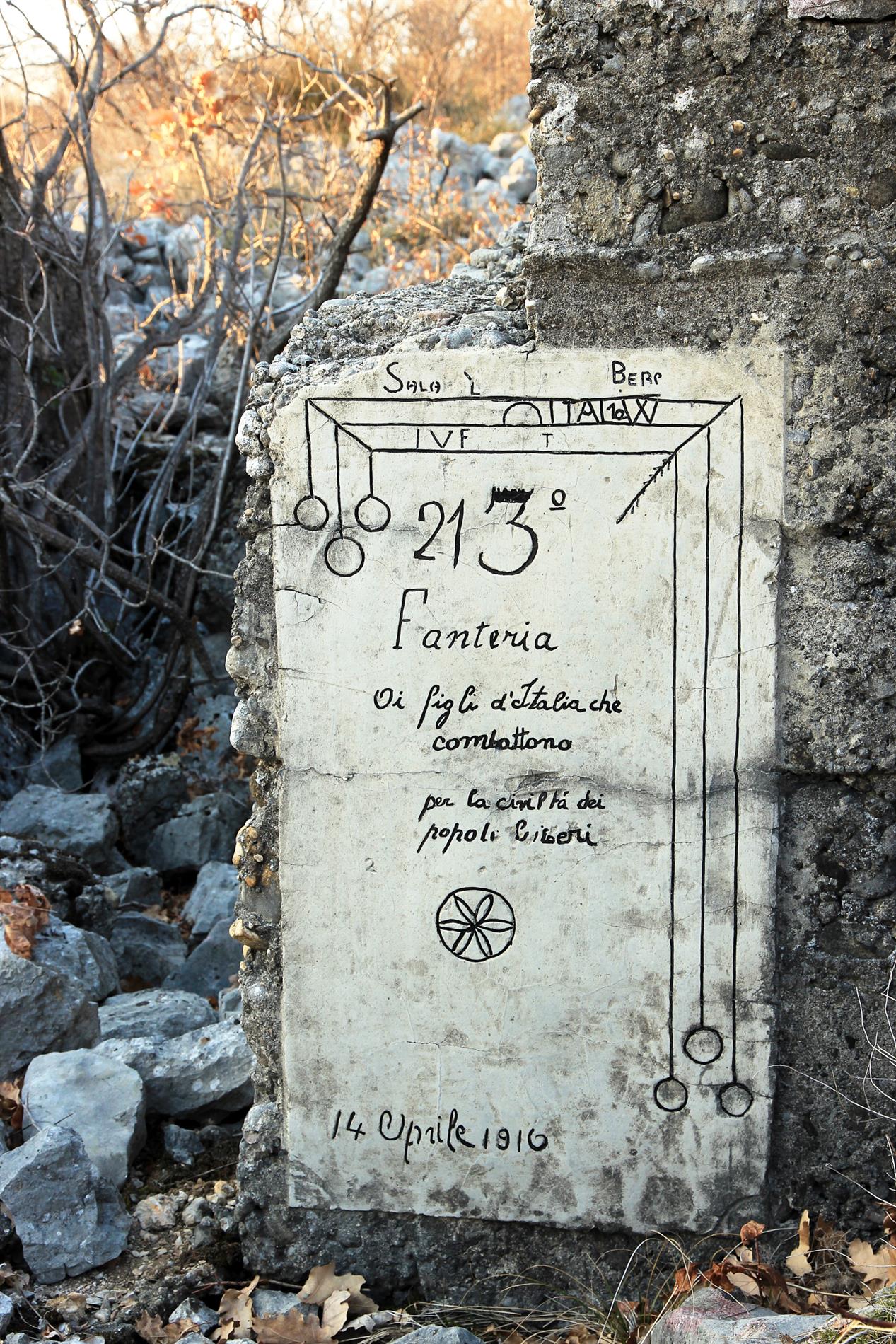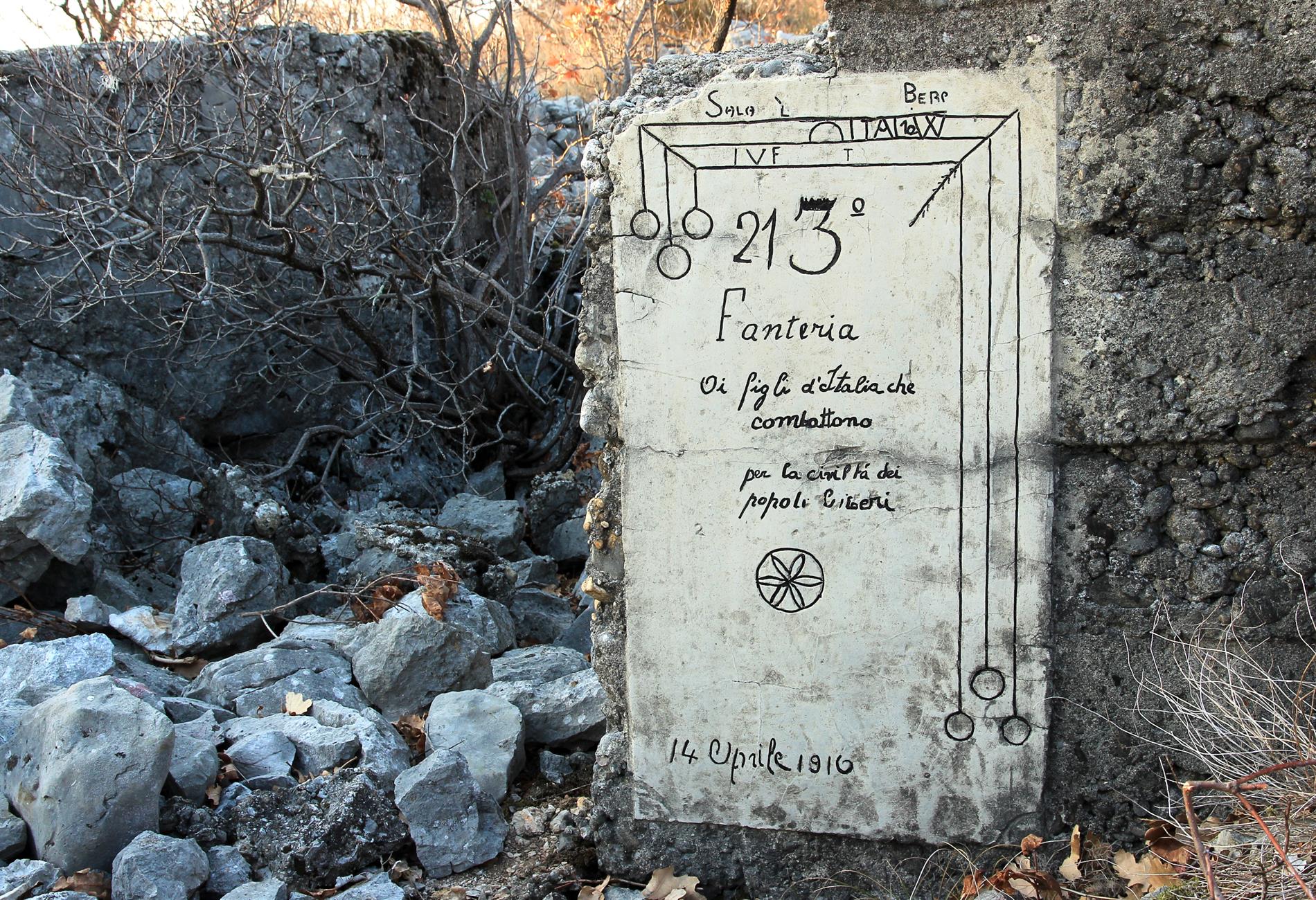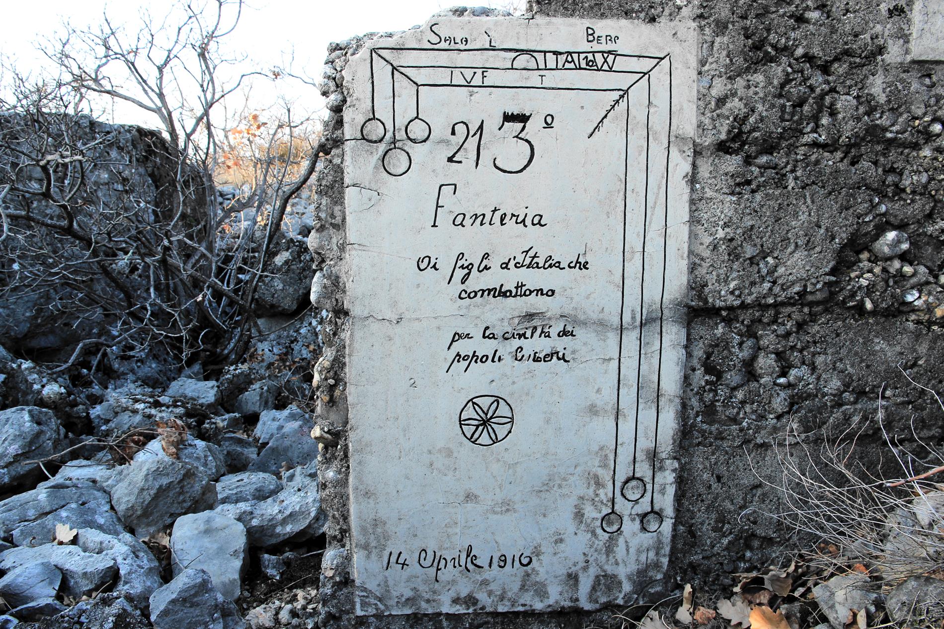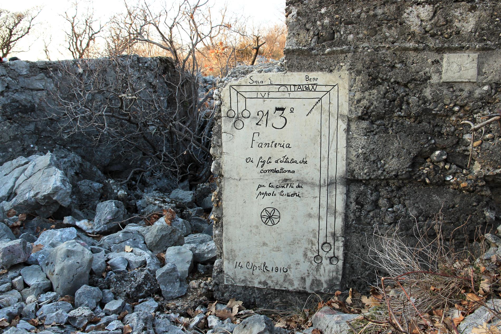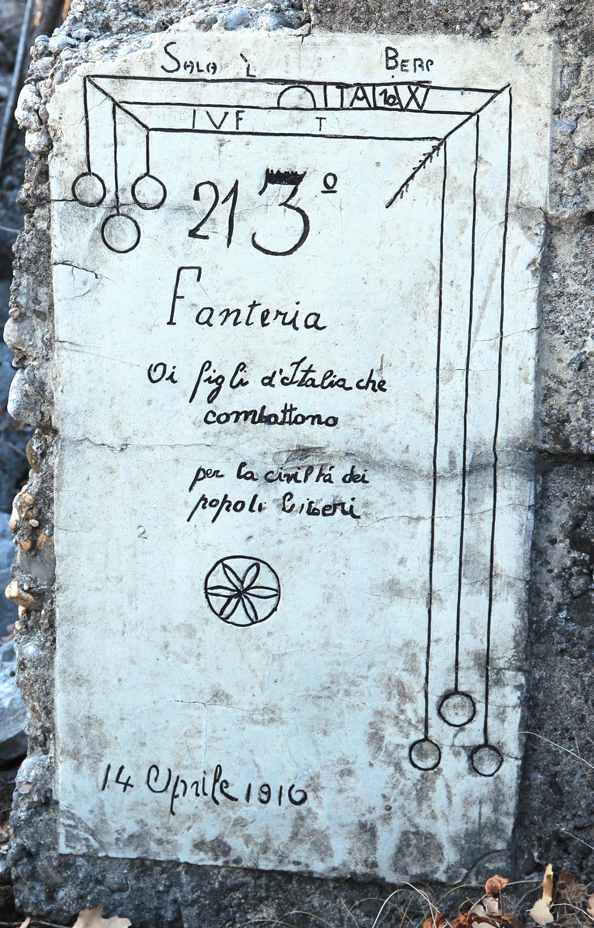 Targa posta dai fanti del III Battaglione del 21° Reggimento Fanteria, appartenente alla Brigata Cremona, il 14 Aprile del 1916. L'epigrafe si trova lungo la trincea rafforzata in cemento che, in quel periodo, costituiva l'asse fortificatorio principale del sistema difensivo italiano di prima linea fra il Monte Sei Busi e le Alture di Vermegliano. Segnatamente, è situata nei pressi della partenza di un camminamento d'approccio, inizialmente scavato nella terra di nessuno in direzione della linea nemica in modo da favorire l'avvicinamento coperto dei reparti destinati all'attacco della stessa, quindi integrato (mediante un sistema di scavi fra loro ortogonali) nel saliente denominato Parallela Pavia. Secondo una cartografia del giugno 1916 appartenente all'Archivio privato di Marco Mantini, siffatto camminamento portava come denominazione la lettera C. Con ogni verosimiglianza, tale identificativo mono-lettera compariva sulla targhetta presente nelle adiacenze della targa in censimento (visibile in una delle foto, sopra a destra).