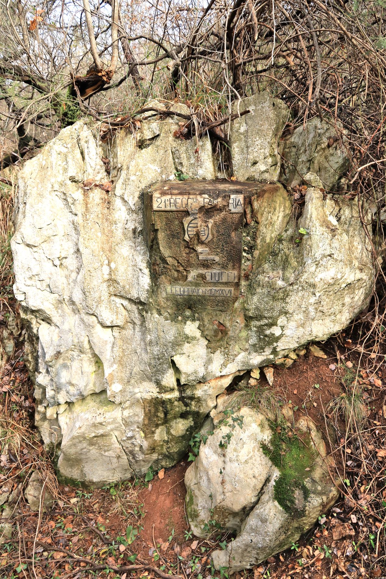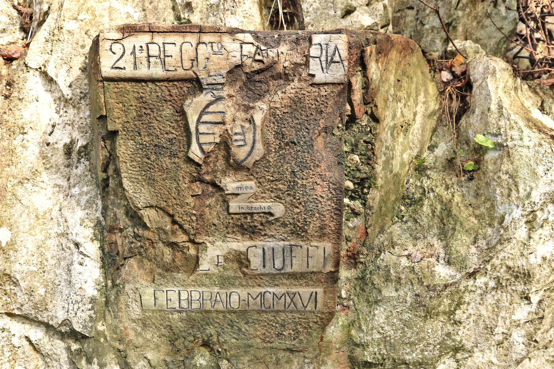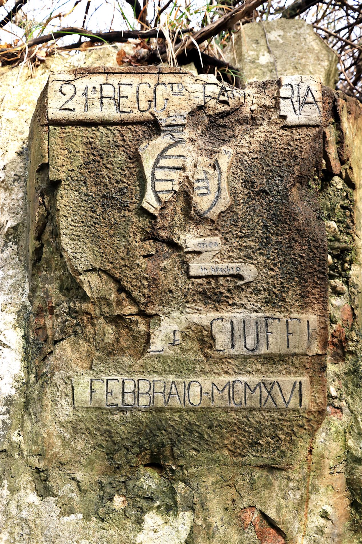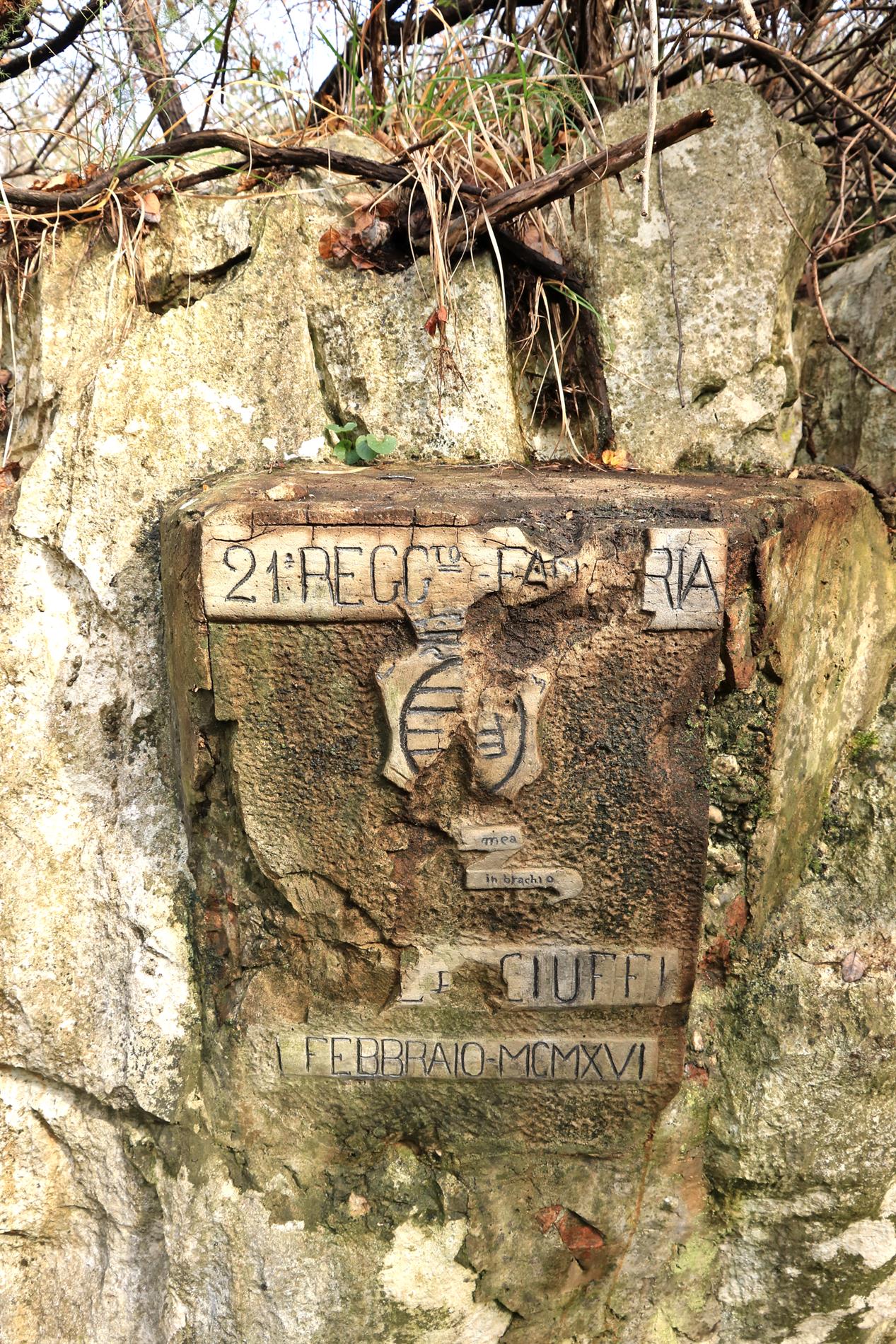 Targa risalente al febbraio del 1916, posta dai fanti del 21° Reggimento Fanteria della Brigata Cremona nella parte bassa di uno dei più profondi valloncelli che intagliano i declivi sud-occidentali del Monte Sei Busi. Ciascuna di queste depressioni morfologiche venne utilizzata dalle truppe italiane sin dall'estate del 1915 per accantonare uomini, mezzi e materiali a poche centinaia di metri dalle trincee più avanzate, in posizione relativamente defilata rispetto al fuoco austro-ungarico. Nel caso del valloncello in parola, la massima concentrazione di baraccamenti e ricoveri si riconosceva presso il Salto delle Rocce, una bancata calcarea che emerge nel settore orientale del valloncello stesso, una cinquantina di metri di dislivello più in alto rispetto alla posizione dell'oggetto in censimento.