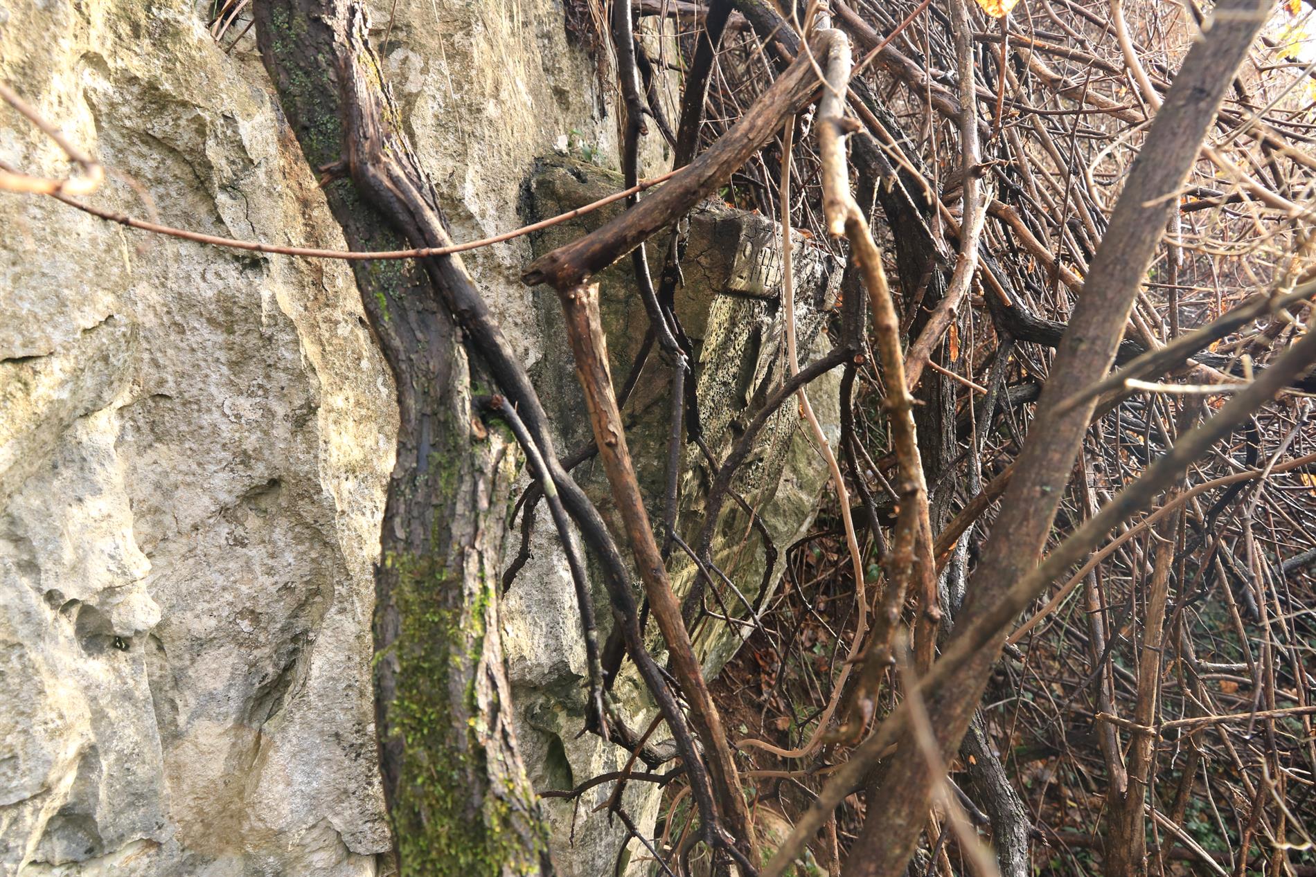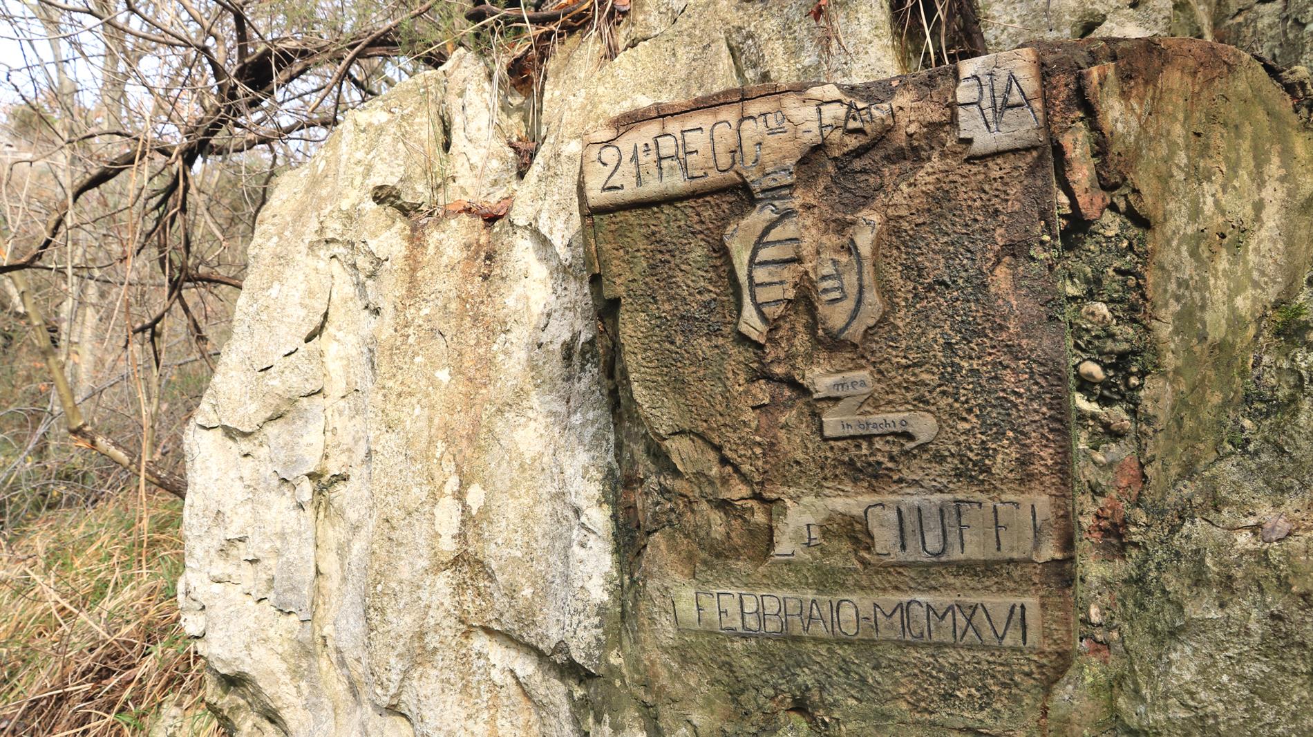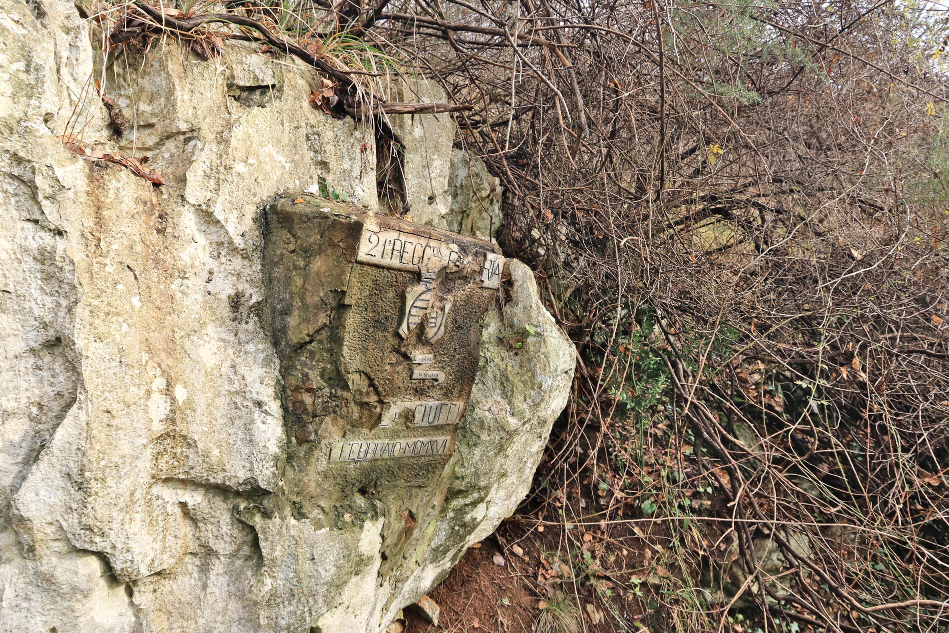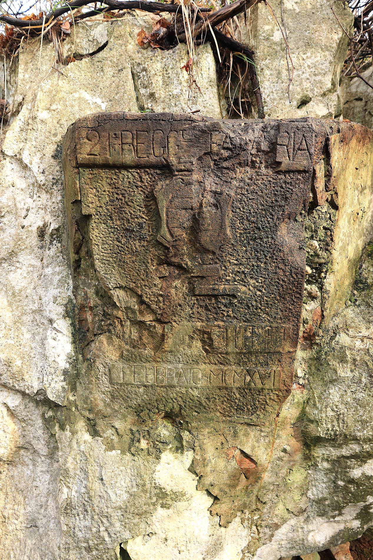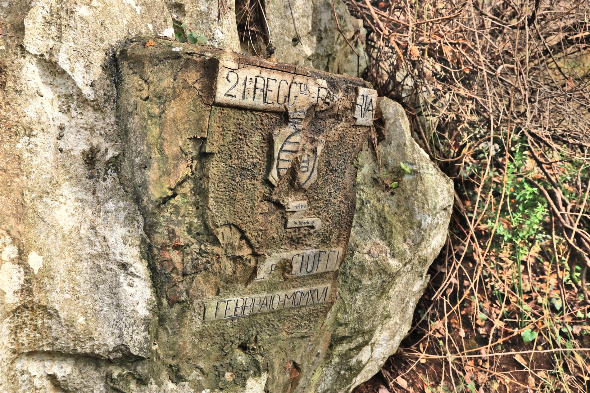 Targa risalente al febbraio del 1916, posta dai fanti del 21° Reggimento Fanteria della Brigata Cremona nella parte bassa di uno dei più profondi valloncelli che intagliano i declivi sud-occidentali del Monte Sei Busi. Ciascuna di queste depressioni morfologiche venne utilizzata dalle truppe italiane sin dall'estate del 1915 per accantonare uomini, mezzi e materiali a poche centinaia di metri dalle trincee più avanzate, in posizione relativamente defilata rispetto al fuoco austro-ungarico. Nel caso del valloncello in parola, la massima concentrazione di baraccamenti e ricoveri si riconosceva presso il Salto delle Rocce, una bancata calcarea che emerge nel settore orientale del valloncello stesso, una cinquantina di metri di dislivello più in alto rispetto alla posizione dell'oggetto in censimento.