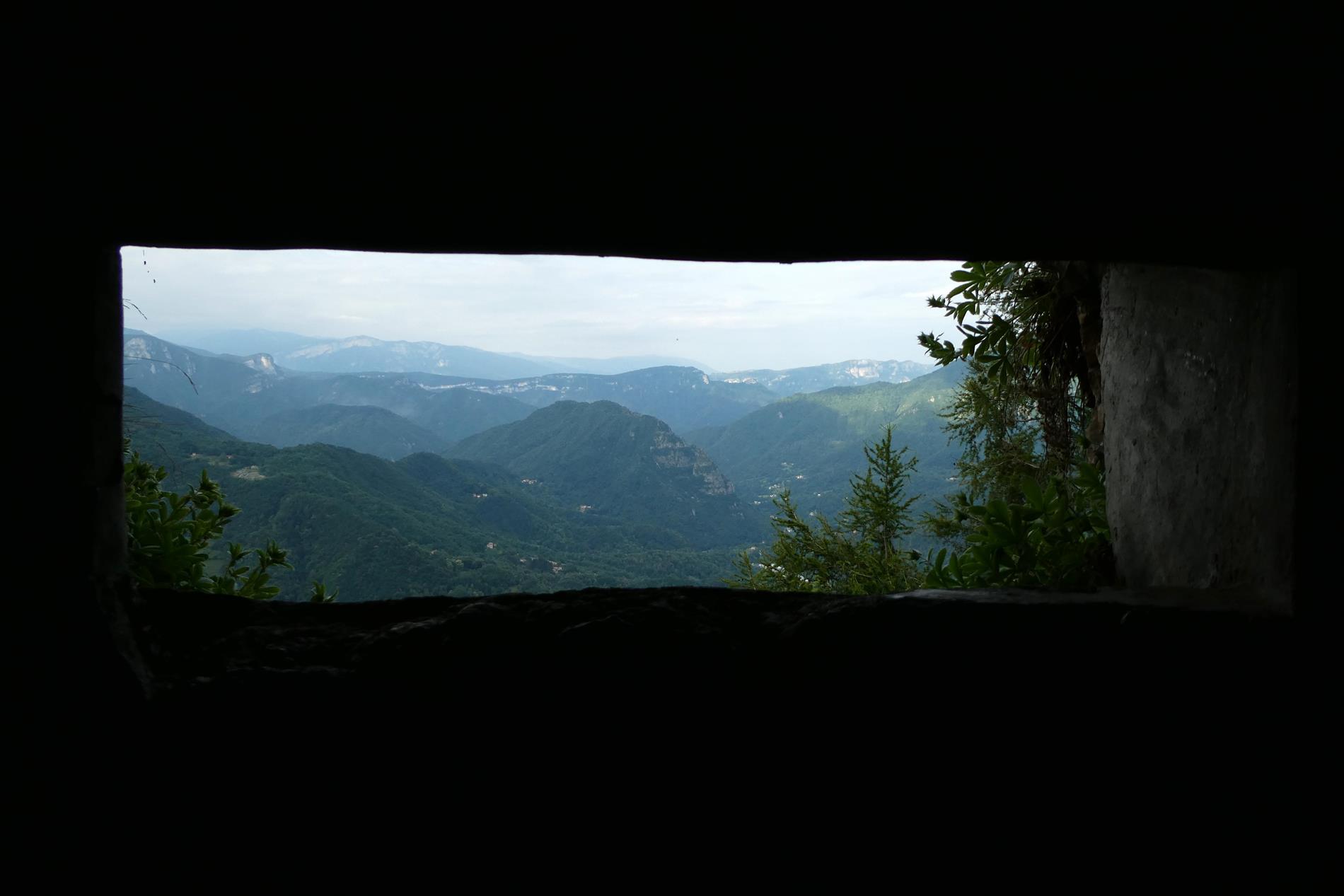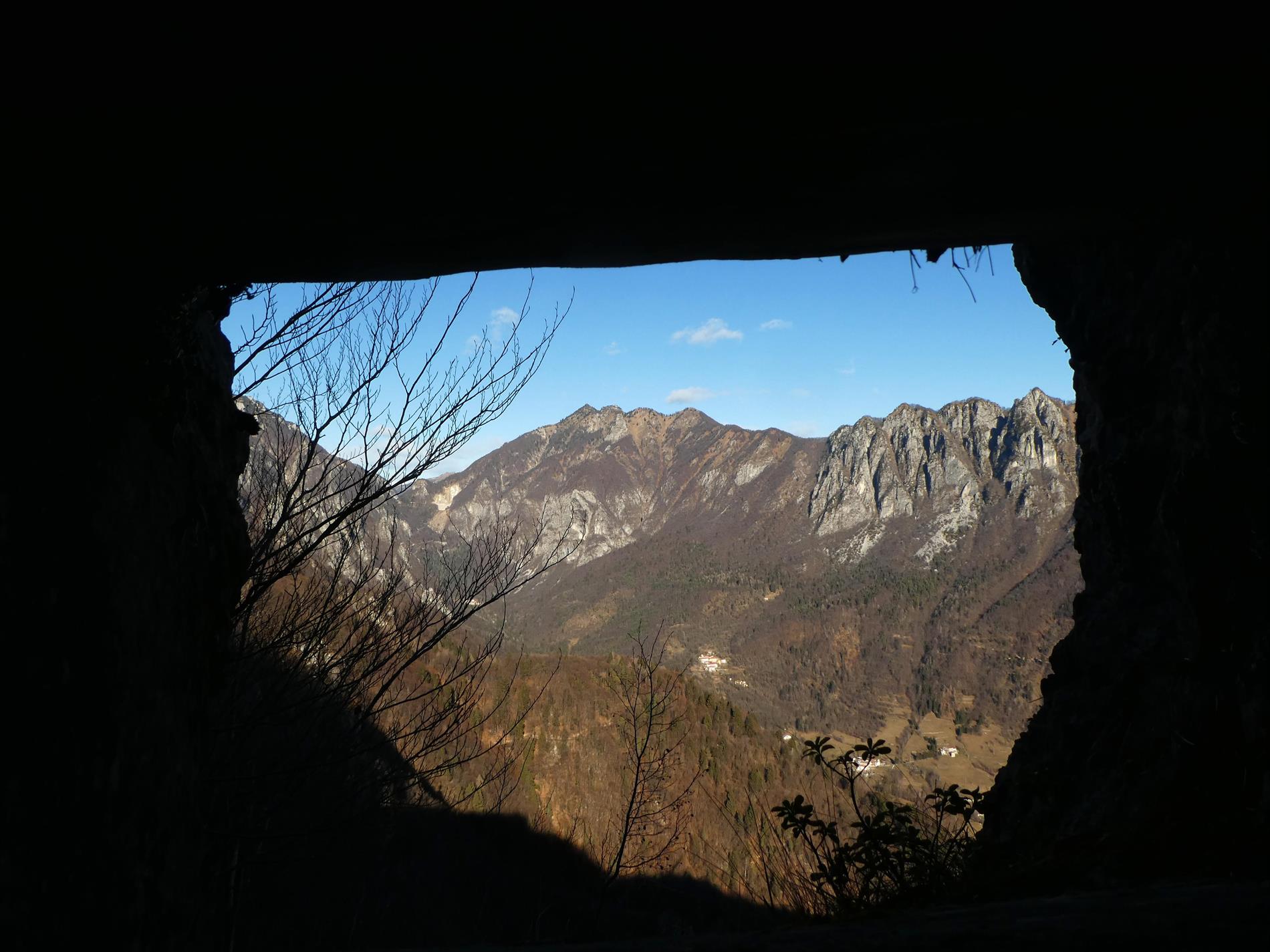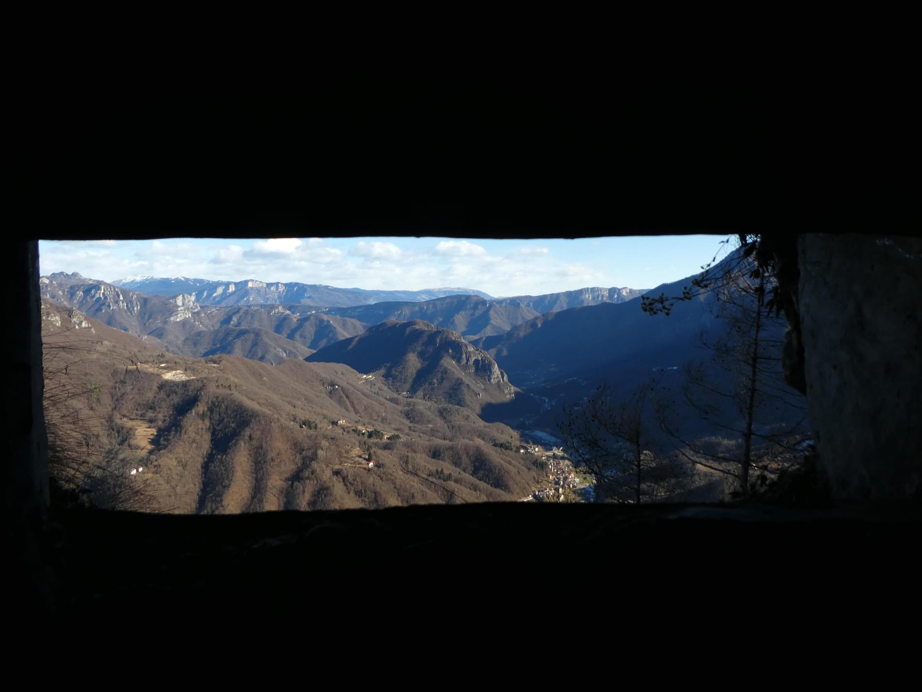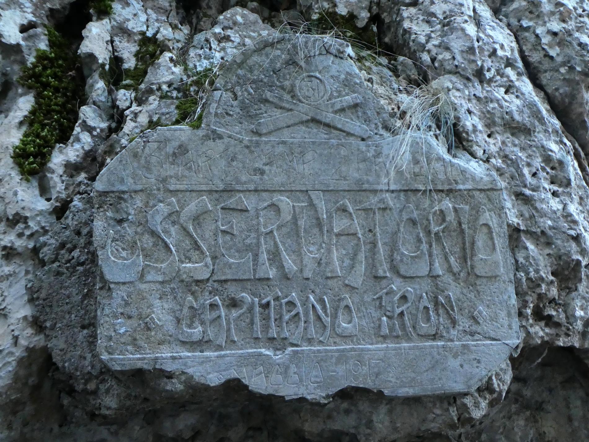 La pregevole targa individua l'osservatorio - dedicato al Capitano Tron - della 2ª Batteria del 31° Reggimento Artiglieria da Campagna, la cui visuale spazia dal Passo della Borcola sino all'abitato di Posina e al Monte Gamonda.