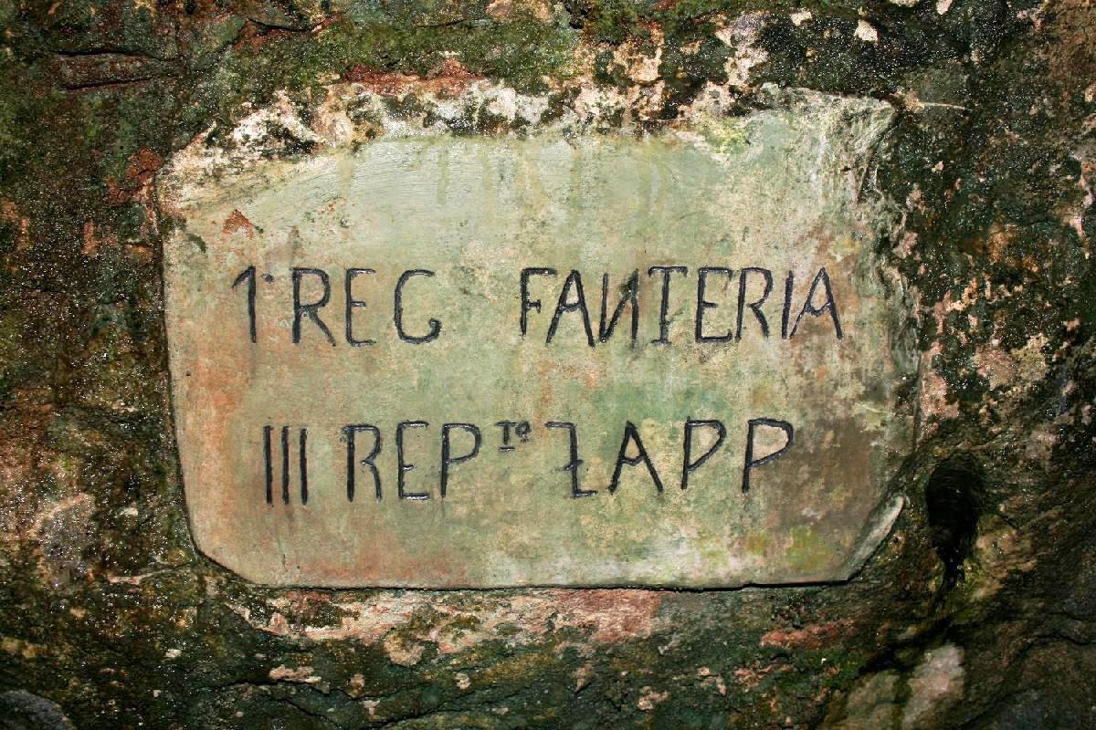 Targa del III Reparto Zappatori del 1° Reggimento di Fanteria Brigata Re, ritrovata presso la Dolina Zappatori, una dolina che, dal novembre 1916 (termine della Nona Battaglia dell'Isonzo) alla fine del maggio 1917 (Decima Battaglia dell'Isonzo) si trovava appena alle spalle della prima linea italiana che fronteggiava la trincea settentrionale austro-ungarica del Saliente di Hudi Log (con la Decima Battaglia, il saliente venne eliminato ed il fronte si spostò di circa 1 km ad est).