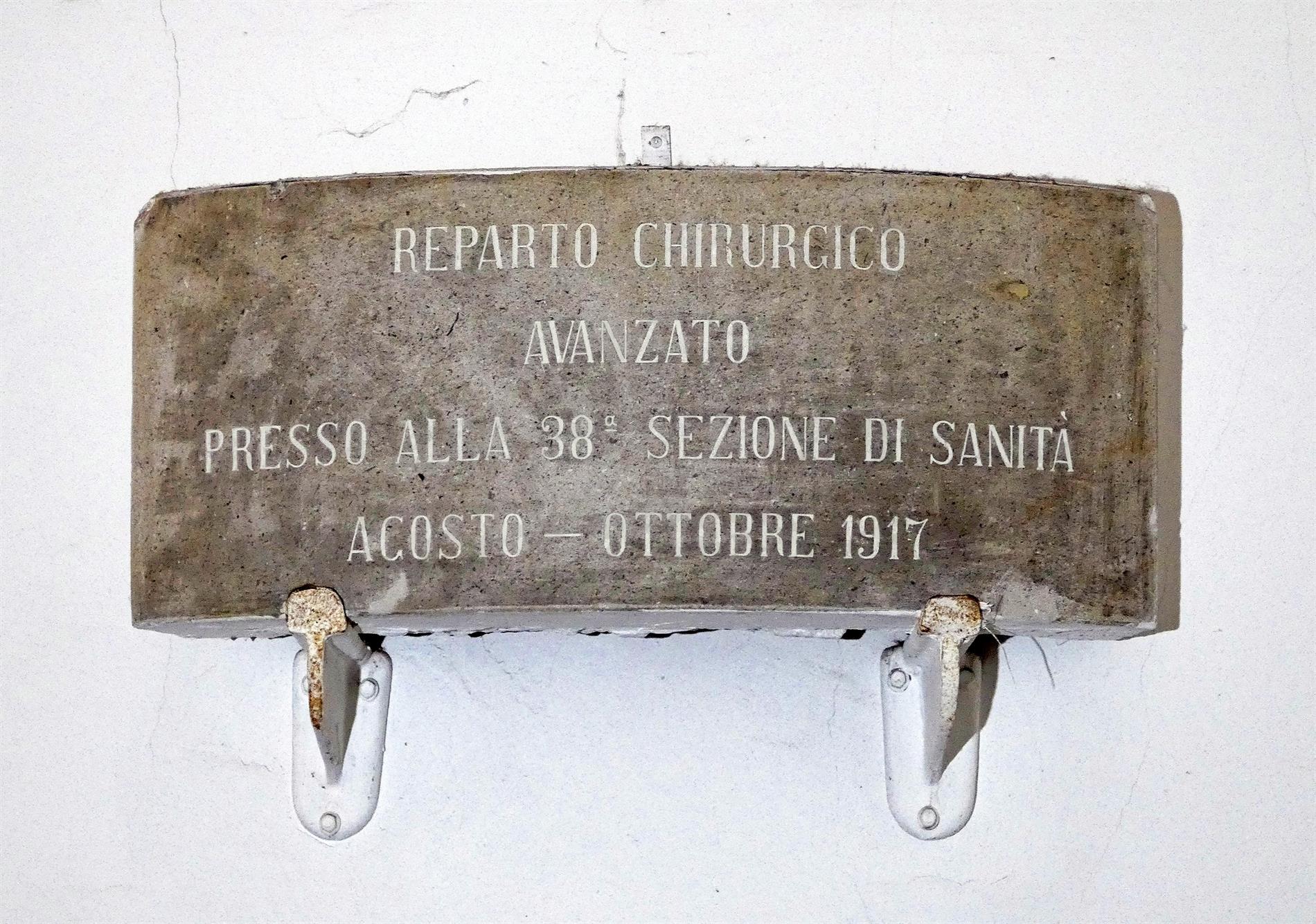 La targa indica la presenza di un Reparto Chirurgico Avanzato della 38ª Sezione di Sanità presso Villa Tositti a Gorizia tra agosto e ottobre 1917.