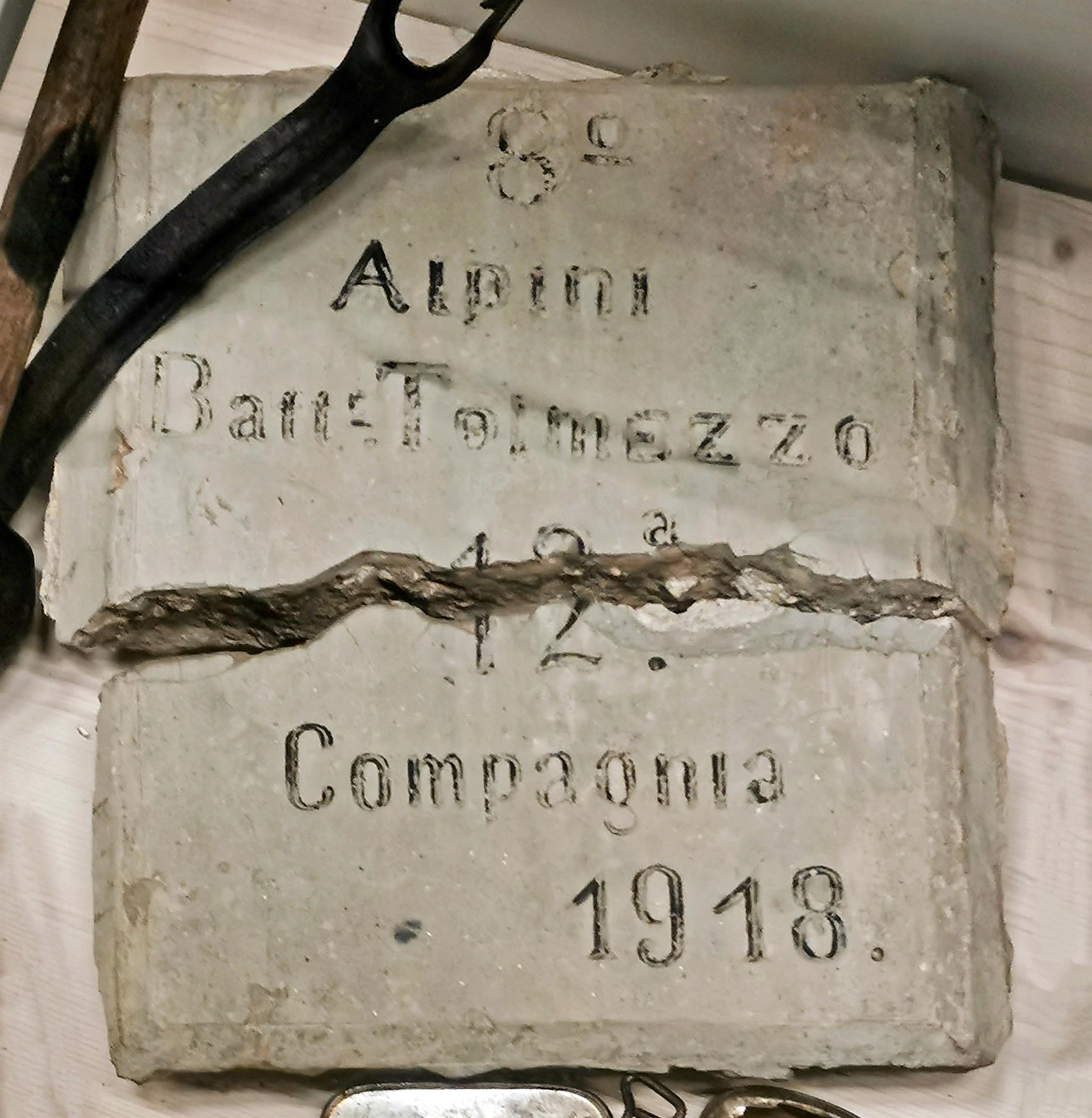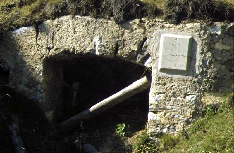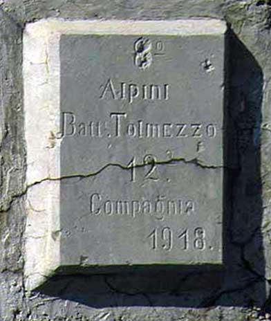 Targa originariamente posta dagli alpini della 12ª Compagnia del Battaglione Alpini Tolmezzo su un ricovero costruito alle spalle delle trincee italiane di prima linea, che dal versante meridionale di Cima Cadì scendevano verso il Passo del Tonale.