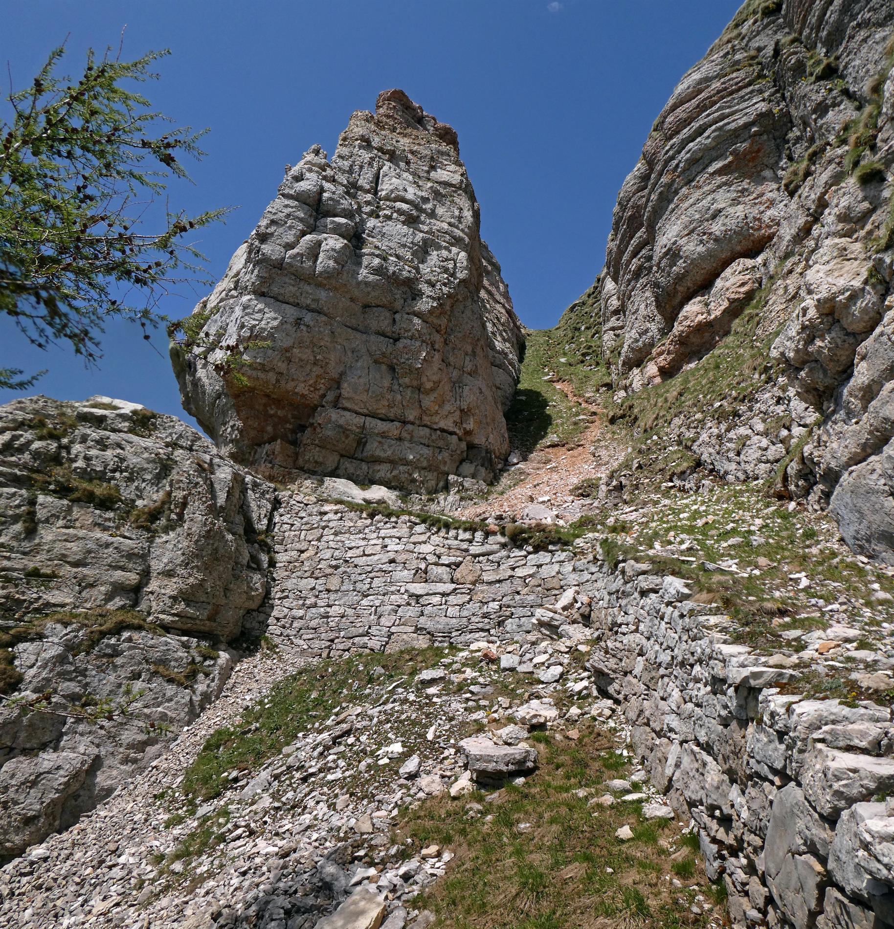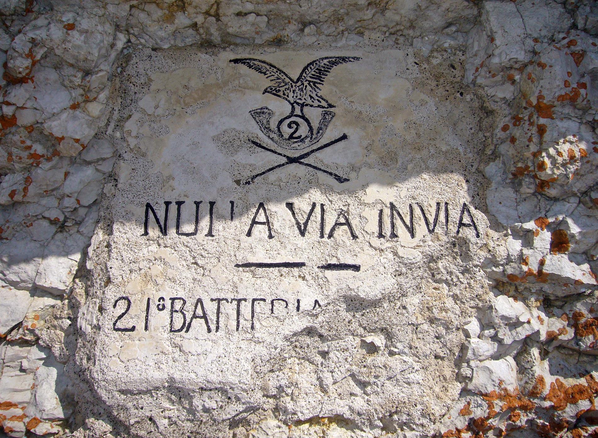 La targa presentata, eseguita dalla 21ª Batteria del 2° Reggimento Artiglieria da Montagna, è rinvenibile lungo un ardito camminamento scavato nella roccia del ripido versante sud del Col Santino, a picco sull’Alpe Pozze, dando così icastica testimonianza del motto reggimentale, per cui “nulla via invia” (nessuna via è inaccessibile).