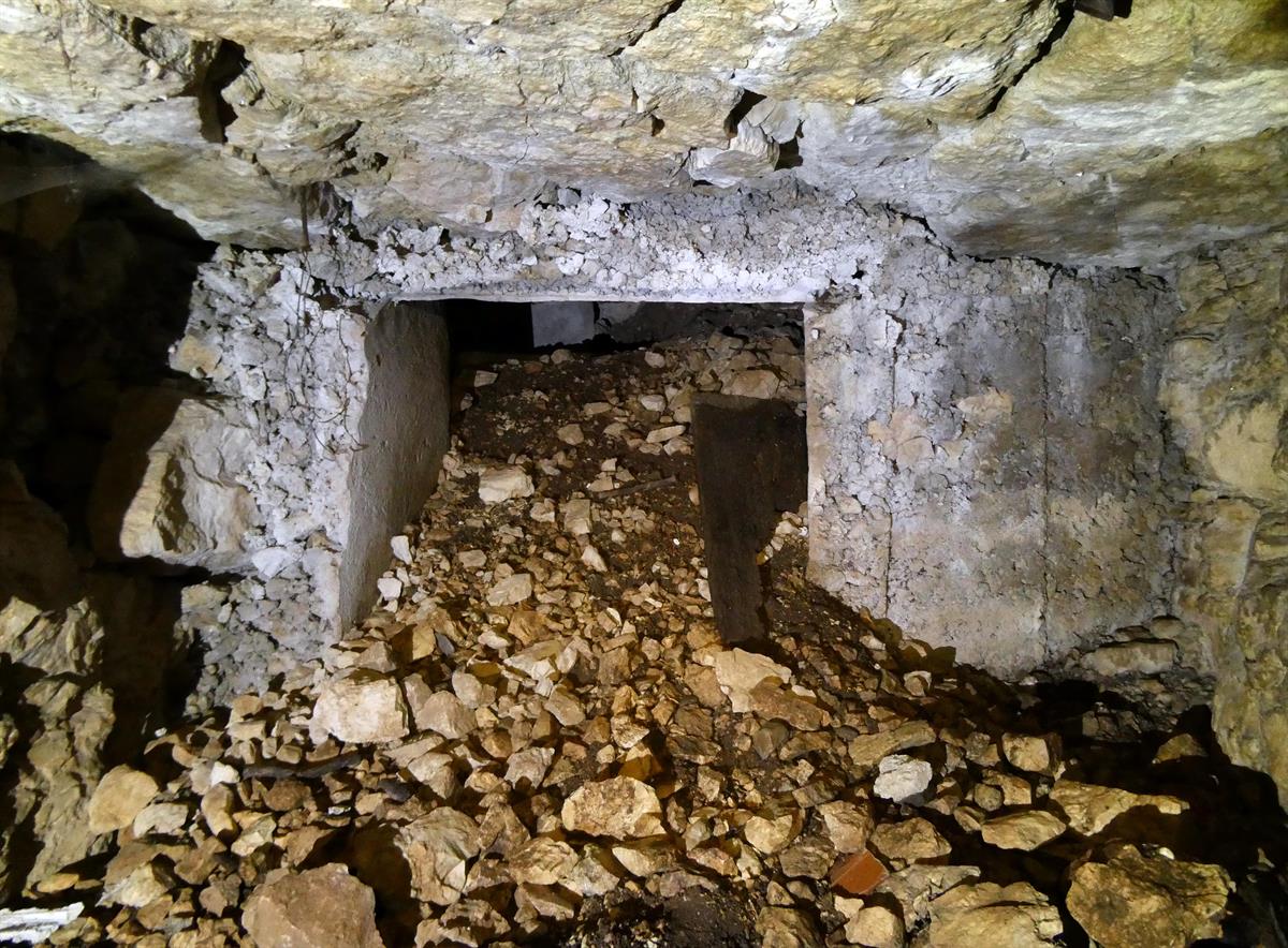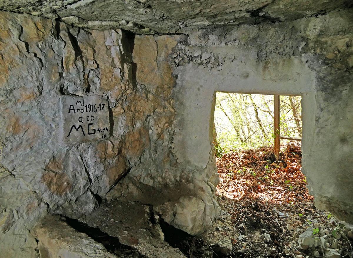 I contenuti della targa cod. 001442 affissa all'ingresso del sistema sotterraneo testimoniano come i mitraglieri dello "Hessenregiment", fra la seconda metà del 1916 e l'agosto del 1917, si siano alternati con altri reparti nel presidio della postazione; si evince, inoltre, come la stessa postazione incavernata sia stata costruita e ampliata in fasi diverse, atteso come nella presente targa siano citati gli anni 1916 - 1917, mentre nella targa cod. 001442 appaia specificata la frase "costruita nel maggio 1917" (evidentemente in riferimento a qualche specifica parte della postazione, che almeno in ragione di altri suoi settori già doveva esistere nel secondo semestre del 1916; altrimenti l'indicazione temporale apposta nella targa qui catalogata risulterebbe priva senso).